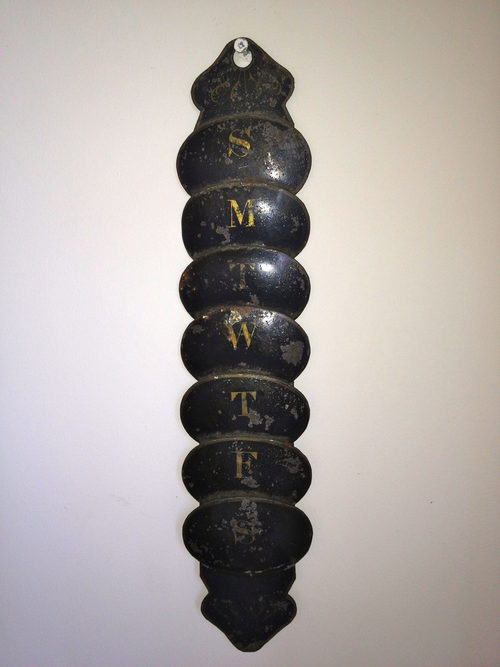 A late 19th century hanging ‘Japanned’ metal letter rack decorated with a slot decorated with the respective letter for each day of the week in gilt to the front.There is paint loss in areas and a few very small rust spots, but overall a good unusual piece.
