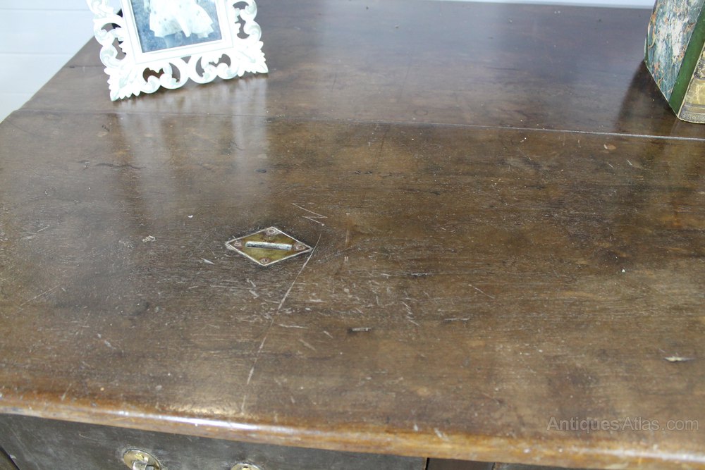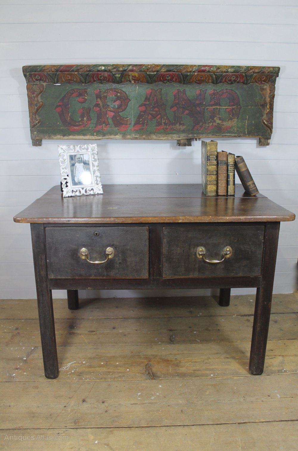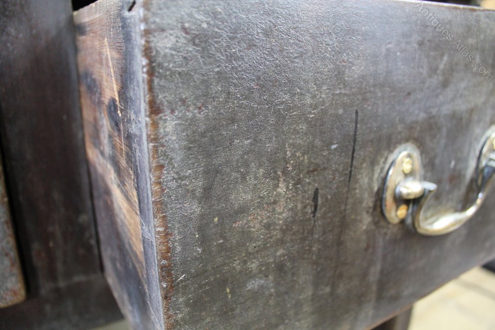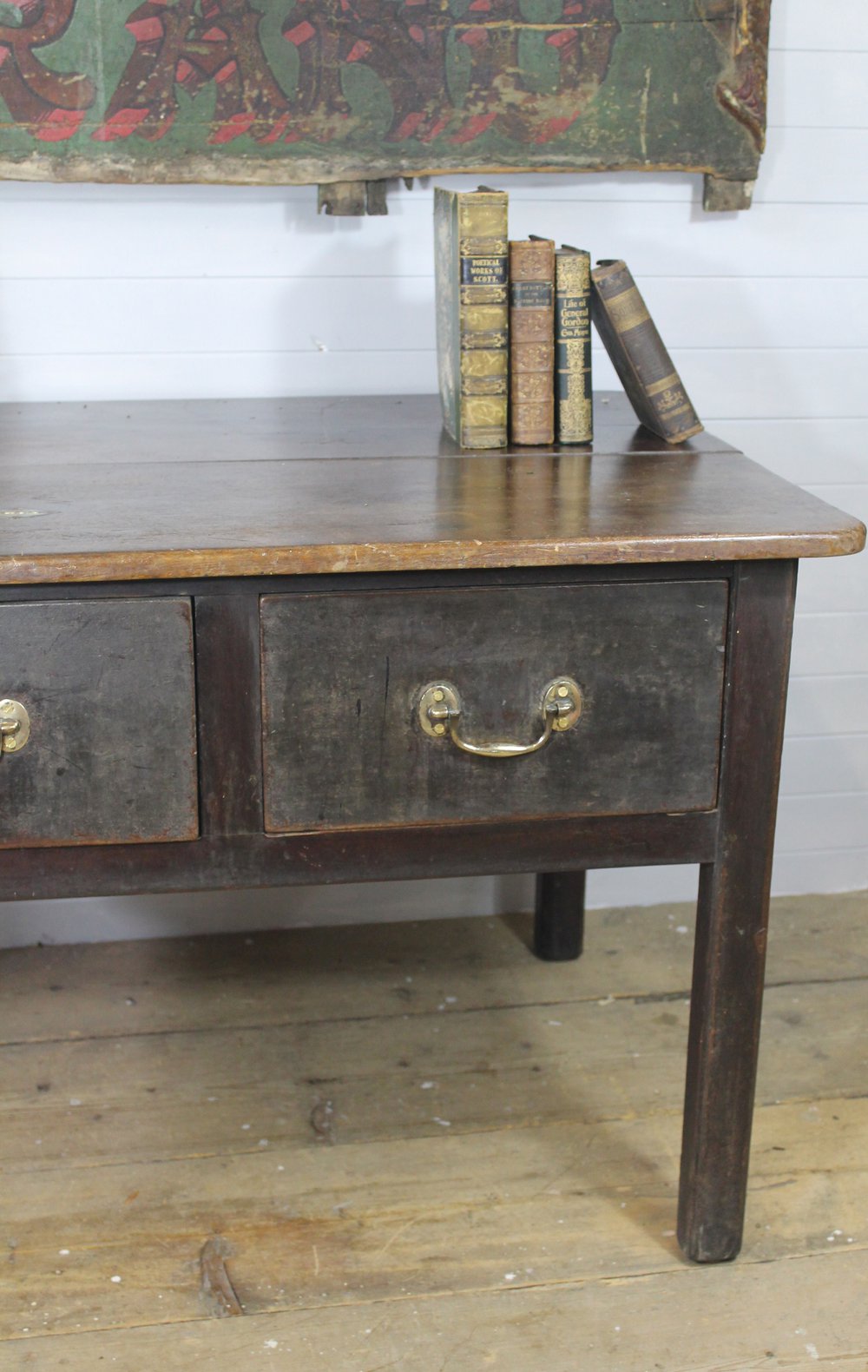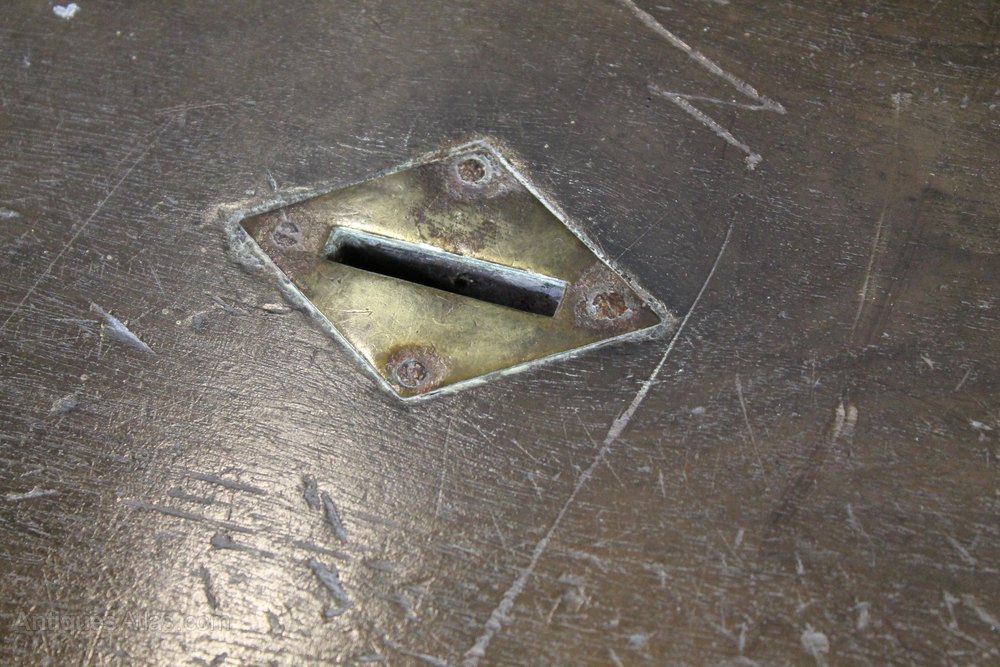 A rather attractive provincial 19th century shop table with two deep drawers. The brass handles are original (only being removed by us for cleaning) and the original indentation remains where they have knocked against the wood for many years. The top has a lovely rich colour and the base retains the original time worn paint. Inset into the top is a brass lozenge slot where money would have been dropped through into the once lockable drawer on the left.The table was possibly estate made with the back showing traces of having been adapted from an older drop leaf table. There are marks and stains on the top consistent with age and daily use of the table.