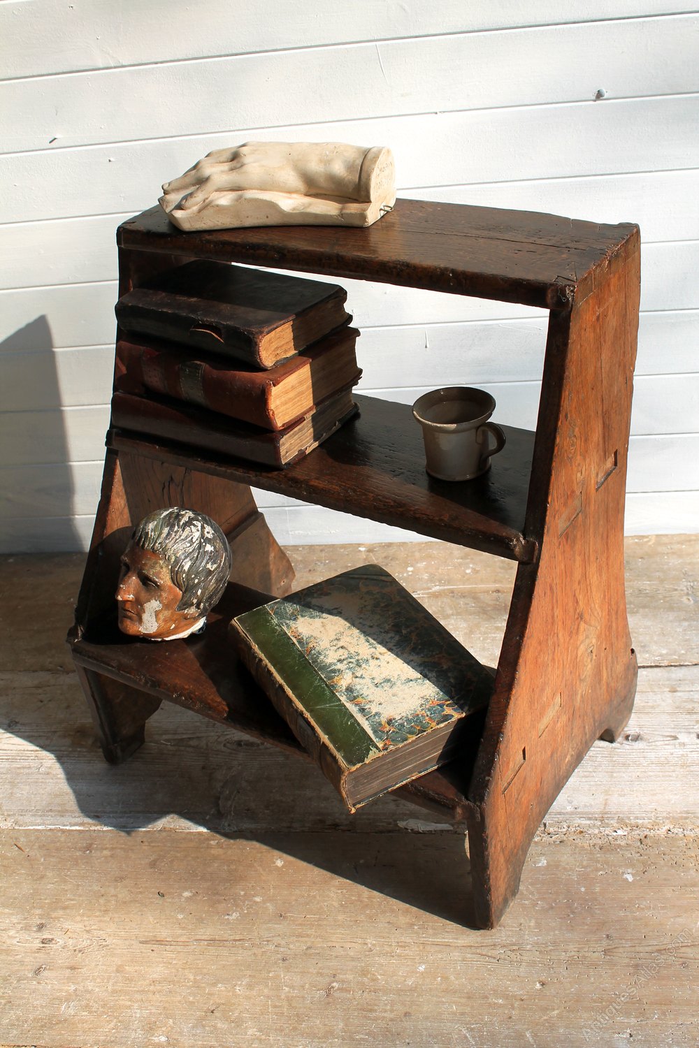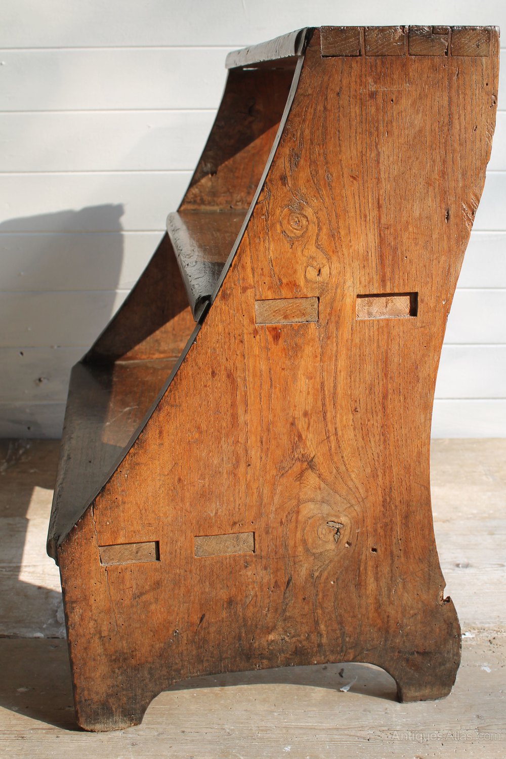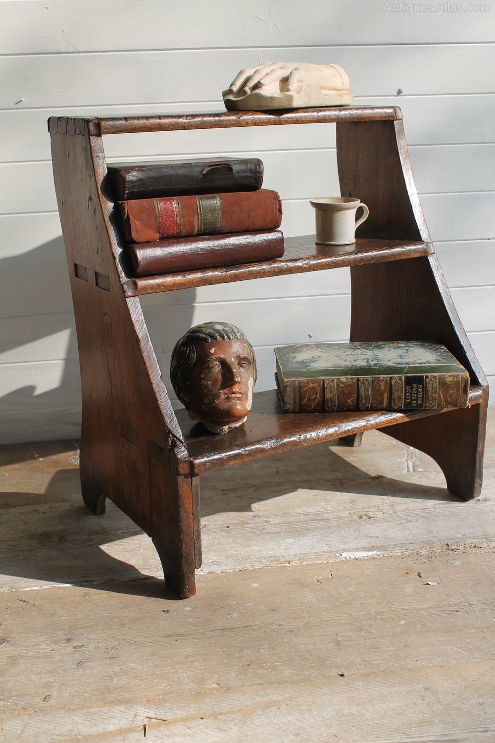 A provincial set of Georgian steps dating to around 1800-1820. The colour and patination are very good and there are some lovely features, from the through joints to the dovetail joints. There is an honest repair but these are really a lovely little set of oak and elm steps from the early 19th centuryMeasuring 50cm wide, 57cm high, 35 cm deep.
