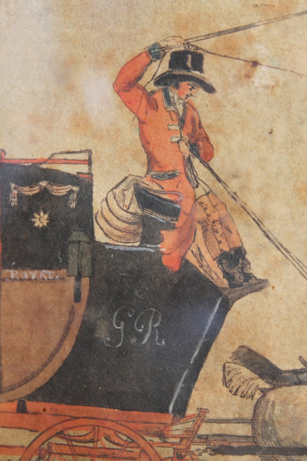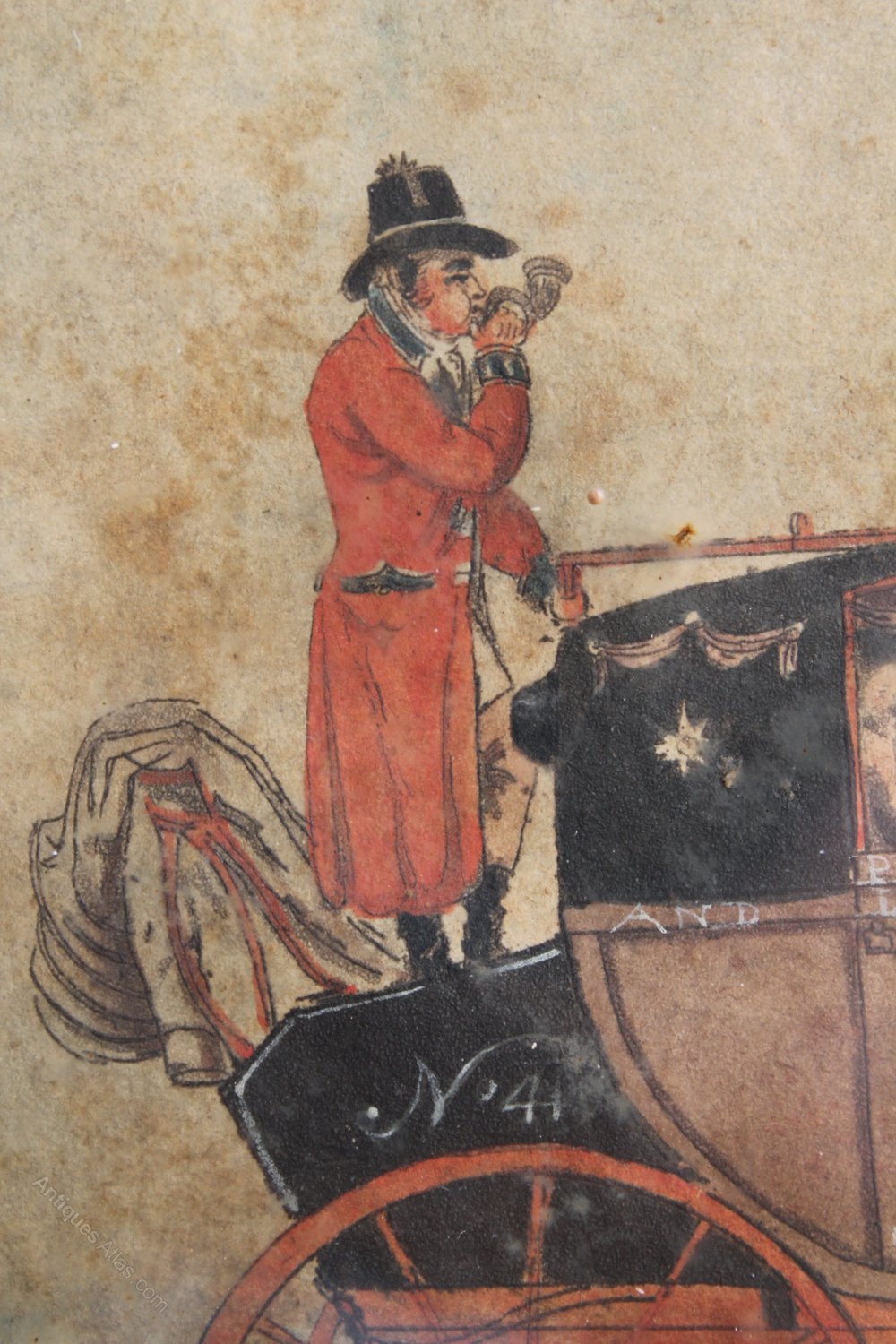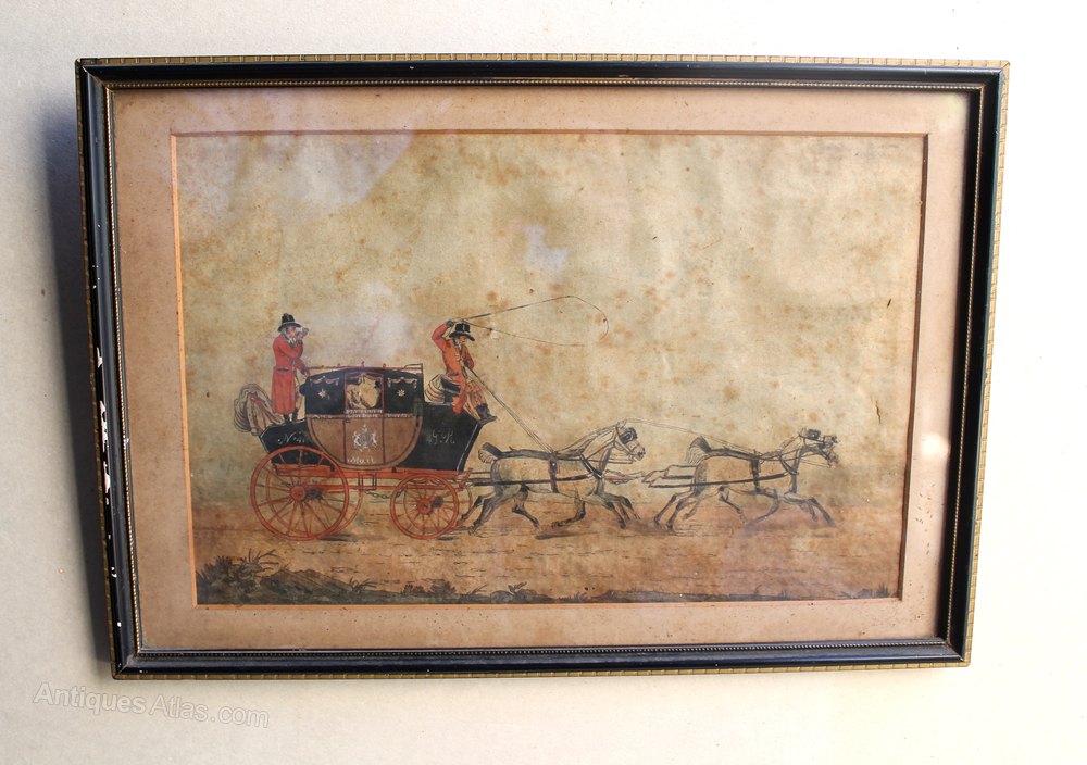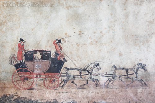 A rare Geroge III period pen ink and watercolour of the Plymouth to London Mail coach with carriage number and royal crest displayed. The coachmen are beautifully detailed although the passengers are in the shadows. This should be of little surprise as, as happens very rarely, the coachmen are named to the back of the painting as Jas Pollard (back) and R. Howell (front), This is unusual but explains the level of detail shown in the two men. The detail and accuracy of the coach and horses really is very good.A beautifully detailed study.