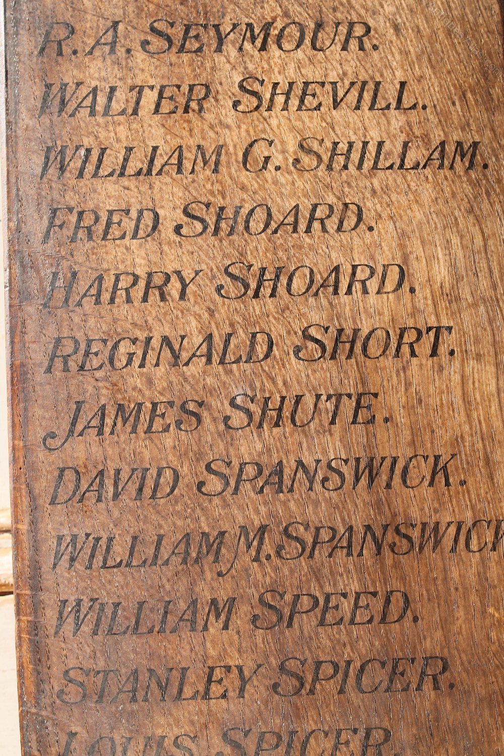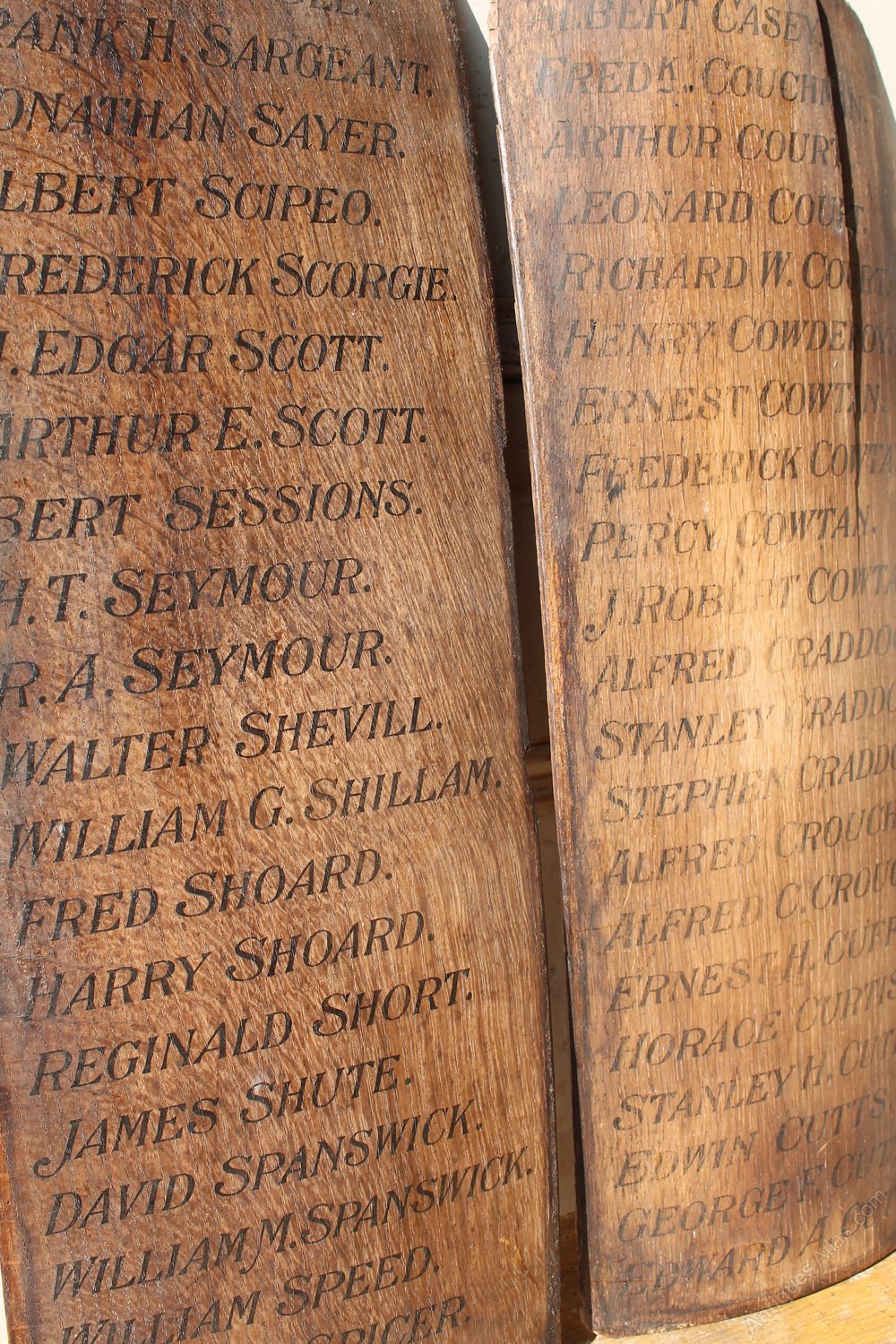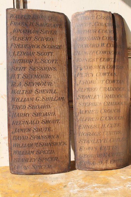 An unusual pair of 17th c oak panels, with 19th century inscriptions listing boys or men’s names. Why William G. Shillam has his name alongside William M. Spanswick is, perhaps, lost to history but these warped oak panels are wonderfully decorative.Measuring 54cm x 20cm