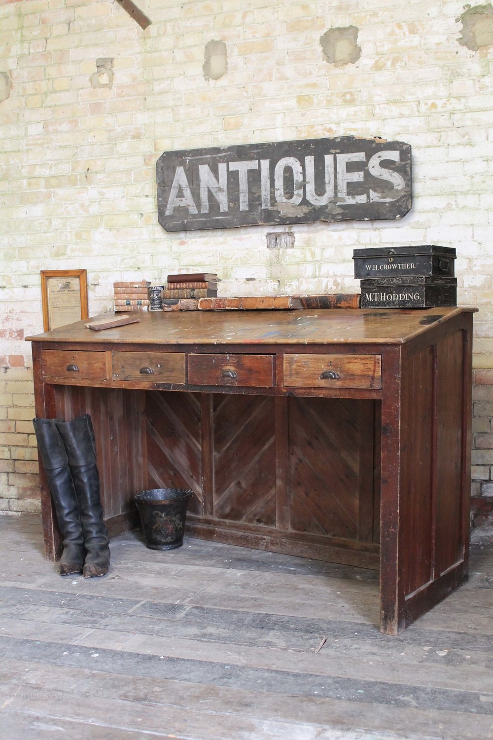 Built during the 1860s at the height of the Cornish mining boom, the Count House at Botallack stands on the cliffs near the Crowns Mine. It was the hub of the day-to-day running of the mine and also where the miners collected their pay. The desk would have been used by the clerks preparing and handing out the miner's pay. The Count House was built in the 1860s and the mine closed in 1895. Botallack recently featured in the filing of the BBC drama series Poldark.The large desk has an elm top and solid pitch pine base with four drawers. The slope to the desk has obvioulsy proved useful and now has patches of paint on the top where it has been used as an artist.