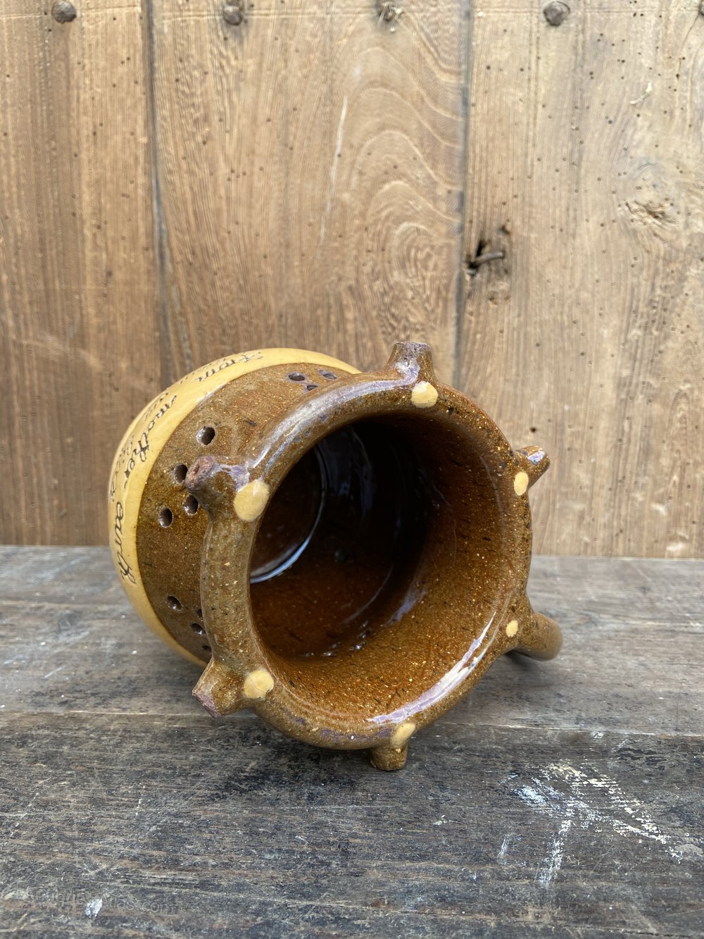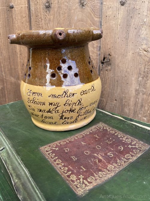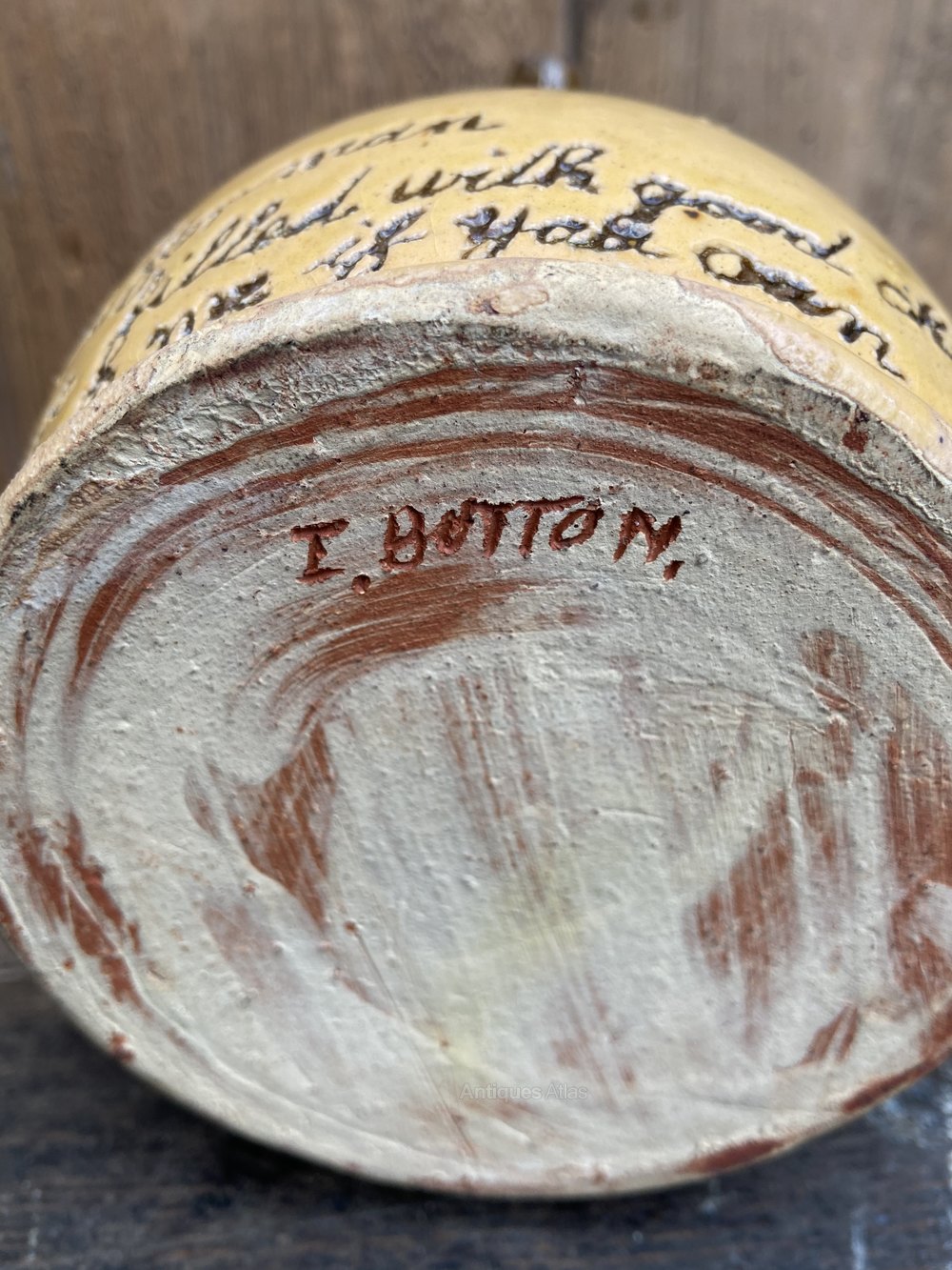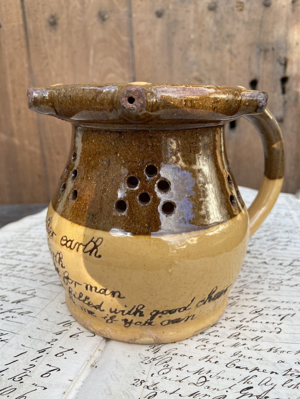An early 20th century slipware puzzle jug by Isaac Button of Halifax. The jug is signed by Button to the base.The wirting to the front reads: