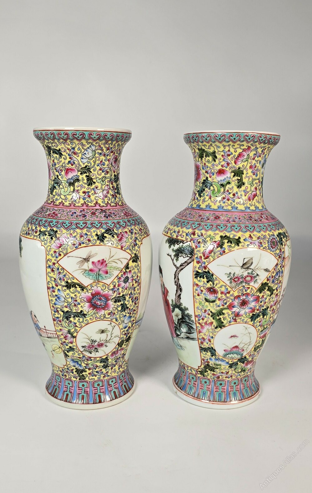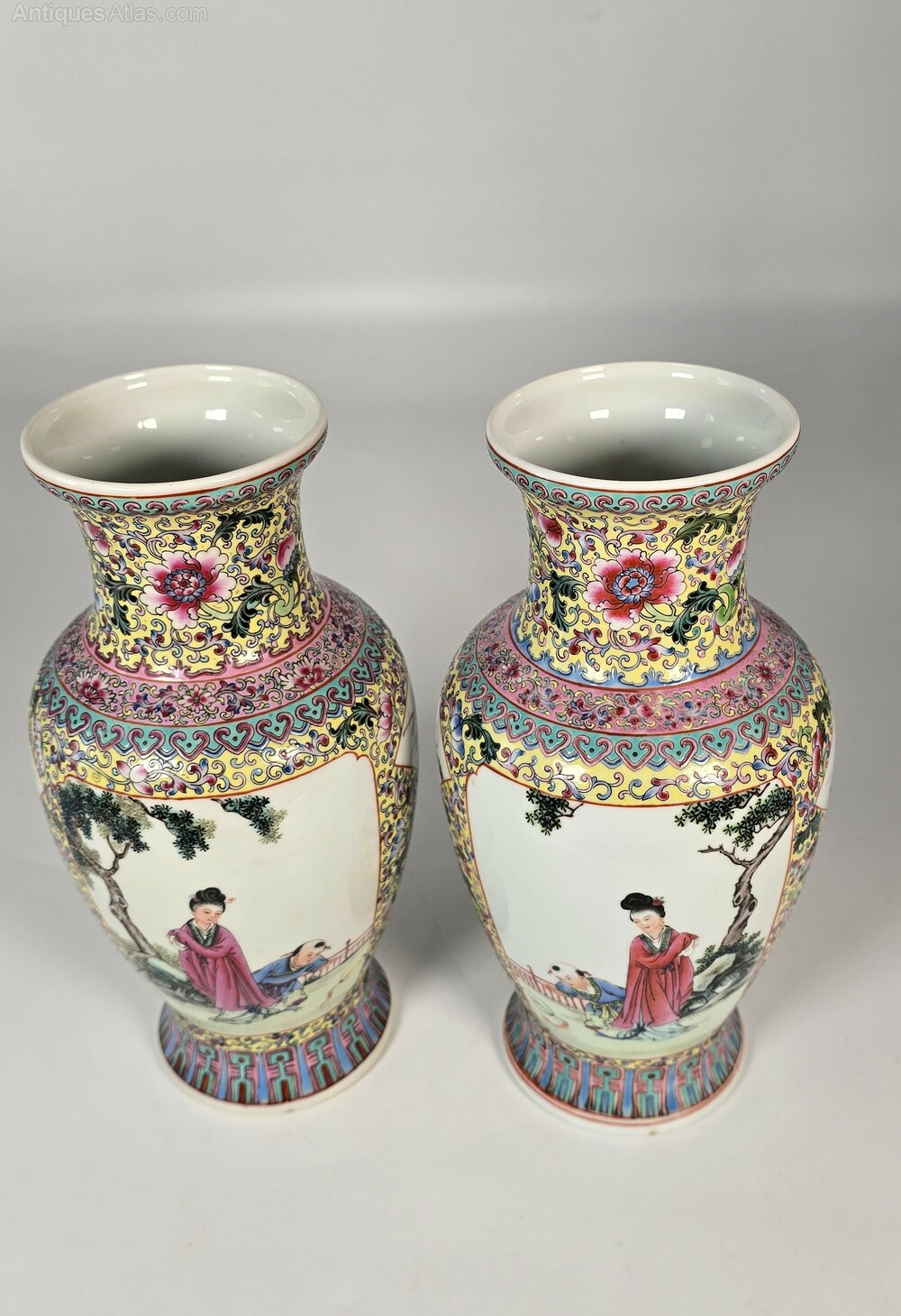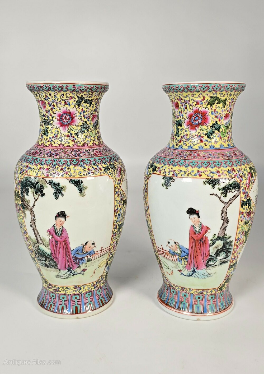 This beautiful and high quality pair of Chinese hand painted and enamelled porcelain vases are from the Republican period, early to mid 20th century.These superb hand painted and richly famille jaune enamelled pair of vases are highly detailed with six hand painted panels on each vase. The large front and reverse panels show a mother and her young son playing with a kite or balloon. (The painted images are reversed, making the vases true left and hand righted pair).