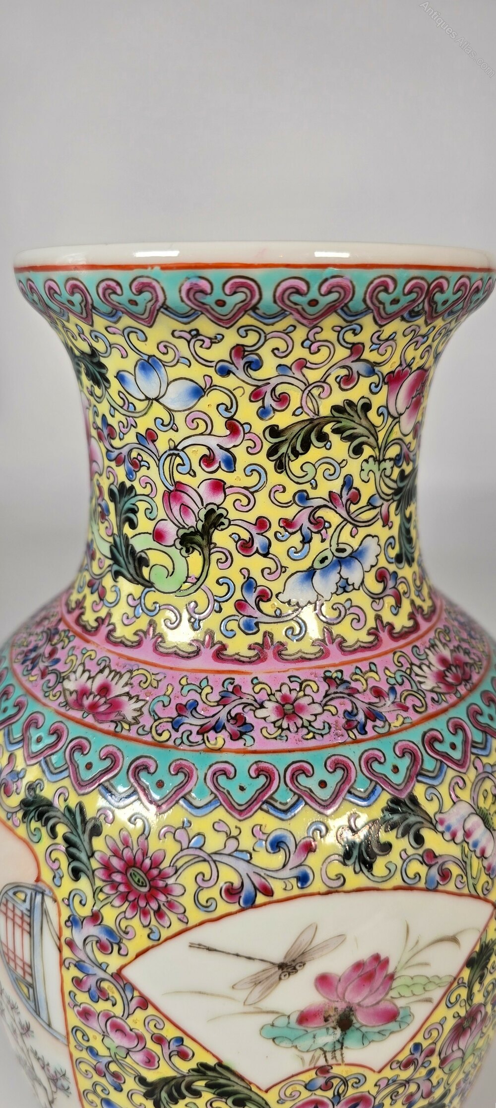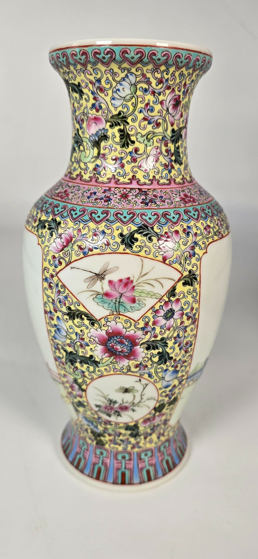 The sides of each vase have two panels with insects and flora.