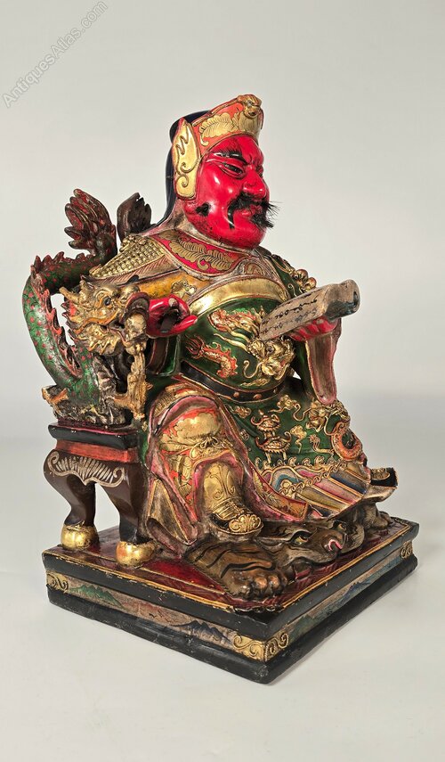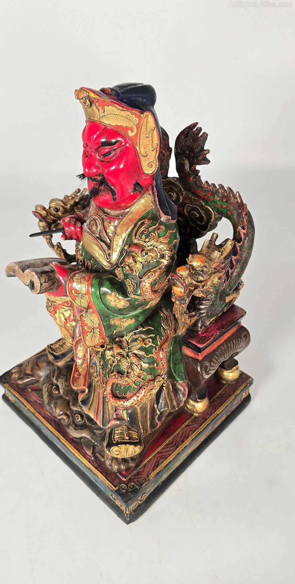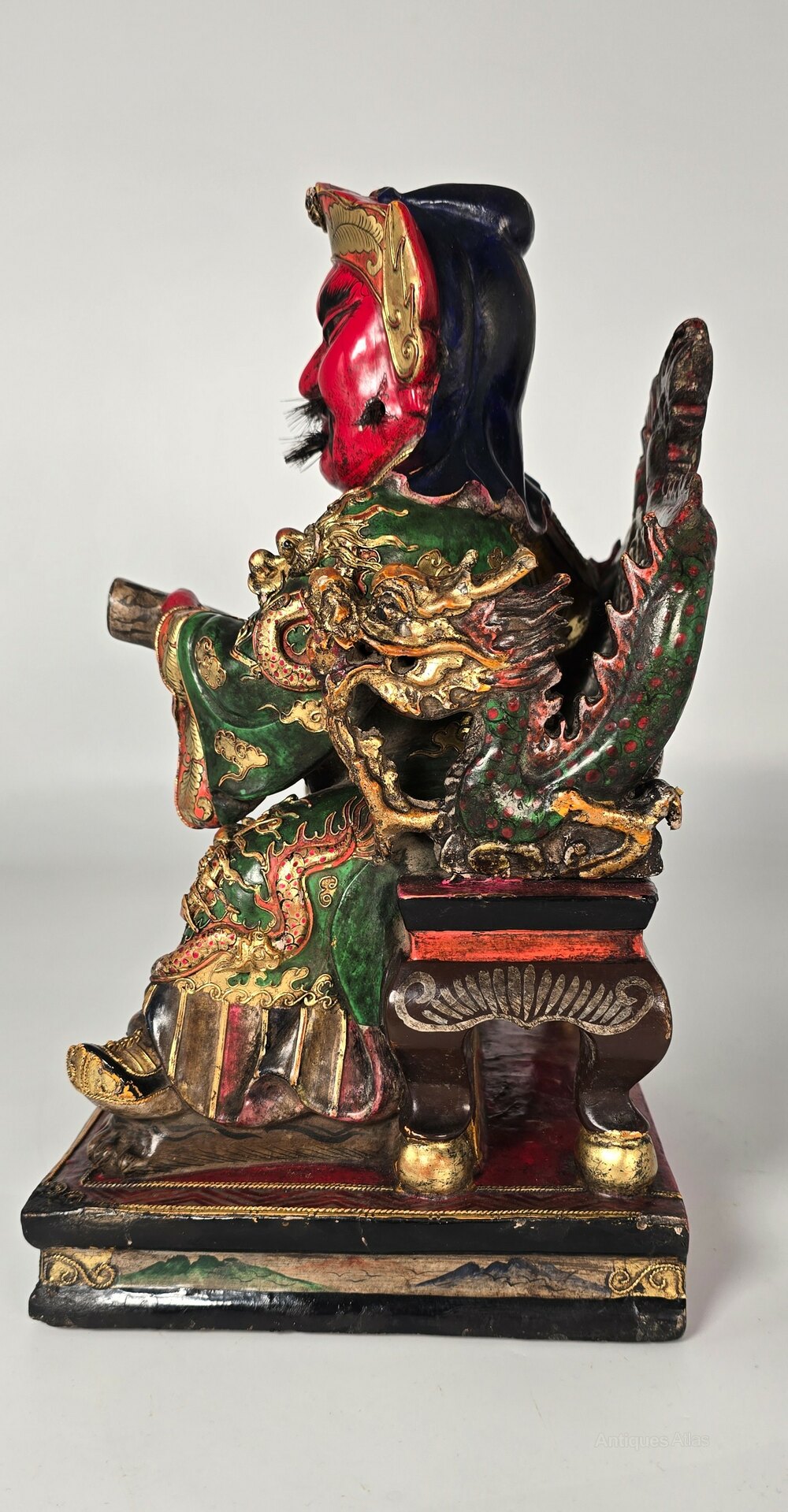 This highly decorative Chinese hand carved solid wood and gesso figure which is raised on a moulded plinth, depicts a Chinese nobleman. He has a book in one hand and a page turning implement in the other. The man is sitting on an ornate dragon backed throne chair whilst his feet rest on a tiger skin rug. He is wearing the most elaborate armour with a decorative robe, headdress and boots. His face and hands are painted in a bold red colour with fine black detailing. He also has facial whiskers inlaid in horse hair.The figure has been very well carved out of a solid block of dense hardwood with some detailed elements applied and detailed in gesso, all of which has been hand finished in smooth lacquer in polychrome colours with some elements enhanced with gilding.