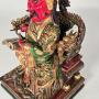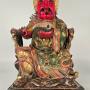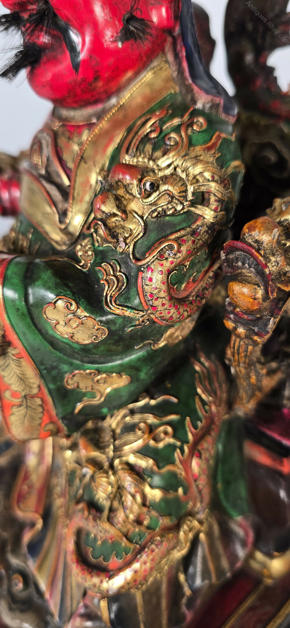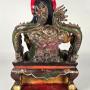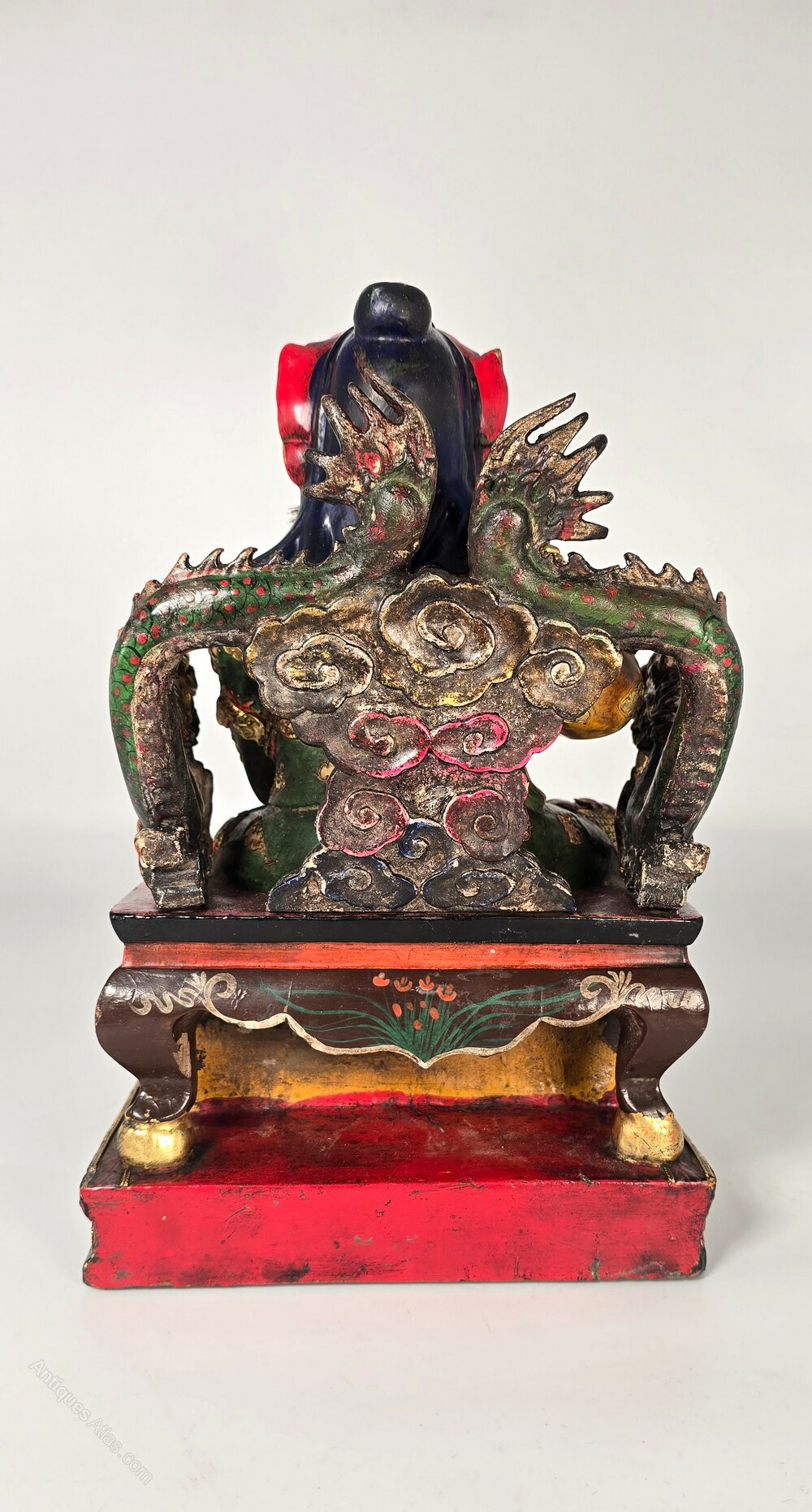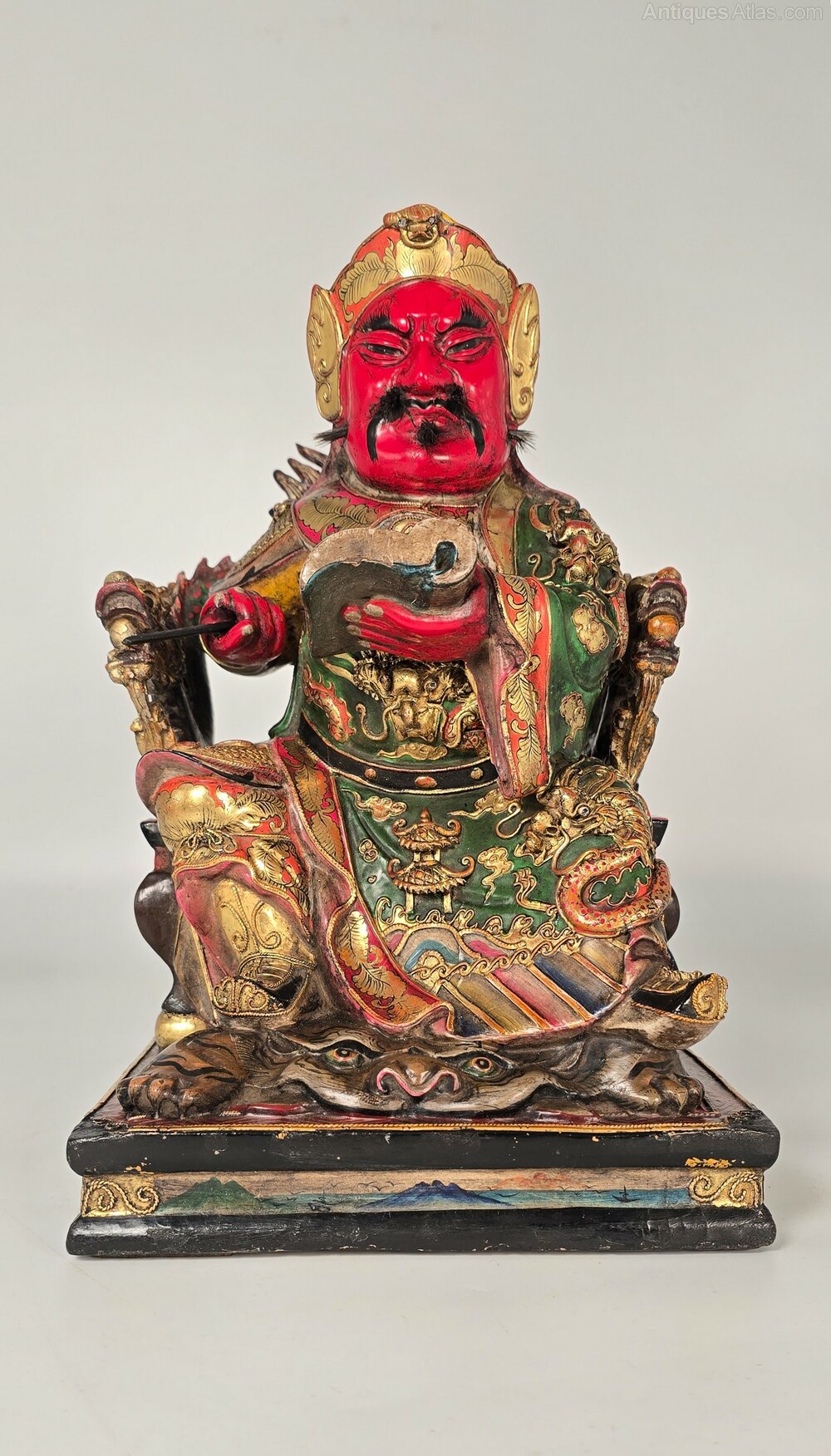 This highly decorative Chinese hand carved solid wood and gesso figure which is raised on a moulded plinth, depicts a Chinese nobleman. He has a book in one hand and a page turning implement in the other. The man is sitting on an ornate dragon backed throne chair whilst his feet rest on a tiger skin rug. He is wearing the most elaborate armour with a decorative robe, headdress and boots. His face and hands are painted in a bold red colour with fine black detailing. He also has facial whiskers inlaid in horse hair.The figure has been very well carved out of a solid block of dense hardwood with some detailed elements applied and detailed in gesso, all of which has been hand finished in smooth lacquer in polychrome colours with some elements enhanced with gilding.