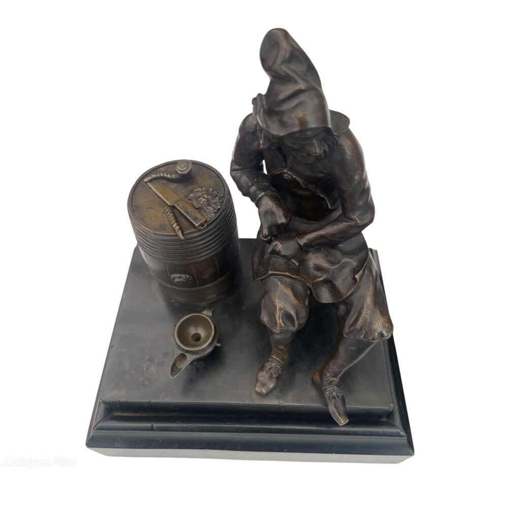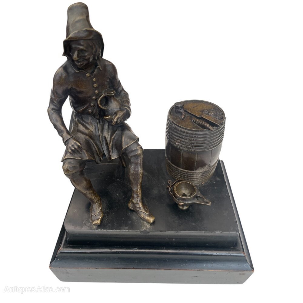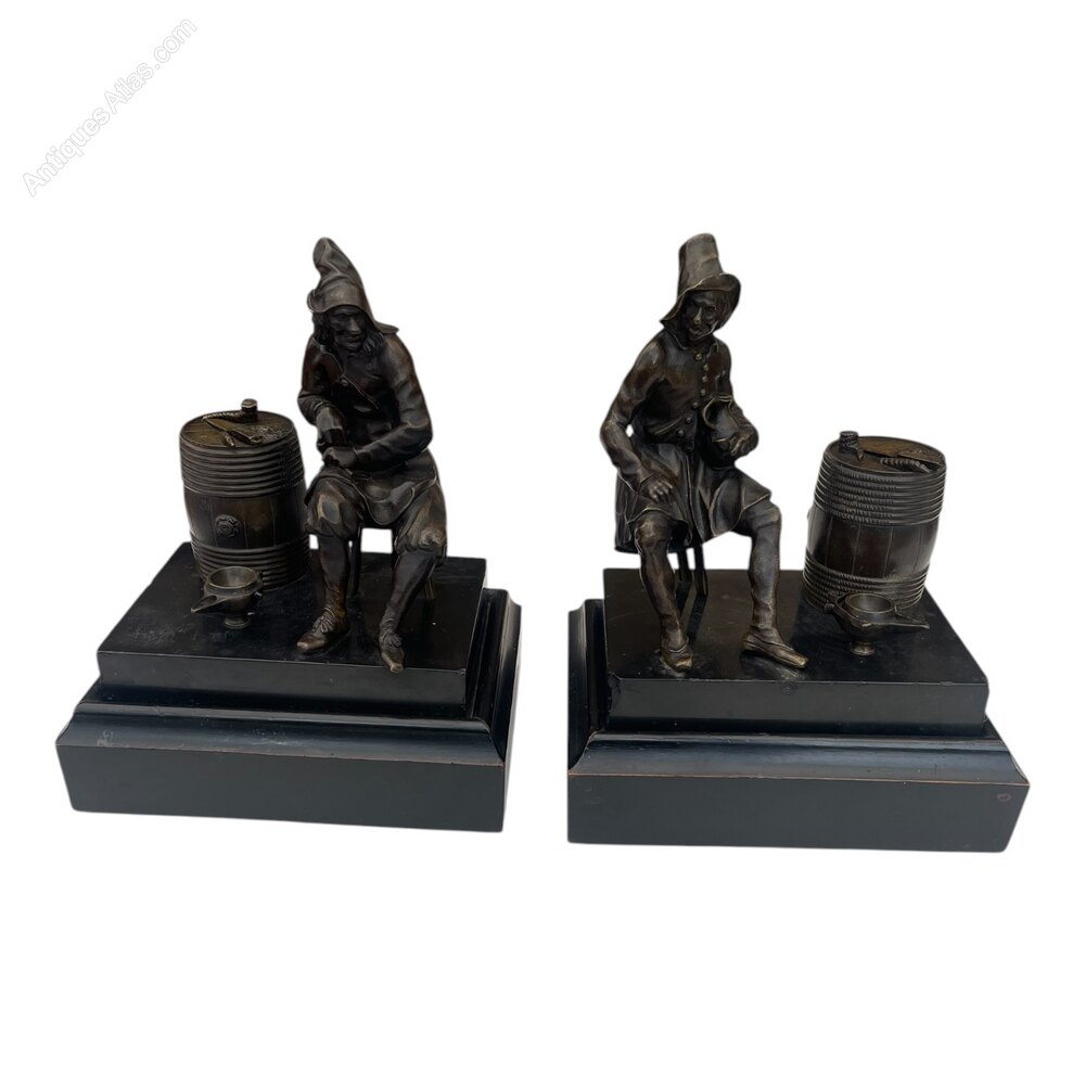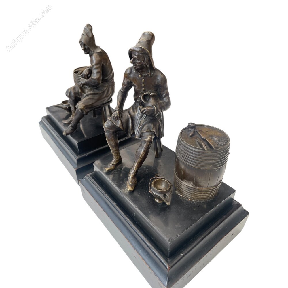 A pair of 19th century French bronze gentleman figures on a marble plinthmodelled as males seated holding their pipes with barrel, the lids are removable and oil lamp. 23 cm Height x 18 cm Width, depth 13cms