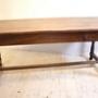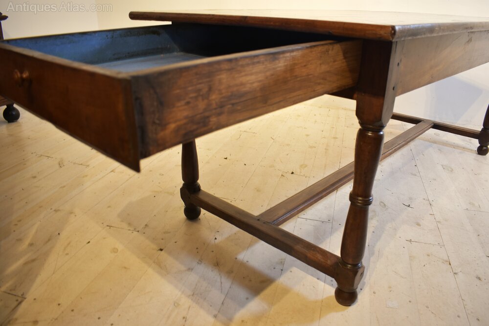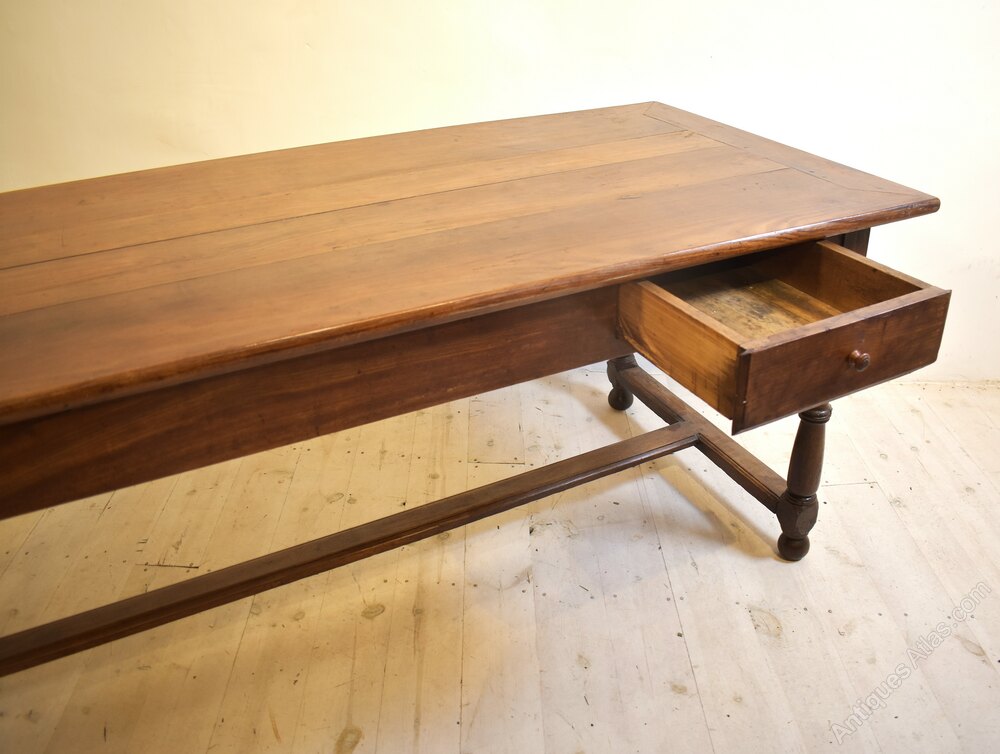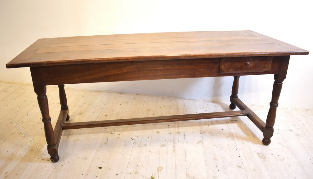 French cherry wood table with a lovely colour and strecher base having two drawers and turned legs. This table is made around 1830 and is of peg constuction. The frieze height is 23.5" so there is plenty of leg room. A lot of tables of this type were from Normandy. Altogether a useful and practical antique.Measurements: 194cm long x 84cm x wide 60cm high (76.5" x 33" x 30")