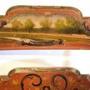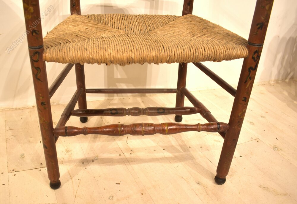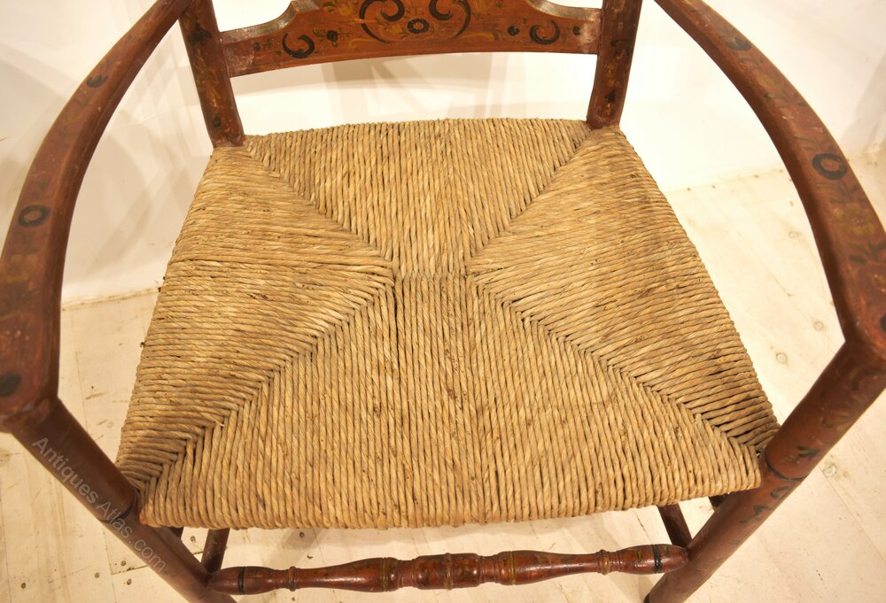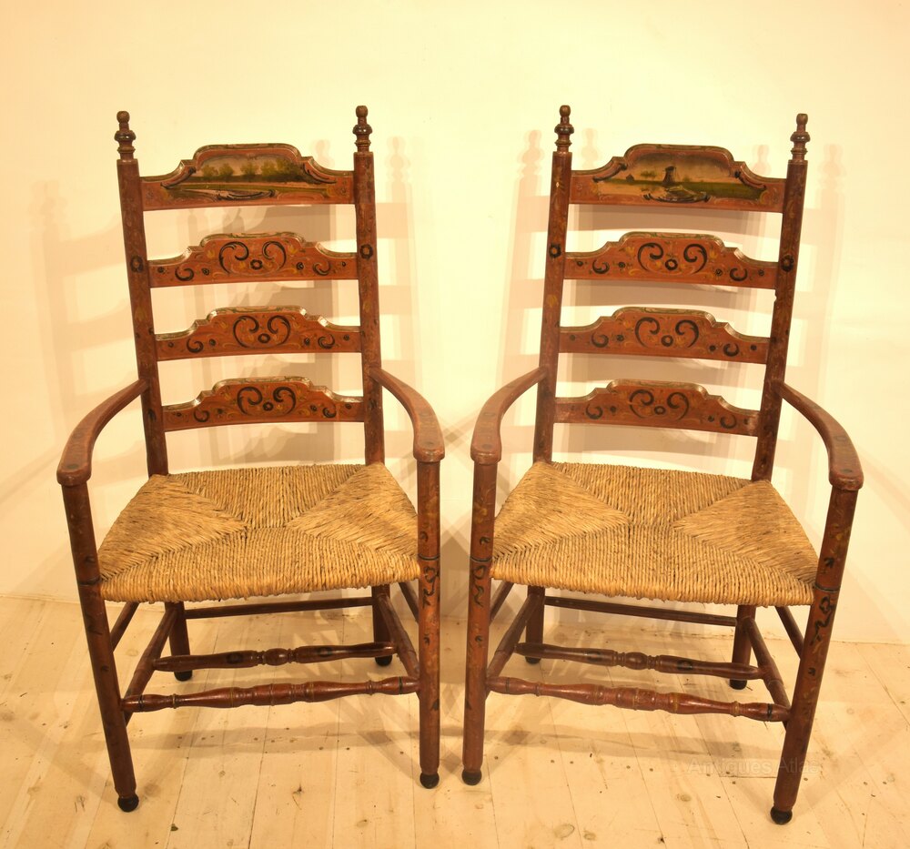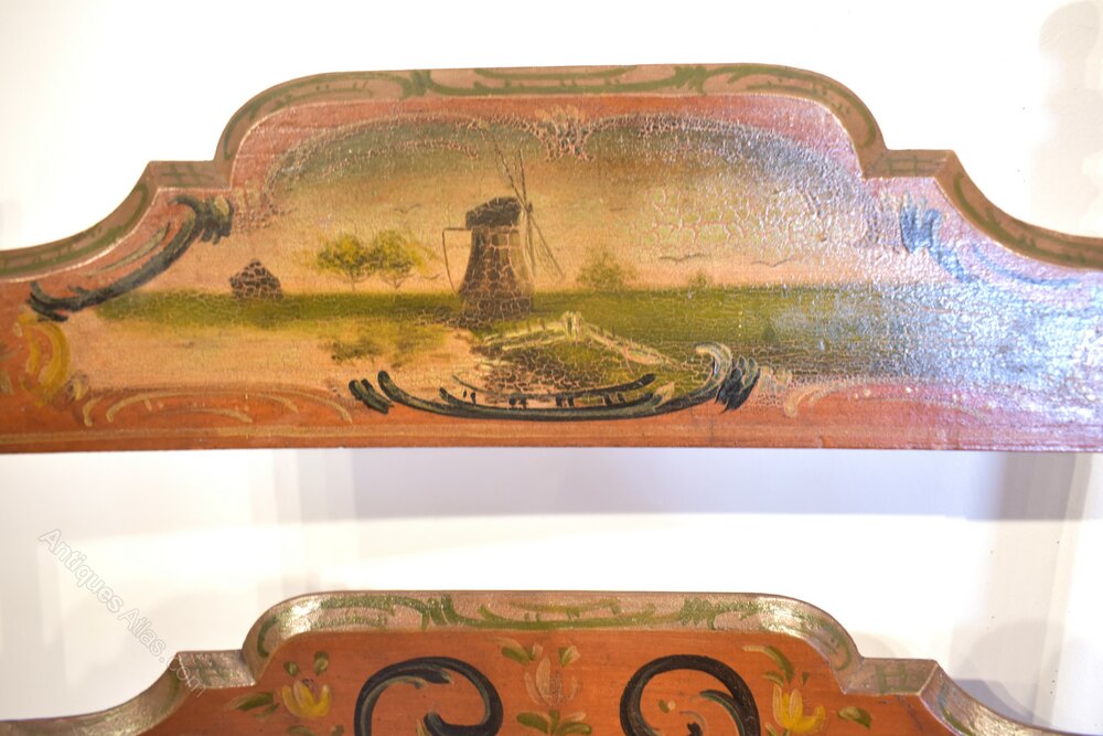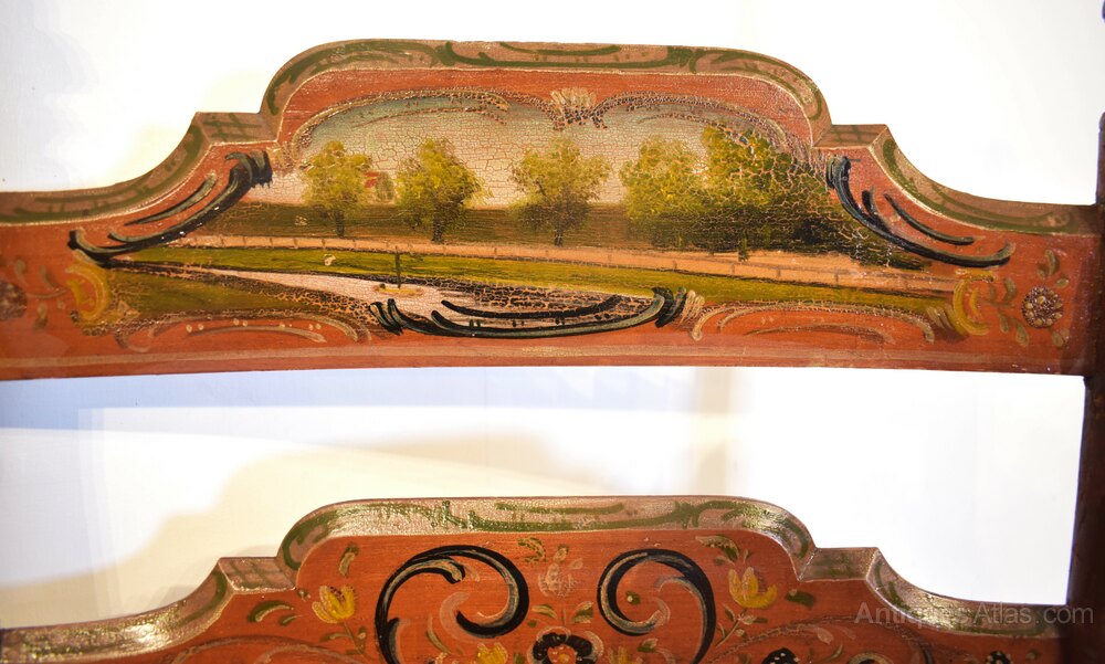 Dutch painted armchairs in pinky red paint with patterns and Dutch scenes. The rush seats are in good condition, made around 1840 these are quite delicate looking decorative chairs.Measurements:112cm High x 59cm Wide x 46cm Deep (44" x 23" x 18")