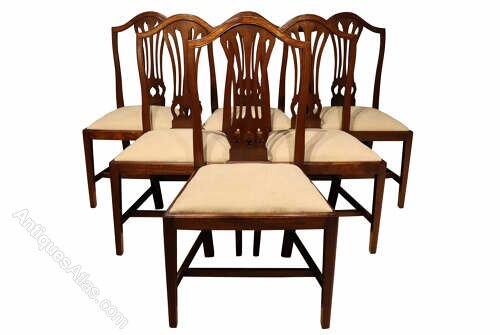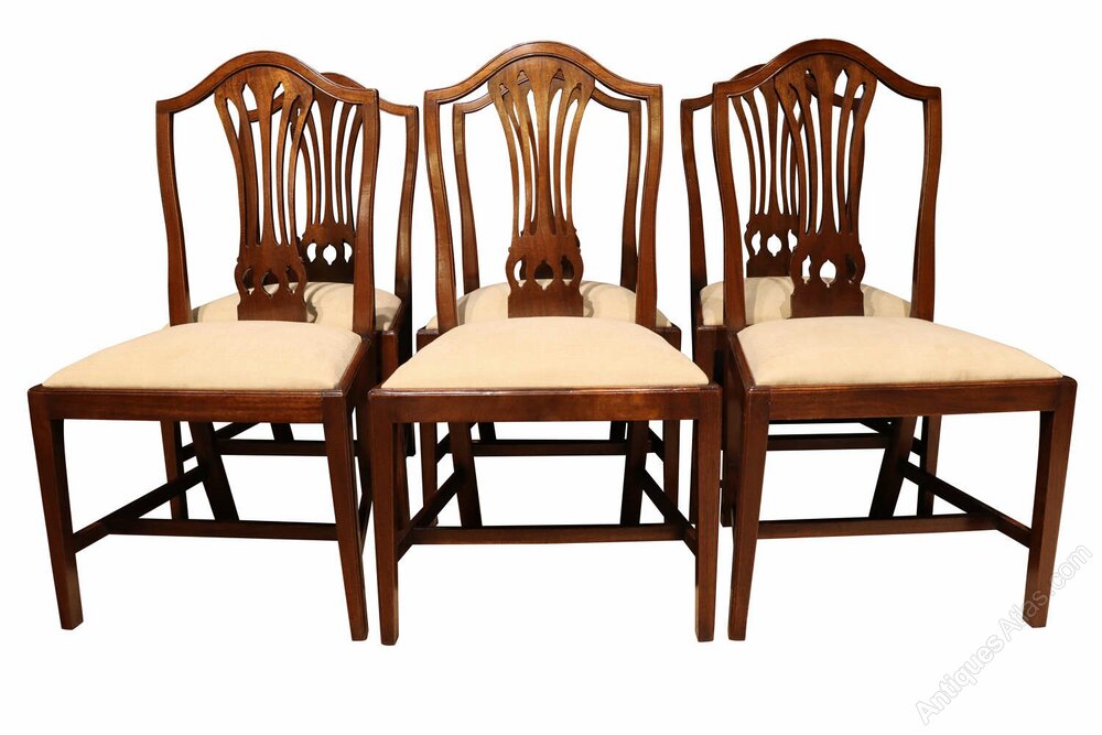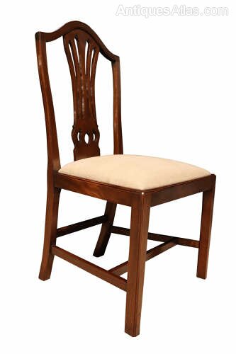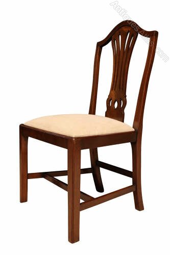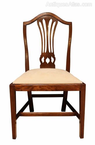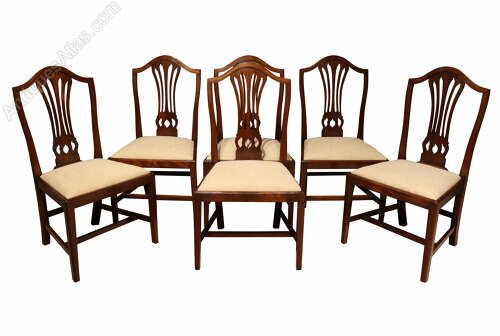 A fine and well-proportioned set of six George III mahogany dining chairs, English, circa 1800, in the Hepplewhite taste.Each chair features an elegant shield-shaped back with a finely pierced and carved splat . The frames are raised on square, tapering legs united by stretchers, giving the chairs a refined and well-balanced stance.