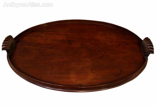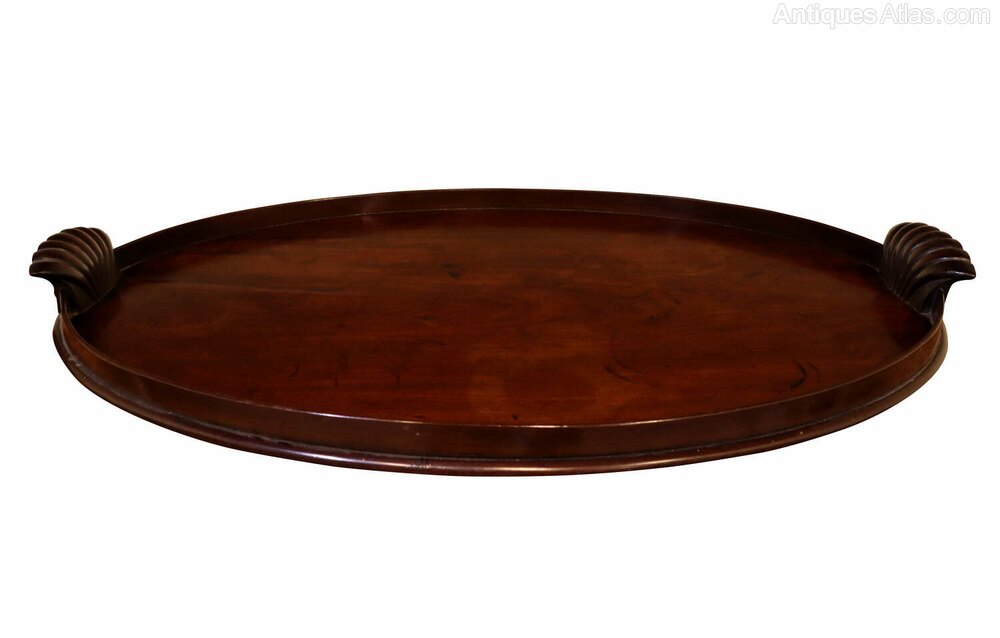 A top quality early Georgian mahogany serving tray, English, circa 1740. Of generous oval form, the tray is beautifully shaped with a raised gallery edge and retains its finely carved integral handles, each crisply detailed with fluted scroll terminals. The tray is cut from well-figured mahogany of rich colour and depth, showing excellent patination and surface character developed over time.The proportions are particularly pleasing, and the simplicity of the design allows the quality of the timber and craftsmanship to speak for itself. The surface displays honest signs of age consistent with use, further enhancing its authenticity and appeal.
