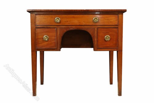 A Georgian mahogany lowboy dating from around 1800, displaying pleasing proportions and excellent colour throughout. The rectangular top retains a rich, warm patina, with attractive figuring to the mahogany and gentle surface wear consistent with age and use.The arrangement of three drawers comprises a long central drawer above two shorter drawers, each fitted with original brass ring handles on circular backplates. The drawers are well constructed, with visible dovetailing, and offer useful storage while maintaining the piece’s elegant symmetry. Below, a shaped central apron adds refinement and visual interest, framing the knee space in a classic Georgian manner.