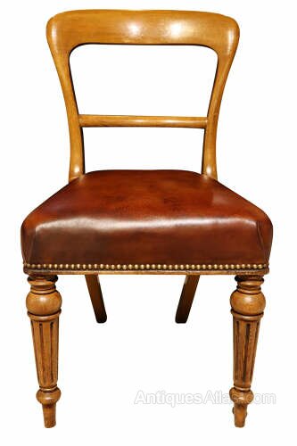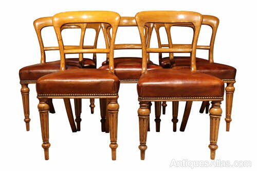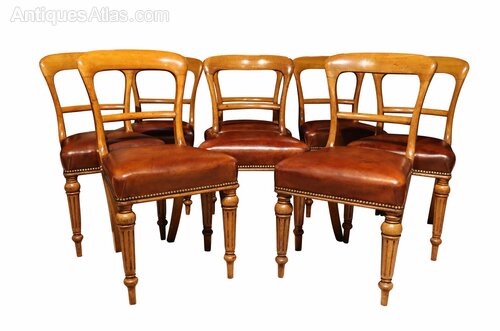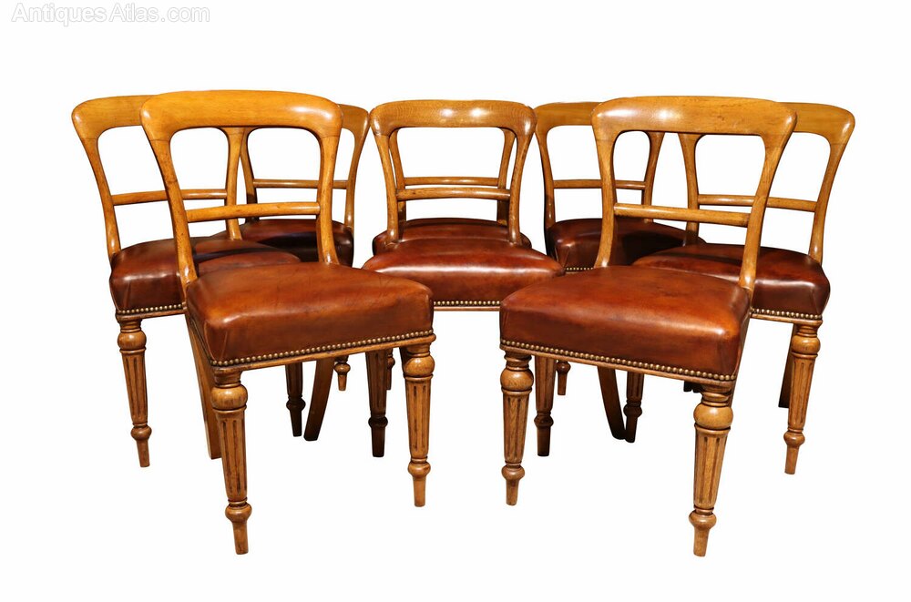 A fine and substantial set of eight mid-19th century Scottish dining chairs in beautifully patinated golden oak, stamped John Taylor & Son, Edinburgh, and dating to circa 1860.The chairs feature shaped open backs with gently curved top rails and well-proportioned uprights, displaying the restrained yet refined craftsmanship associated with leading Scottish cabinetmakers of the period. The turned and fluted front legs provide both strength and visual interest, while the overall proportions offer excellent comfort and balance.
