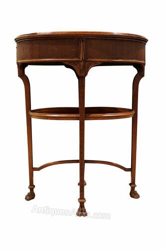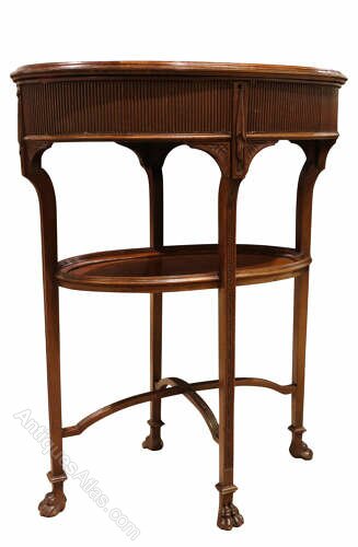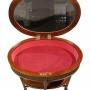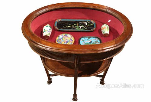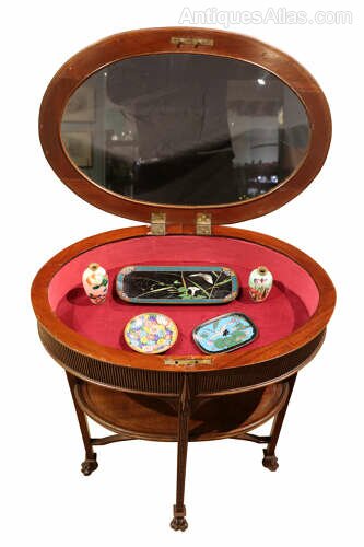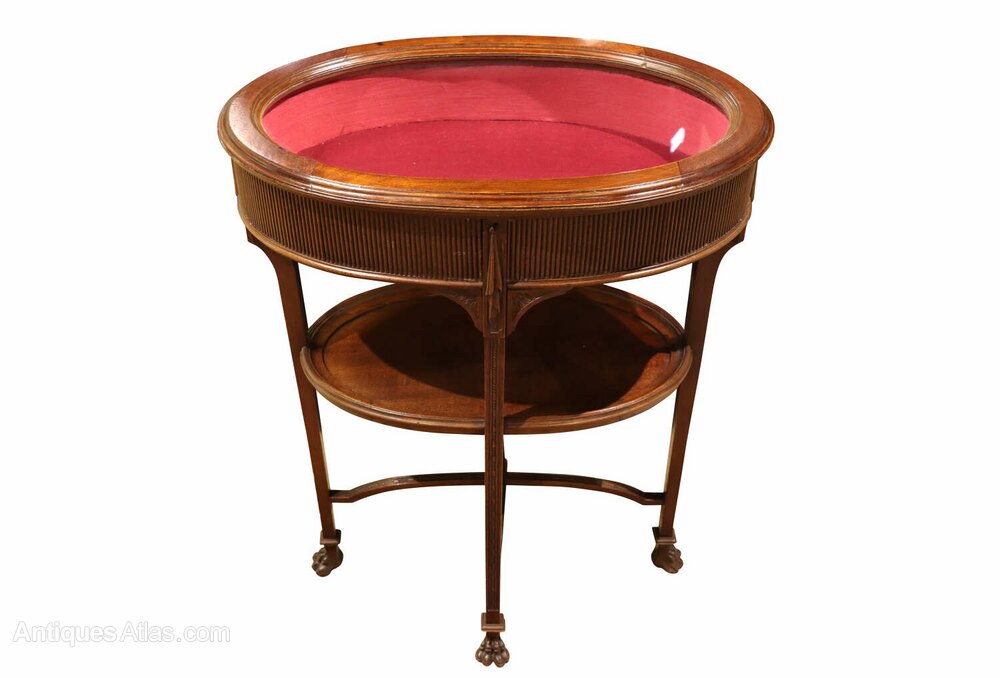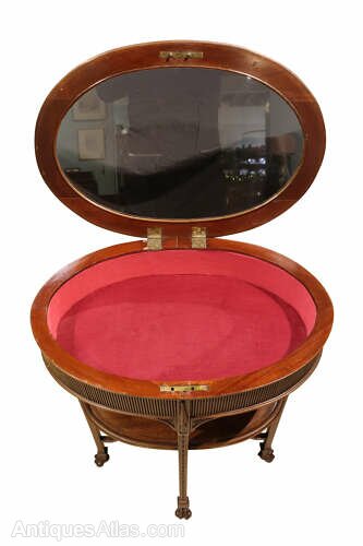 A fine late 19th-century oval mahogany bijouterie table, dating to around 1900, of elegant proportions and refined craftsmanship. The hinged glazed top opens to reveal a velvet-lined interior, ideal for the display of jewellery, small objects or treasured collectibles, while allowing them to be viewed and appreciated from above.The oval top is set above a finely reeded frieze and raised on slender square-section supports, each subtly carved and terminating in well-modelled lion’s paw feet, lending the table both strength and decorative presence. The legs are united by shaped stretchers and centred by a useful oval under-tier, providing additional display or storage space.