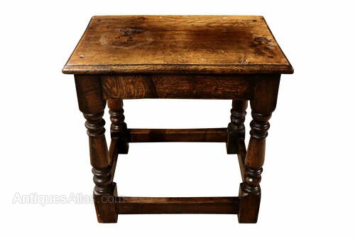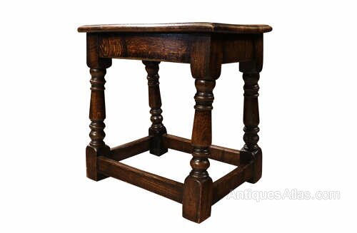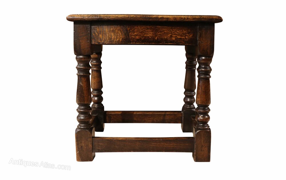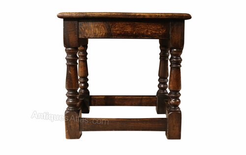 A charming and characterful antique oak joint stool, dating to around circa 1900, constructed in the traditional manner with a solid plank top and well-turned legs. This classic form of English country furniture has been made for centuries and remains highly versatile within both traditional and modern interiors.The stool features a thick rectangular solid oak seat with beautifully figured grain and a warm, rich patina developed through years of use. It stands on four turned legs united by sturdy stretchers forming a square base, a design that provides excellent strength and stability. The turning of the legs gives the piece an attractive sense of rhythm and craftsmanship, reflecting the enduring appeal of traditional joinery techniques.