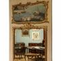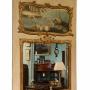 The painting is enclosed within an ornate Rococo-style gilt surround with scrolling foliate decoration, which sits above the rectangular mirror plate. The mirror itself is framed by further carved and gilded detailing, all mounted on the original painted wooden backing board with a moulded cornice to the top.