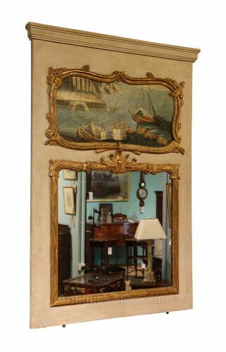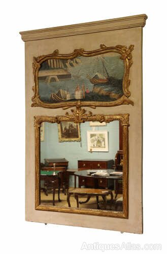 Trumeau mirrors such as this were traditionally placed above fireplaces or between windows in French interiors, where they provided both decorative interest and reflected light around a room. The combination of painted panel and mirror makes these pieces particularly attractive and highly sought after for both period and contemporary interiors.