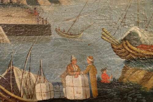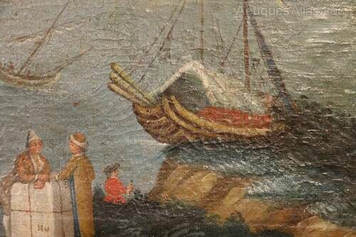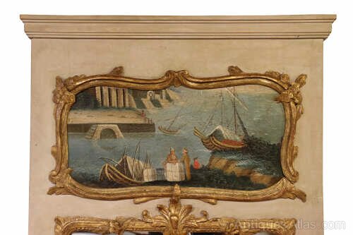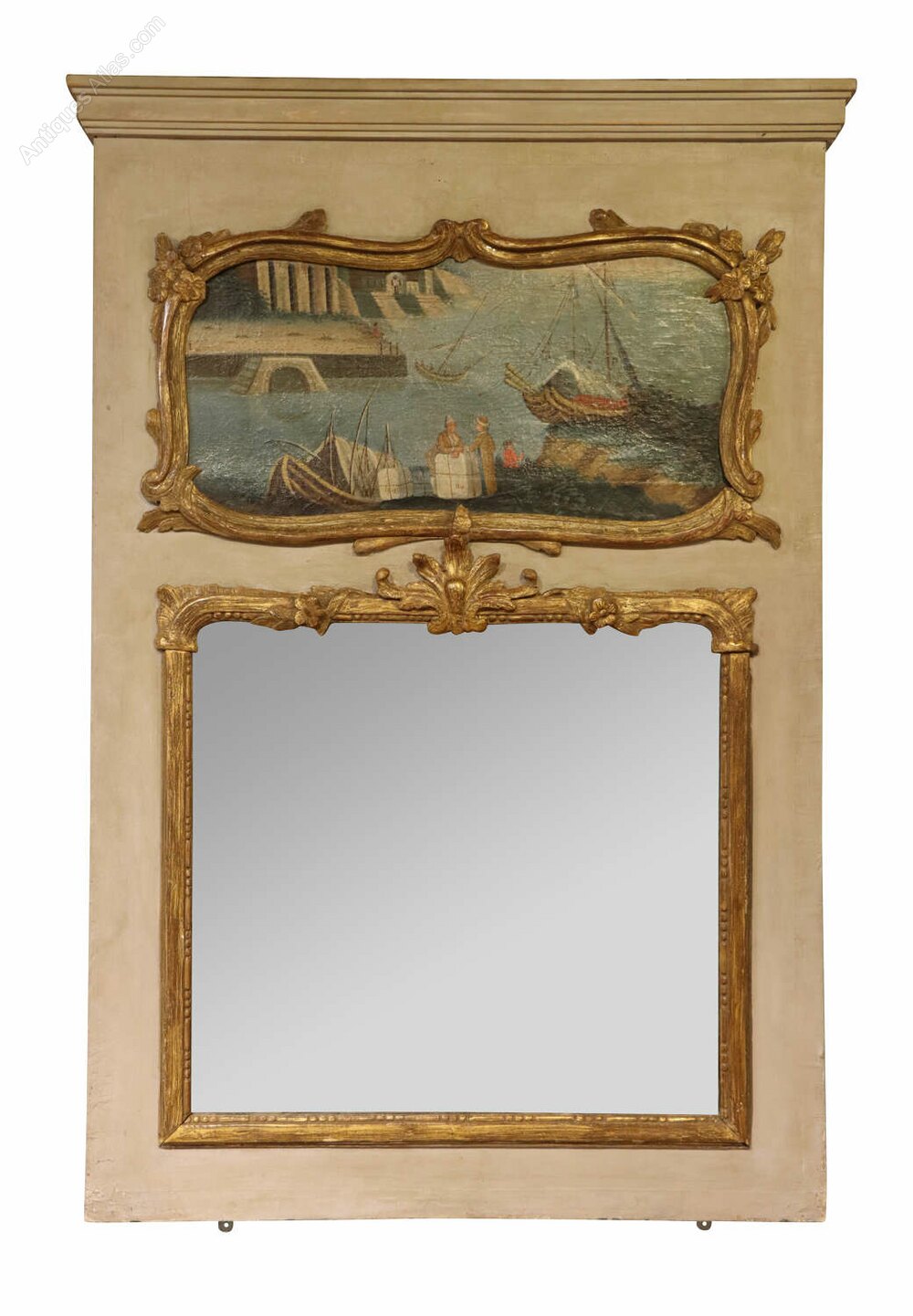 A highly decorative and unusual 19th century French trumeau mirror featuring a charming hand-painted maritime scene set within an elegant gilt stucco frame. The upper panel displays an oil painting of a coastal harbour view with sailing vessels, figures on the shoreline and classical architectural elements in the background, beautifully capturing the romantic spirit of traditional maritime art.