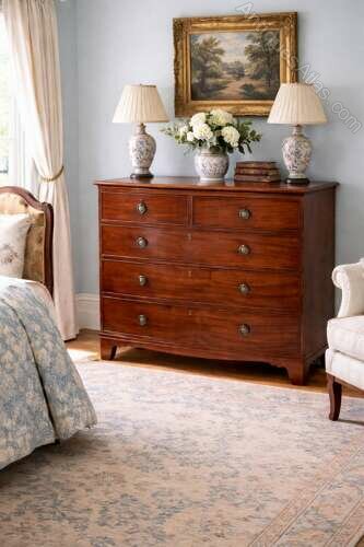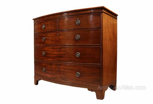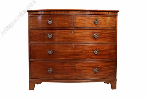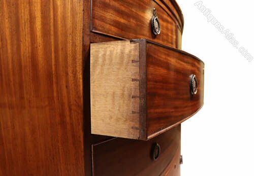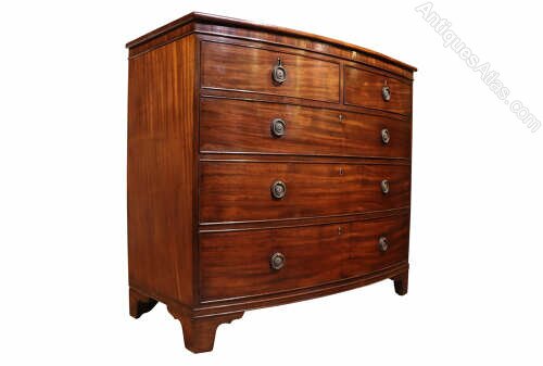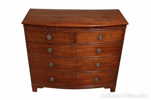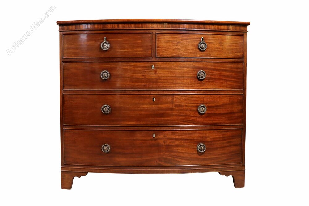 A handsome early 19th century bow fronted mahogany chest of drawers, dating to circa 1810, of excellent colour. The richly figured mahogany veneers display a warm, deep tone with beautiful natural movement throughout, enhancing the overall presence of the piece.The chest is arranged with two short drawers over three long graduating drawers, all oak-lined and traditionally constructed with hand-cut dovetail joints. Each drawer is fitted with circular ring drop handles and original locks.