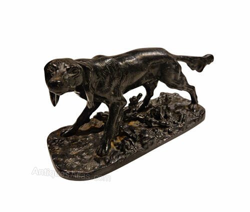 Cast iron cast of a Setter passing over thistle, his long tail raised.The base cast with Kacnh Kasli 1972 Foundry Stamp