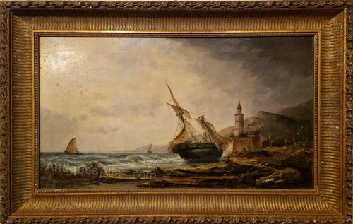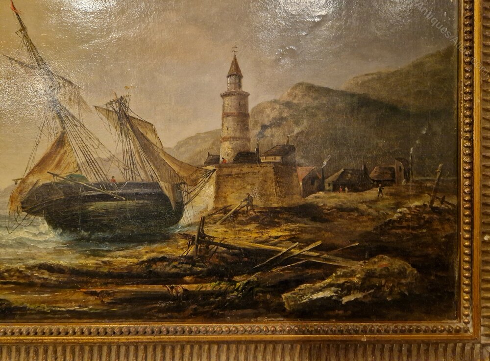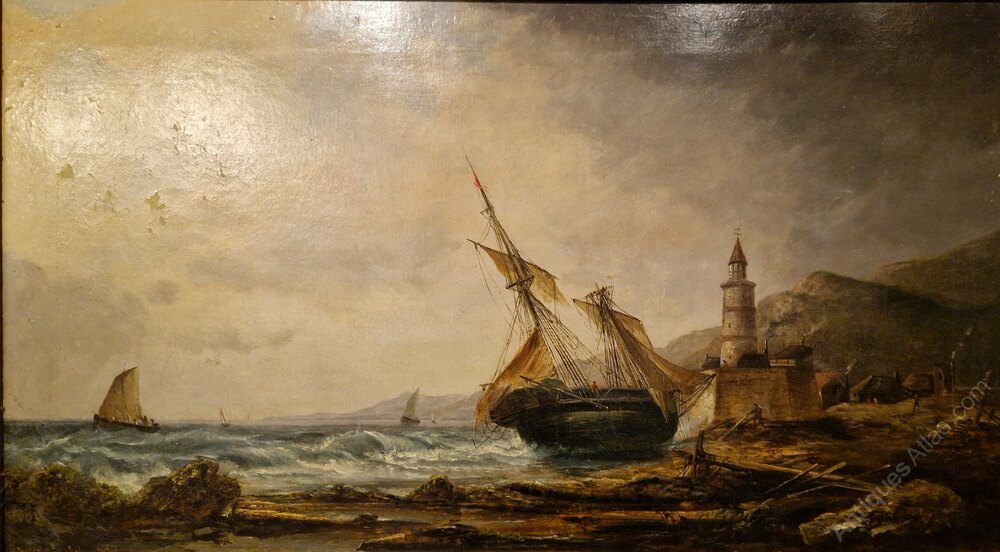 A good 19thc oil on canvas of a shipwreck by a lighthouse in a stormy sea by Millson - Huntsigned bottom right