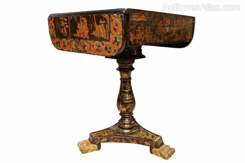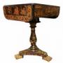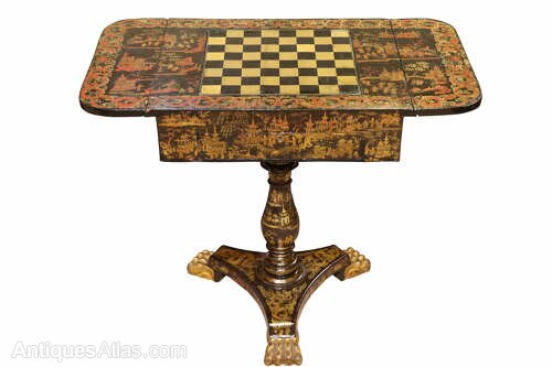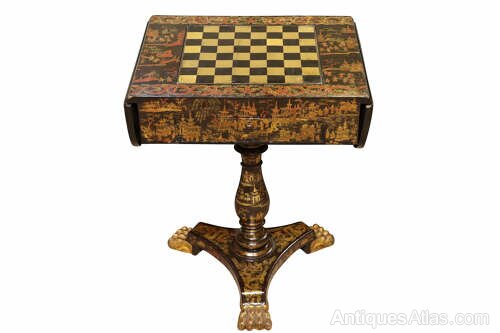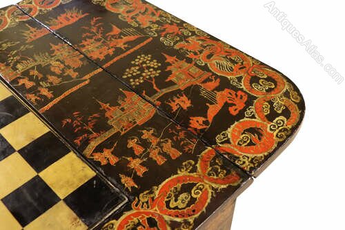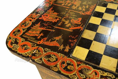 This 19th-century lacquered drop-leaf table is a stunning example of fine craftsmanship and oriental-inspired design. The richly decorated surface features intricate chinoiserie scenes, hand-painted in vibrant red, gold, and black lacquer, depicting pagodas, figures, and stylised dragons. The central rotating panel lifts and turns to reveal a reversible games surface, offering both a chess board and a backgammon interior, making it a versatile and highly collectible piece for gaming enthusiasts and antique lovers alike.The table stands on an elegant turned column with “birdcage” support under the top, allowing smooth rotation. The tripod base is beautifully detailed with gilt decoration and finished with carved gilded paw feet.