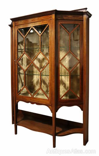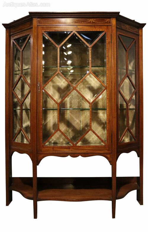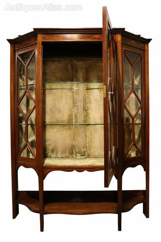 Good quality Edwardian mahogany display base with bevelled glass panelled doors, 2 glass shelves, satinwood inlay and marquetry.circa 1900