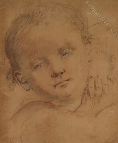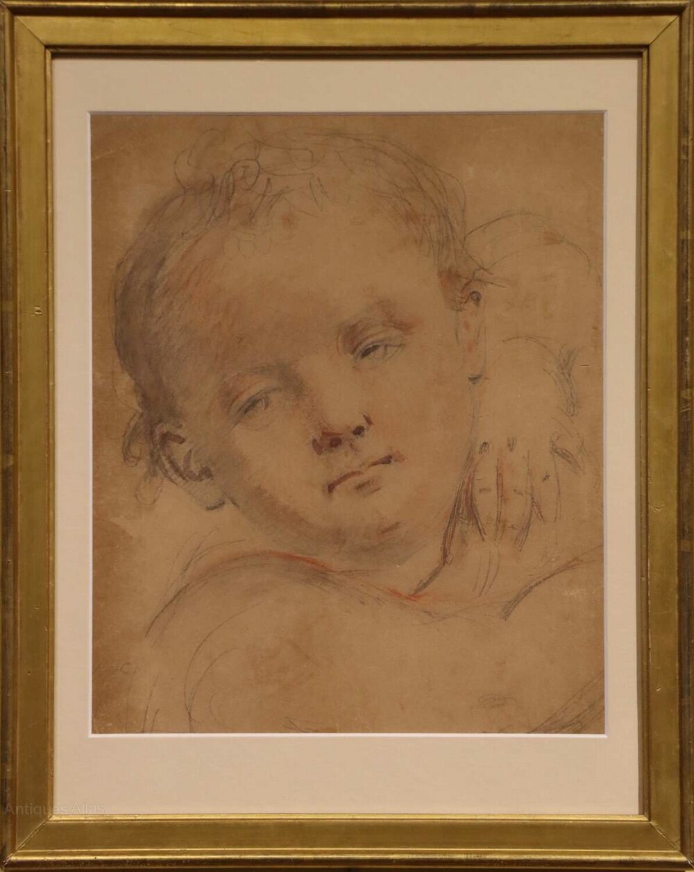 A fine Victorian pencil sketch of a young boy, circa 1850, delicately heightened with red and white chalk to add warmth and definition. The portrait, indistinctly initialled M? C?, displays the soft, romantic style typical of mid-19th century British portraiture.This antique drawing has been professionally conservation mounted and is presented in a period gilt frame.