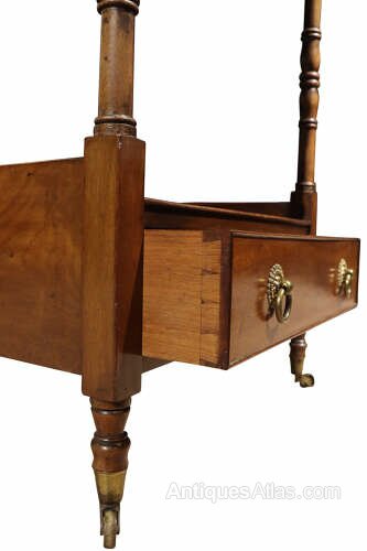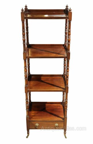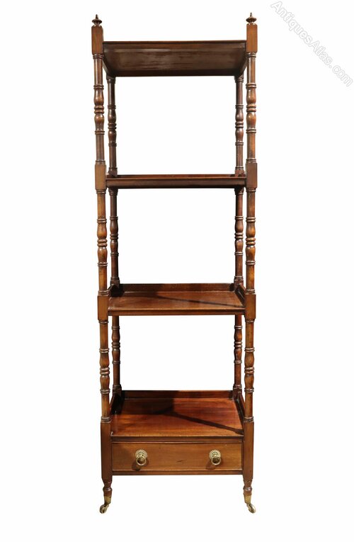 A fine Victorian mahogany four-tier whatnot, crafted in the Georgian style, dating to around 1880. The piece features four graduated tiers supported by turned baluster columns, topped with elegant finials, and finished with a useful single drawer with brass ring pulls to the base.Set on slender turned legs with brass castors, this versatile piece combines practicality with refined style. Perfect for displaying books, decorative objects, or collectibles, it is equally at home in a living room, study, or hallway.
