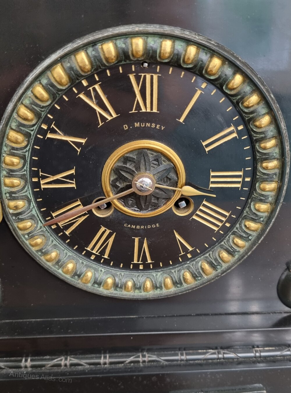 The circular dial, with gilt Roman numerals and jewelled gilt bezel, is signed “D. Munsey, Cambridge”, refering to David Munsey, a distinguished Cambridge jeweller and goldsmith who established his firm on Market Hill in 19th Century. Initially trading as David Munsey, the business became Munsey & Co. Ltd in 1901 and continued under the Jackson family into the 20th century, later merging into Northern Goldsmiths. The premises are still occupied today by Goldsmiths Jewellers, making this clock a rare surviving witness to over 140 years of Cambridge horological retail history.
