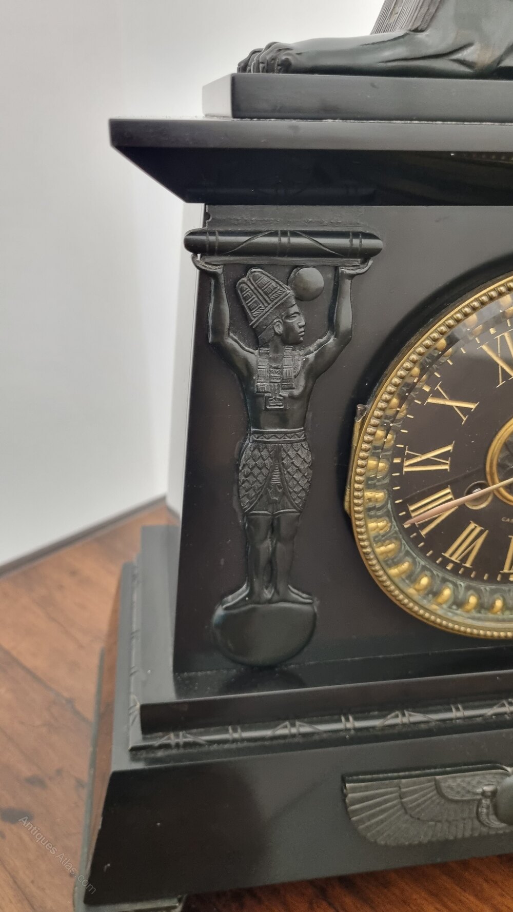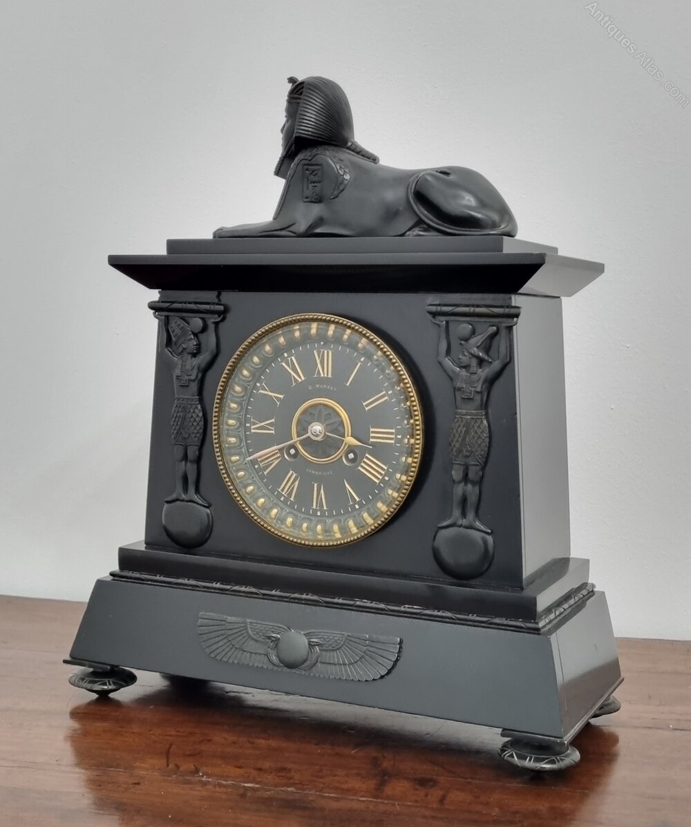 A fine Egyptian Revival mantel clock retailed by D. Munsey of Cambridge, circa 1880s, black marble and slate clock case with elaborate bronze mounts.The architectural case is surmounted by a finely cast bronze sphinx. Flanking the dial are two standing figures in the form of Egyptian deities or guardians, recalling the God Osiris (lord of the underworld and rebirth). Bottom of the clock case is further decorated with a winged scarab.