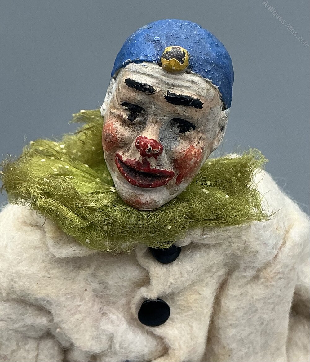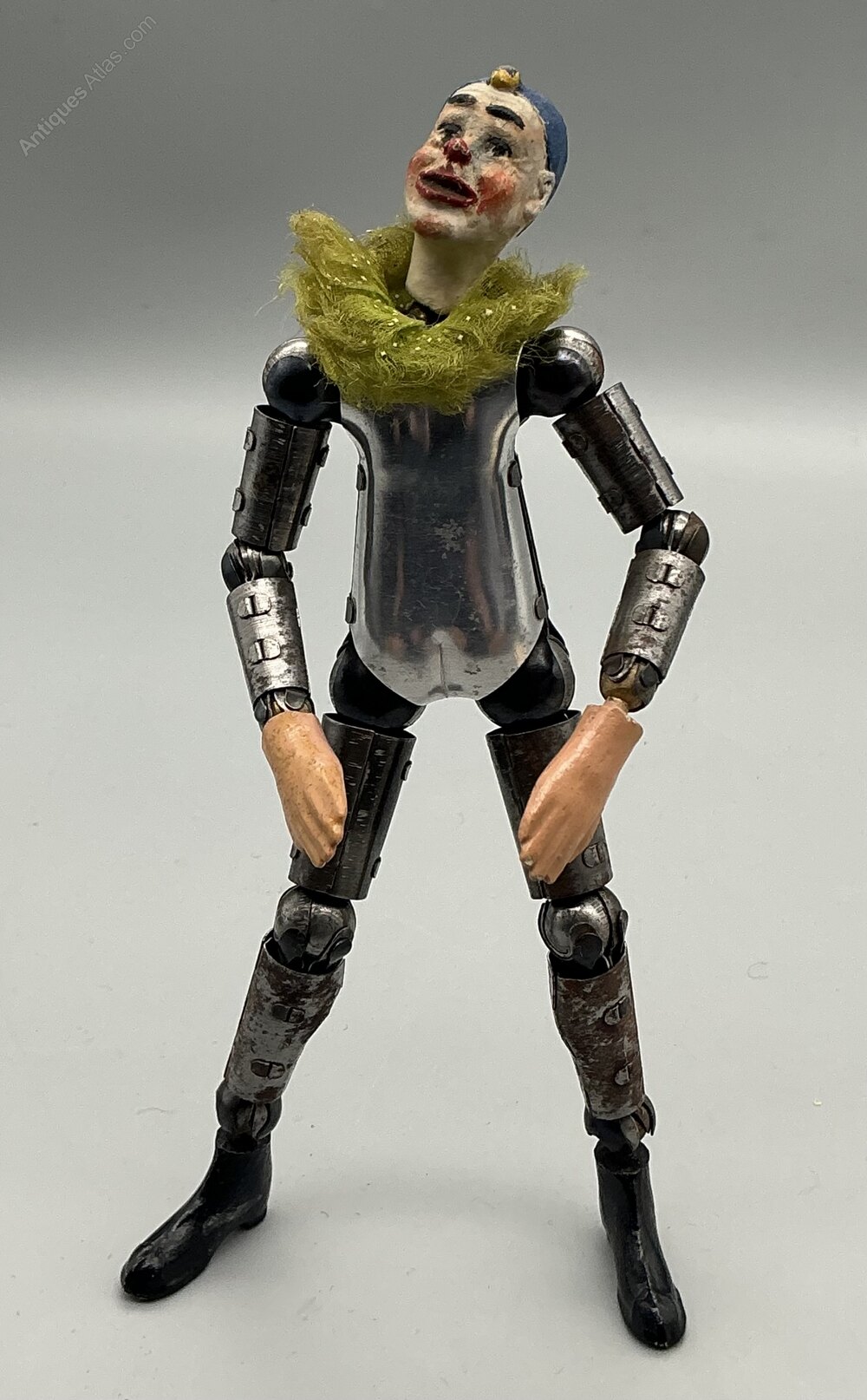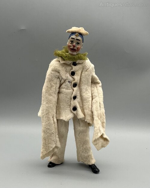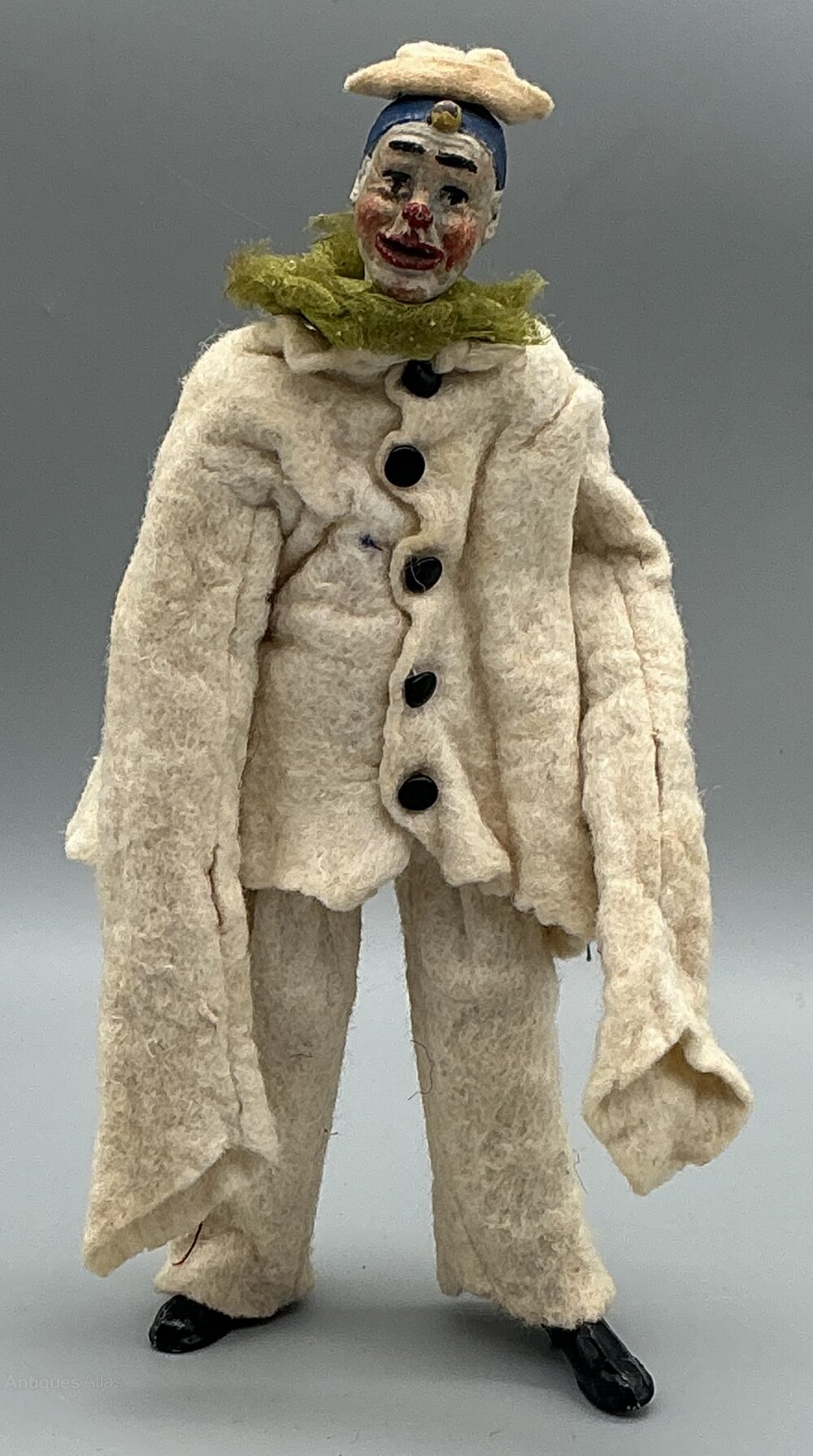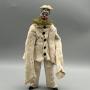 A rare Swiss jointed Pierrot metal doll by Bucherer SABA, dating from the early 20th century.This charming and finely crafted figure measures approximately 20 cm in length and features a jointed metal body with composition hands and a moulded male head. Modelled as Pierrot, the wistful clown of the Commedia dell’Arte, the doll displays beautifully painted facial features that capture the character’s expressive, melancholic allure.
