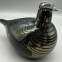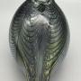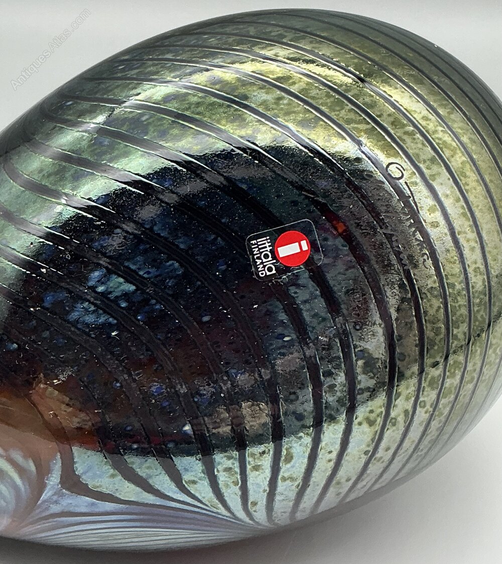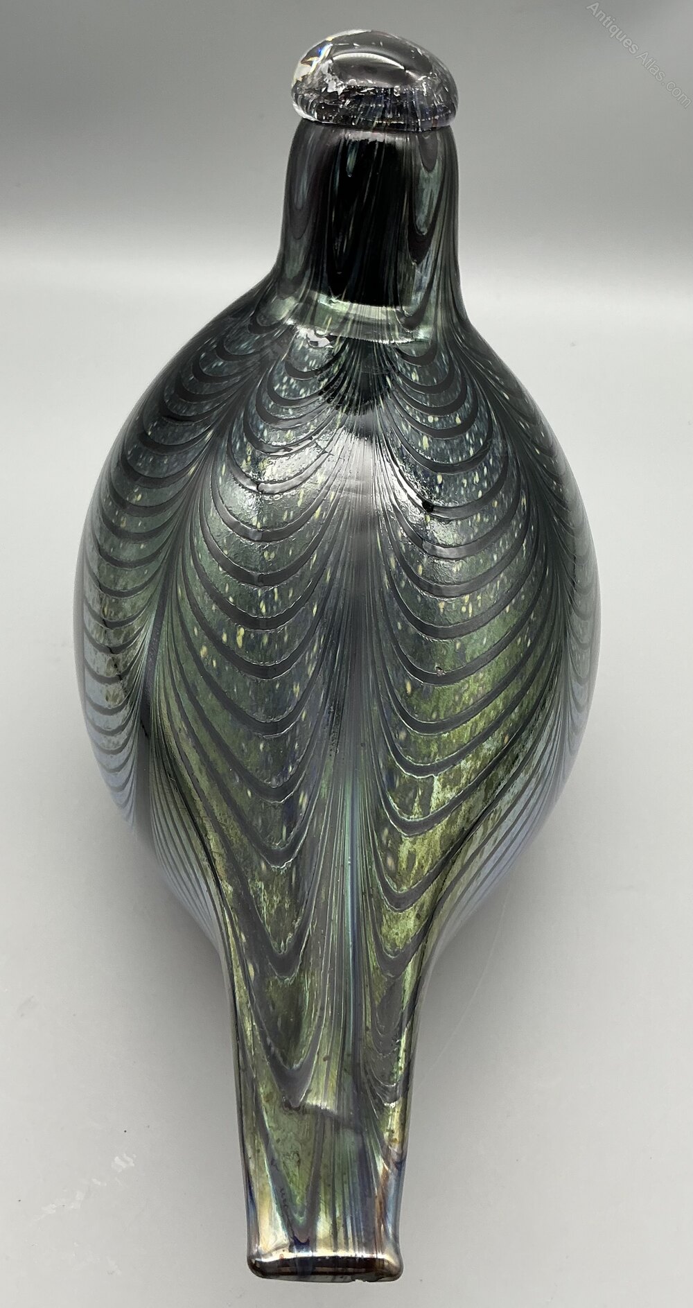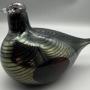 A striking and highly collectible art glass bird designed by celebrated Finnish glass artist Oiva Toikka for Iittala. This impressive piece depicts a resting grouse, distinguished by its beautifully patterned body featuring iridescent peacock-feather motifs that shift colour and intensity as the light moves across the glass.Measuring 18 × 24 cm, the bird has a generous, sculptural presence and showcases Toikka’s signature blend of imaginative design, rich colouration, and expert glassblowing technique. The smooth, rounded form is complemented by the shimmering feather pattern, giving the piece a dynamic yet elegant character.