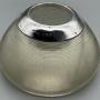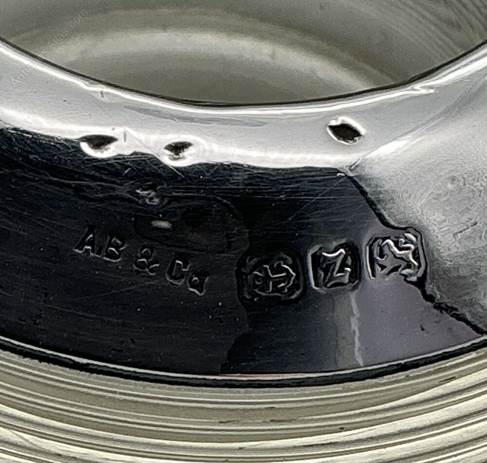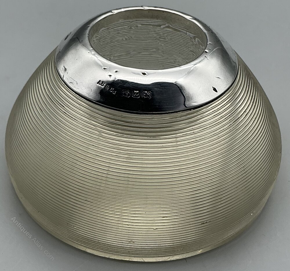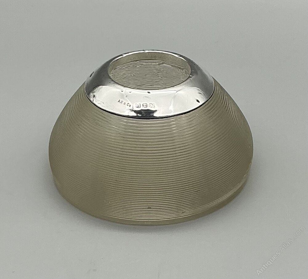 A fine early 20th-century silver-mounted glass match striker, hallmarked for A. Barrett & Co., Birmingham, 1924.The clear ribbed glass body is of classic spherical form, designed for striking matches, with a plain sterling silver collar neatly fitted to the top. The mount is clearly hallmarked with the maker’s mark AB & Co, together with the Birmingham assay mark, lion passant, and date letter Z for 1924.