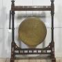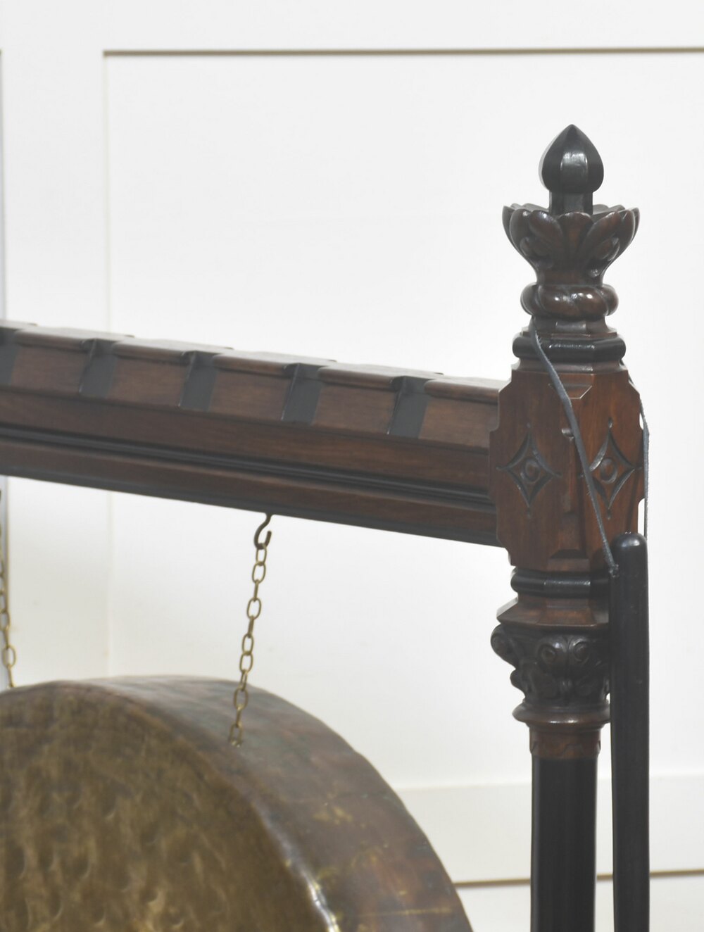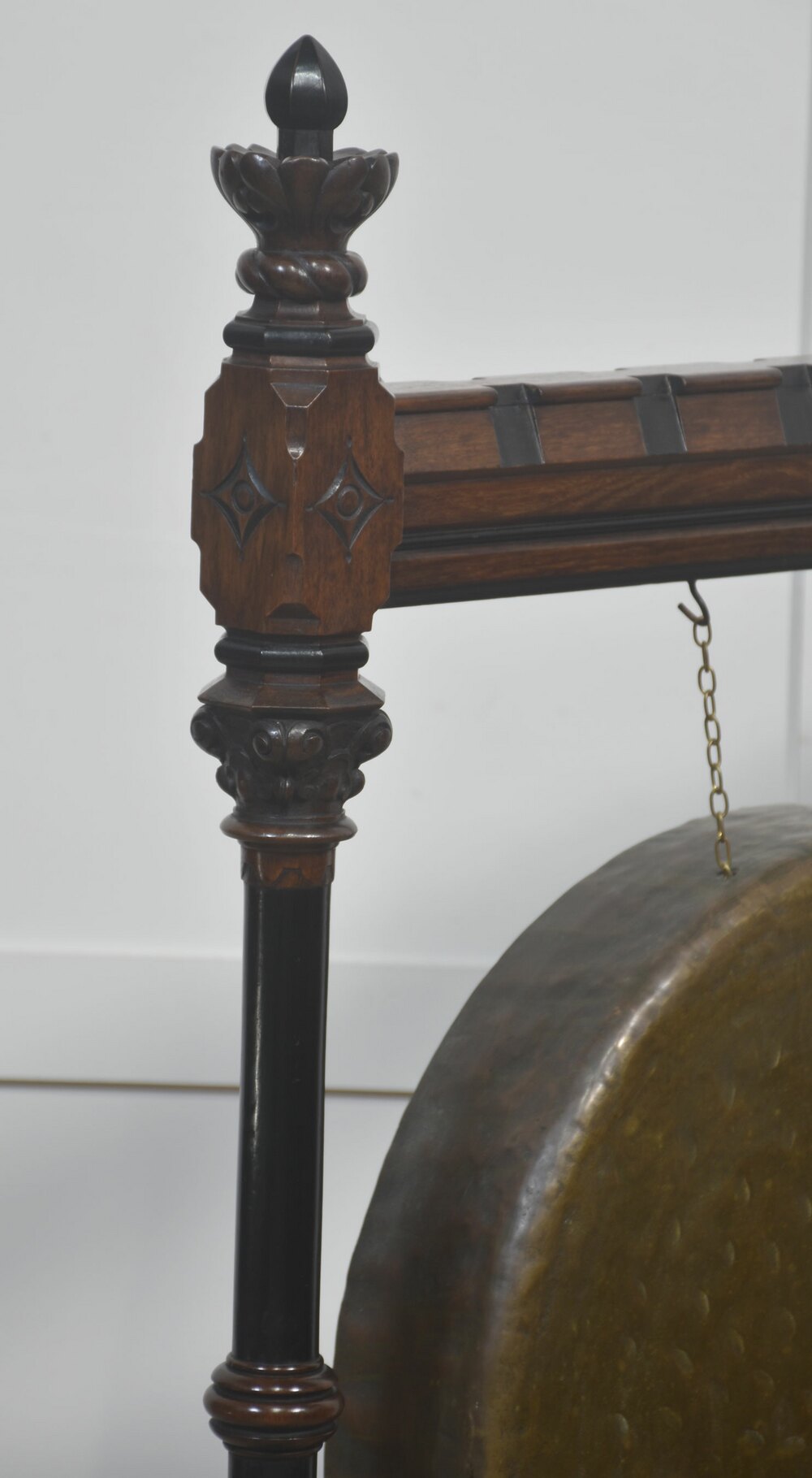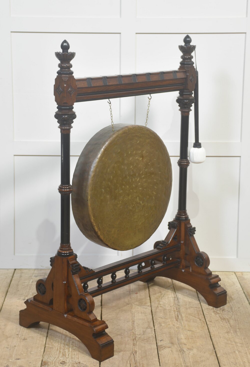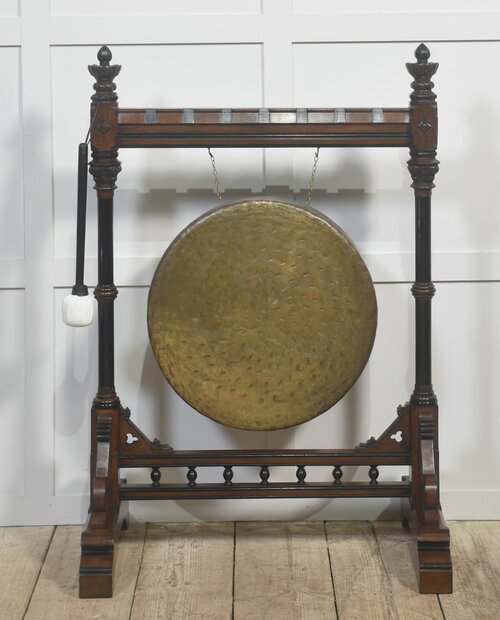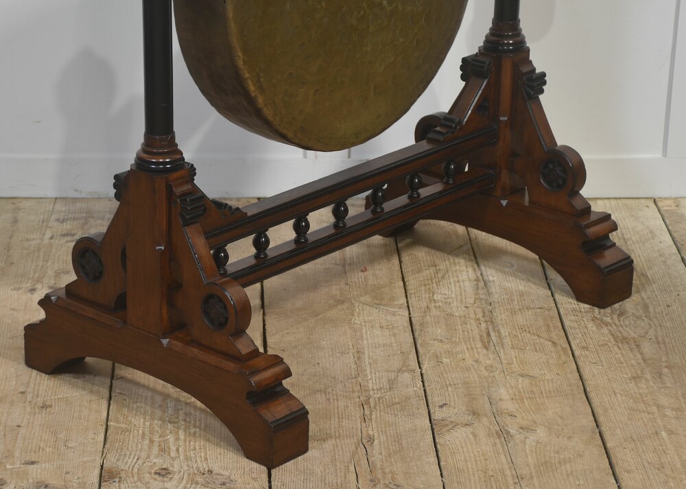 A striking late 19th-century Gothic Revival freestanding gong, mounted in an elaborately carved walnut frame of architectural character. The substantial circular bronze gong, hand-hammered throughout and retaining a deep, variegated patina, is suspended by chains from a horizontal beam secured with exposed metal strapping. The walnut frame is finely detailed with turned uprights, carved finials, pointed geometric motifs, and a stretcher base incorporating baluster spindles, all resting on shaped feet. Accompanied by a padded striker, suspended to one side.Both sculptural and functional, this commanding Gothic Revival object would have served as a ceremonial, institutional, or domestic signalling instrument. Its scale, craftsmanship, and pronounced verticality give it a strong architectural presence, making it an exceptional statement piece.