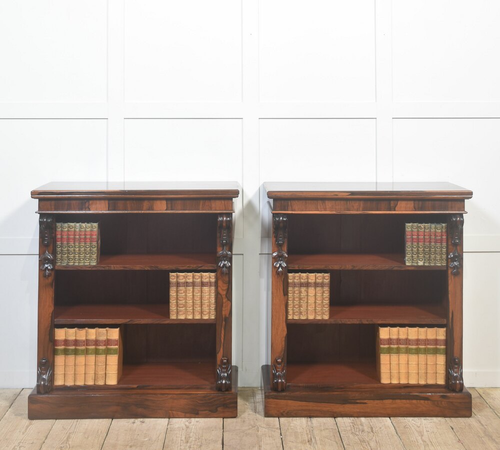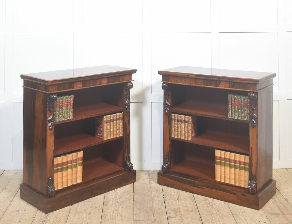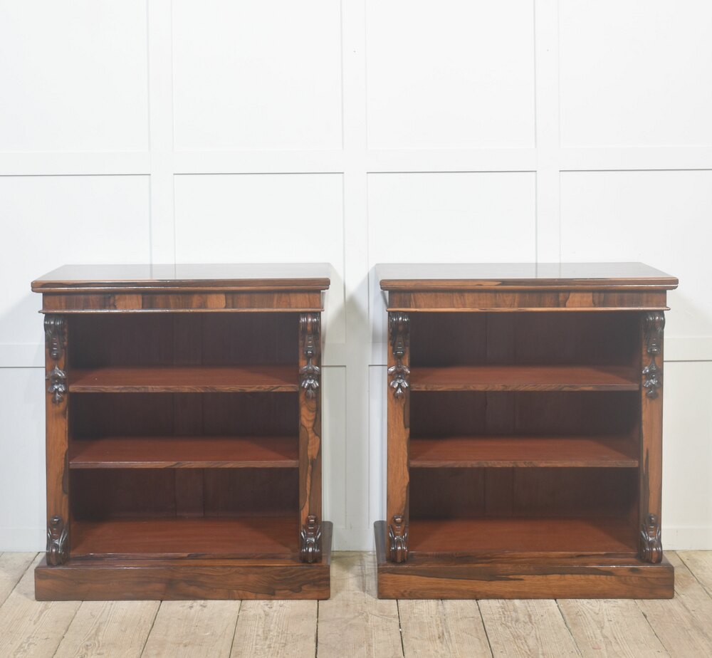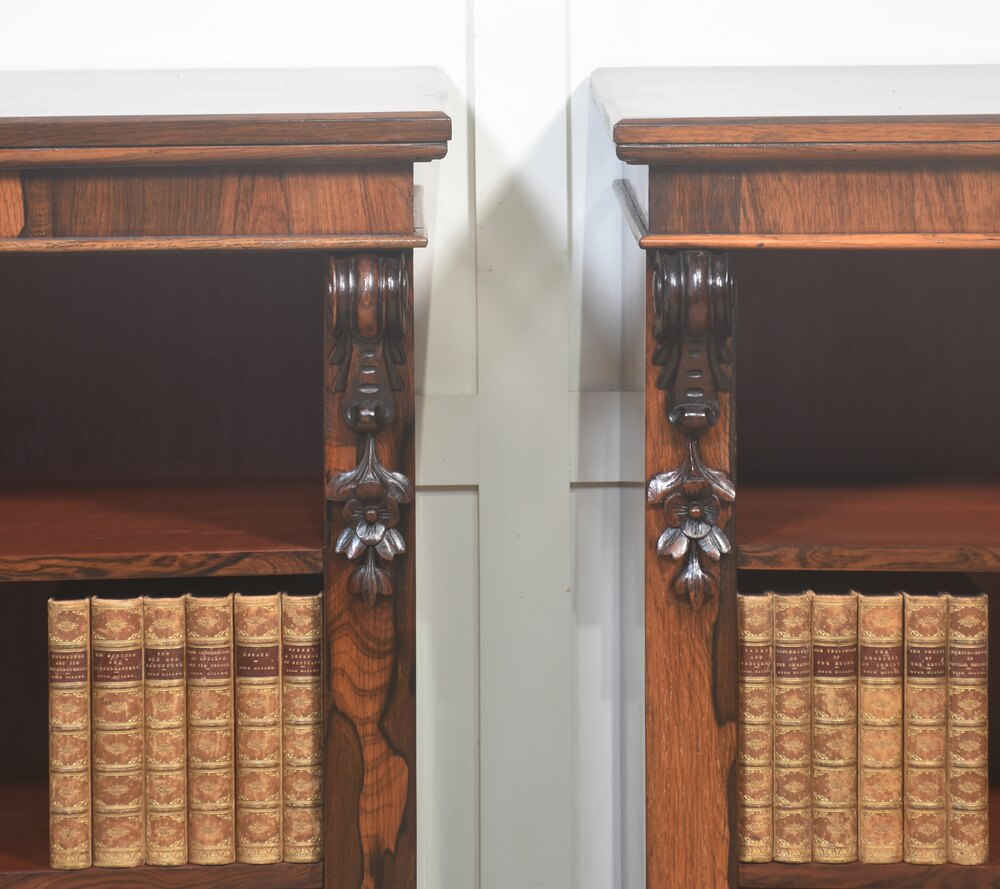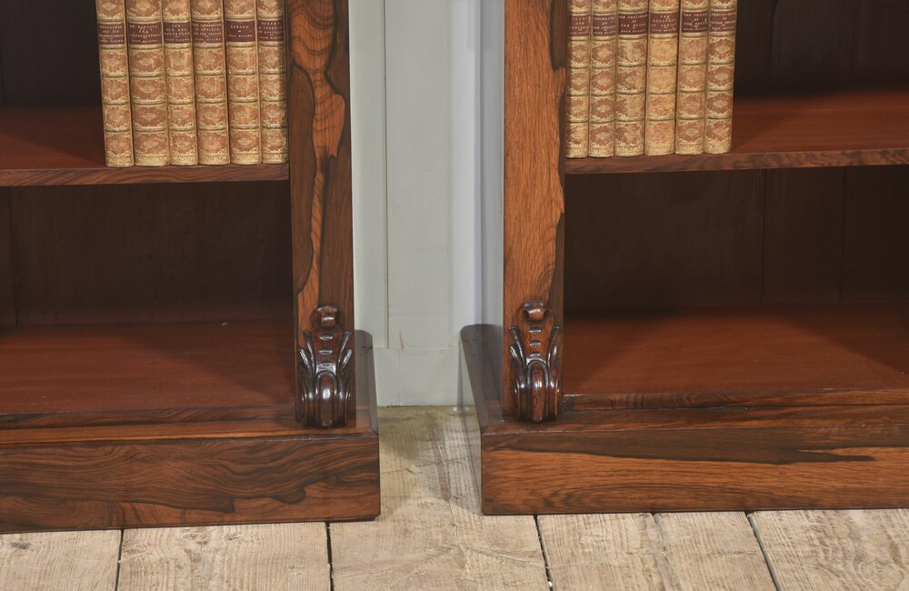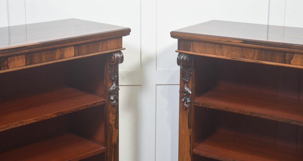 A handsome pair of 19th-century open bookcases, crafted in richly figured rosewood and designed with both elegance and practicality in mind. Each bookcase is surmounted by a solid rectangular top above an open interior fitted with adjustable shelving, allowing for flexible accommodation of books or decorative objects of varying heights.The cases are framed by boldly carved vertical uprights, terminating in finely executed foliate corbels at both the upper and lower corners. These carved elements provide visual depth and architectural interest while remaining restrained and well-balanced within the overall design. The bookcases stand on solid plinth bases, lending stability and a grounded, confident presence.