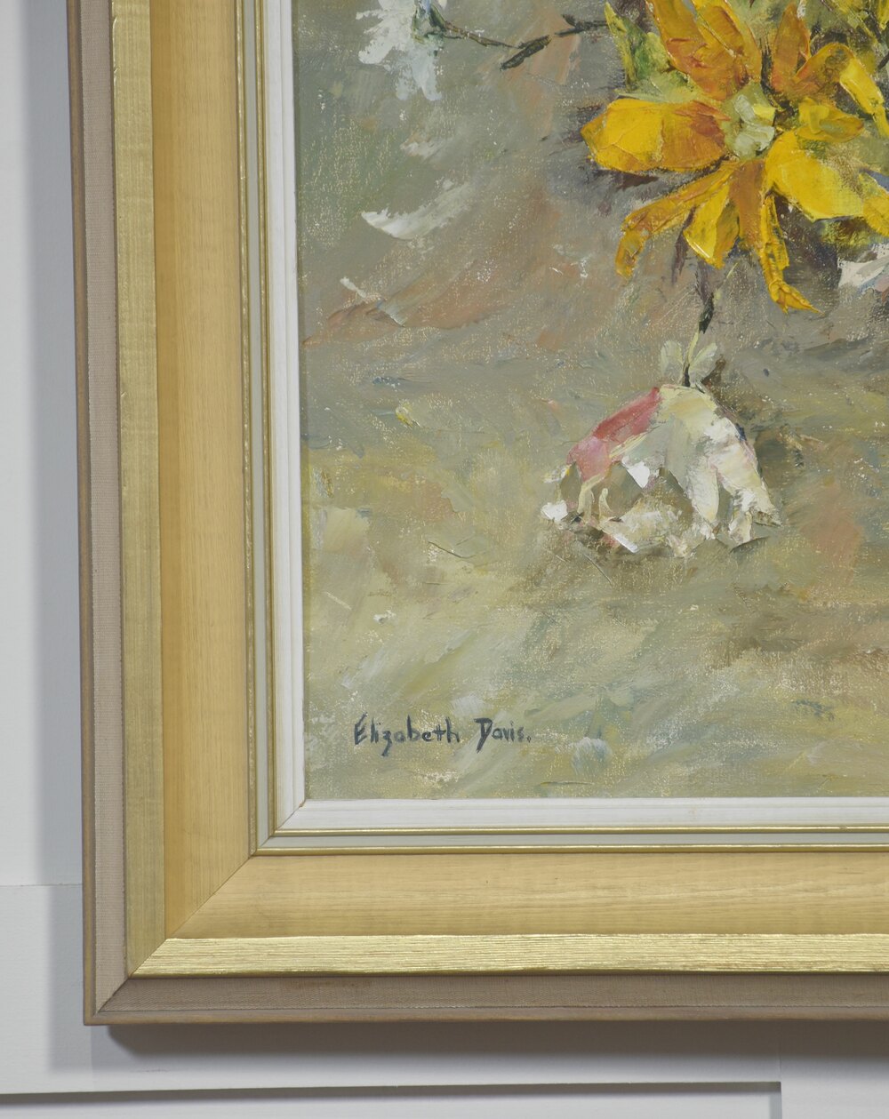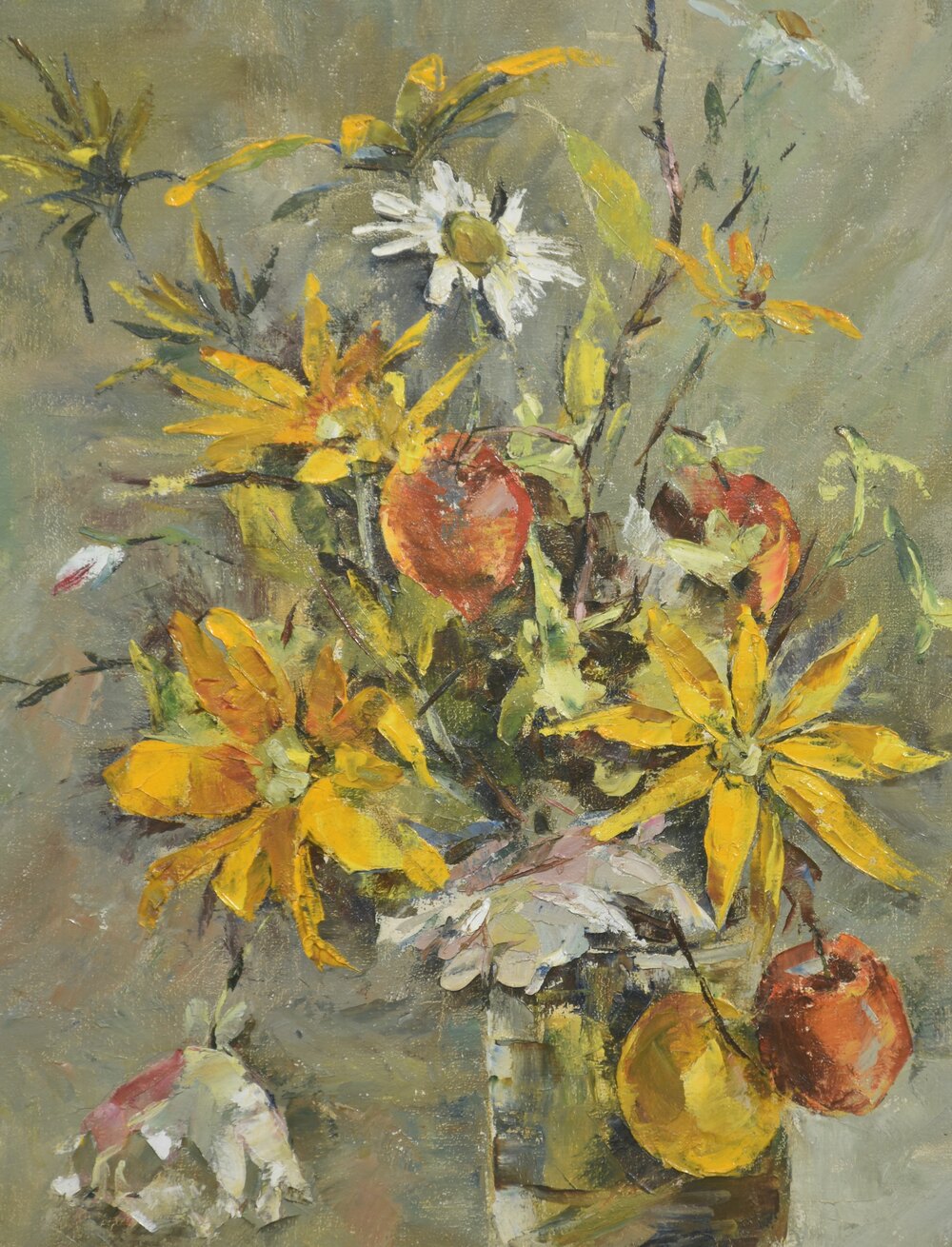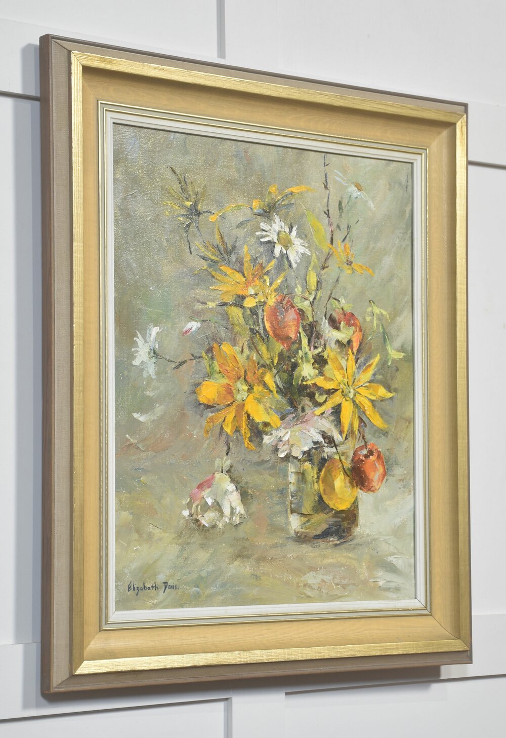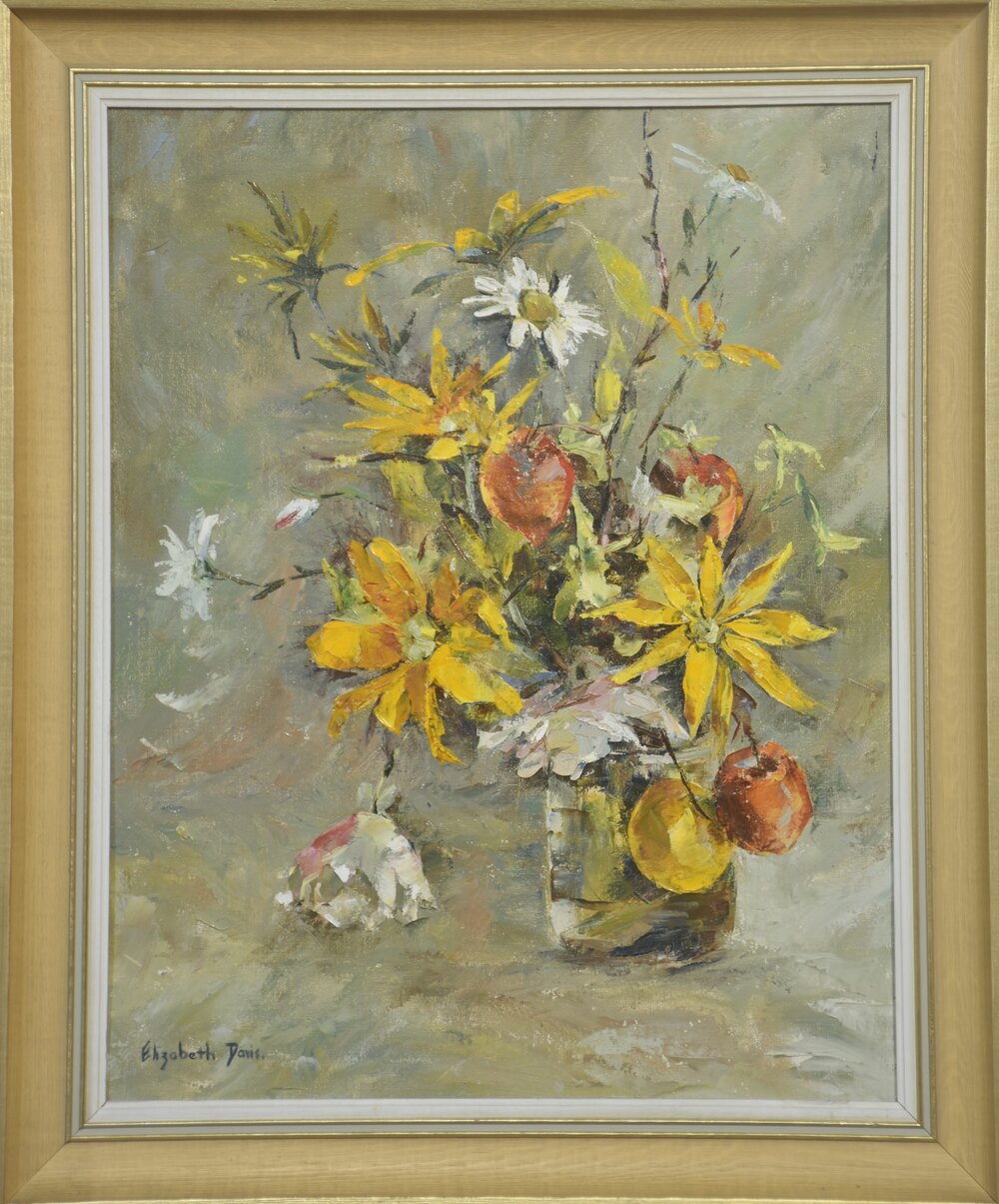 This expressive still life by Elizabeth Davis presents a loosely arranged bouquet of yellow flowers interspersed with white blossoms and apples, set within a simple glass vessel. Executed in oil with confident, gestural brushwork, the composition emphasises movement and surface texture rather than botanical precision. Thick impasto strokes define petals and foliage, while softer, blended passages in the background create atmospheric depth.The palette is warm and harmonious, dominated by golden yellows, muted greens, soft greys, and earthy reds. Apples punctuate the floral arrangement with rounded forms and saturated colour, providing visual weight and contrast against the vertical stems and blossoms. The background remains deliberately understated, allowing the energetic central motif to remain the focal point.