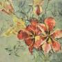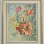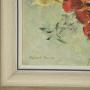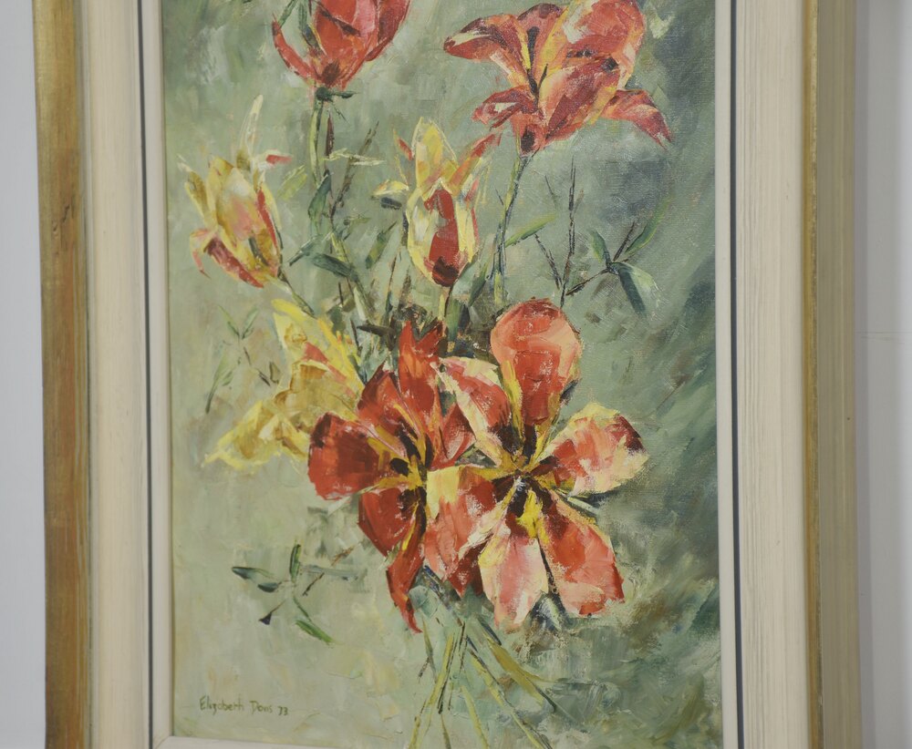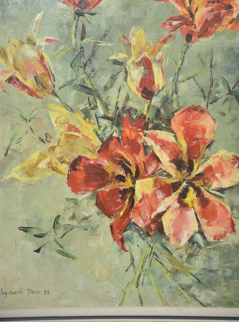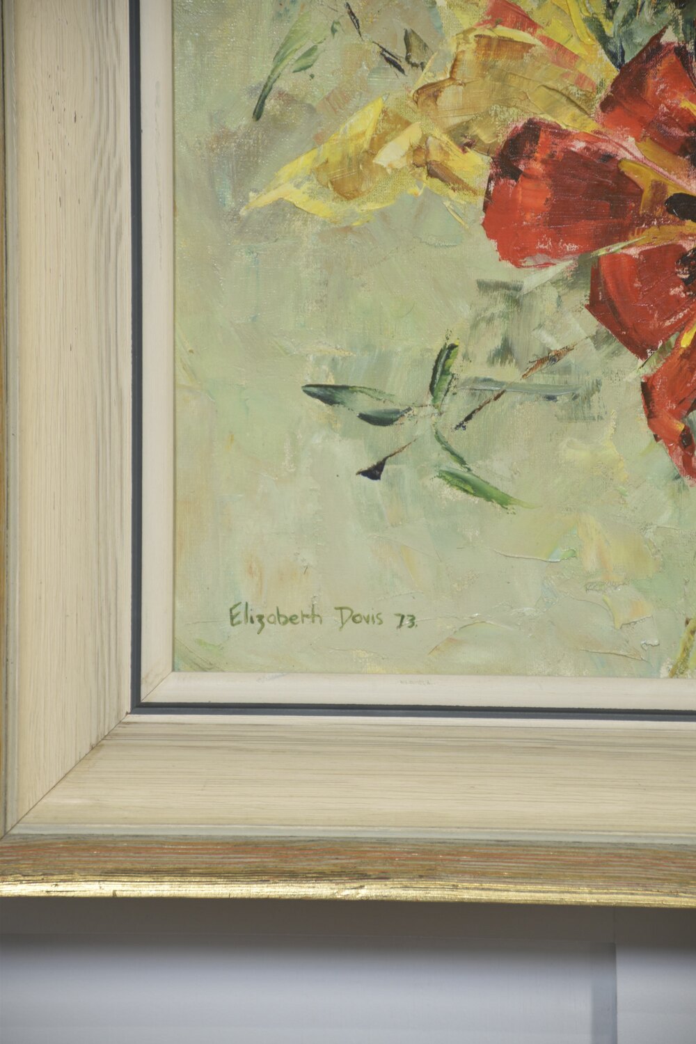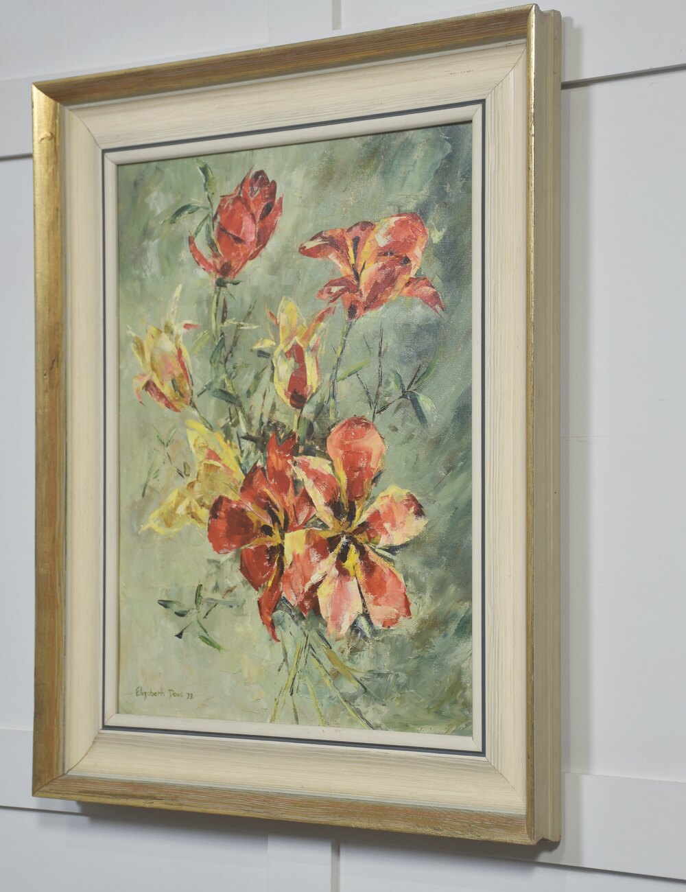 This expressive floral still life by Elizabeth Davis presents a dynamic bouquet rendered in bold, gestural brushwork and a luminous, impressionistic palette. Vibrant blossoms in saturated reds, corals, and warm yellows emerge against a softly modulated green ground, creating a striking interplay of colour, movement, and texture. The composition is animated by confident, layered strokes that lend both depth and spontaneity, characteristic of mid-century modern painterly sensibilities.Davis employs thick impasto and visible palette knife work to build richly textured petals and foliage, resulting in a tactile surface that enhances the painting’s visual energy. The loosely structured arrangement conveys a sense of organic vitality, balancing abstraction with recognisable botanical forms. Subtle tonal transitions in the background provide atmospheric depth, allowing the floral forms to advance dynamically into the viewer’s space.