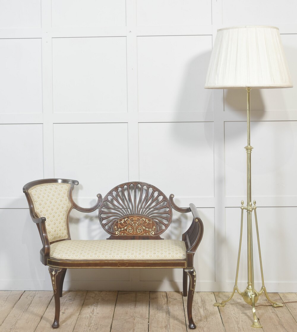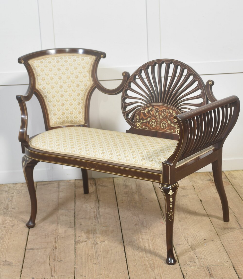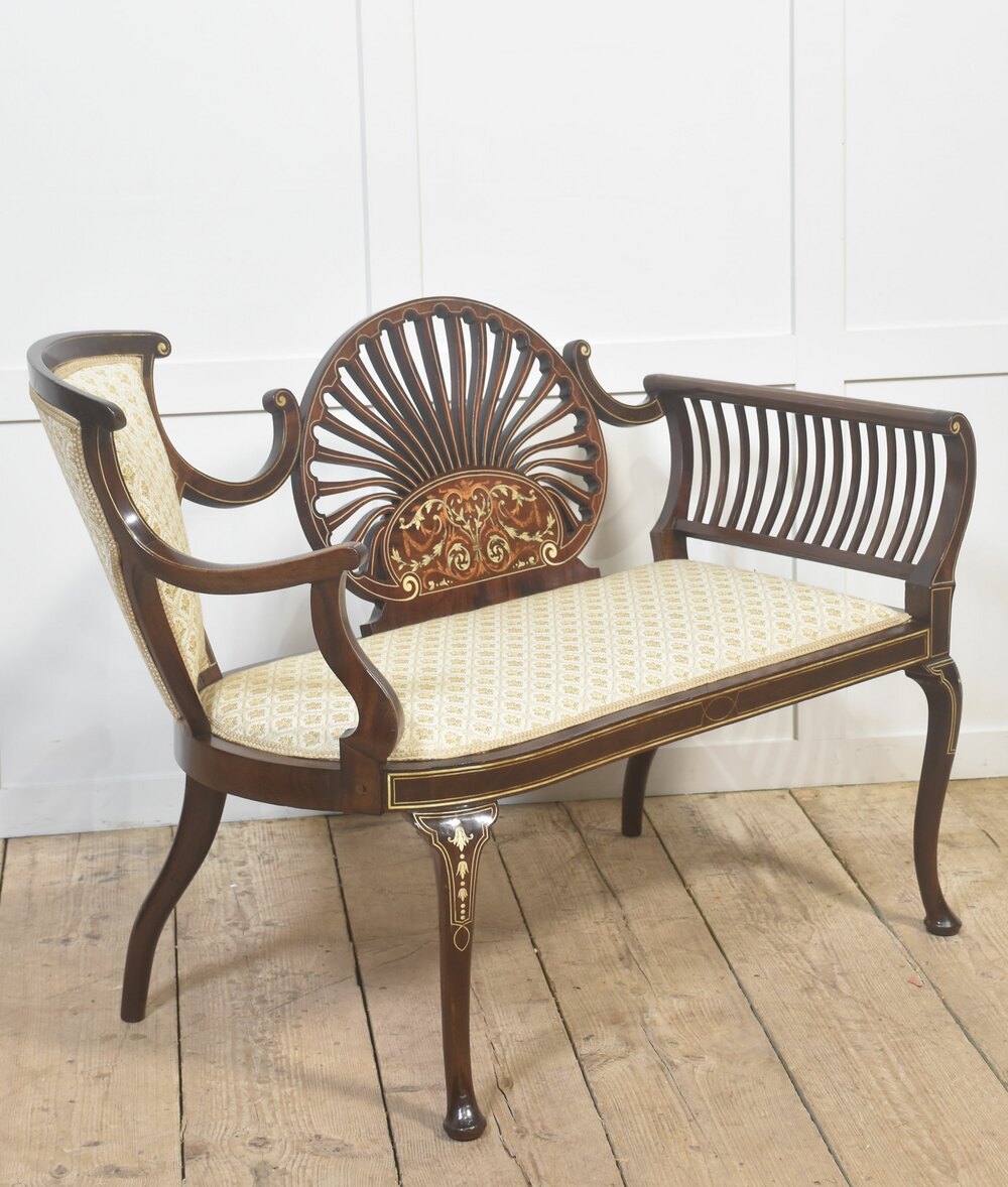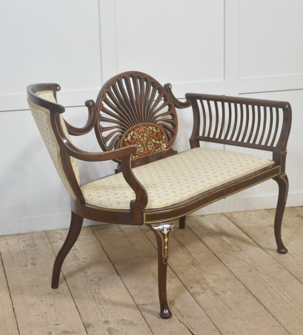 A finely conceived Edwardian inlaid mahogany settee in the Sheraton Revival taste, displaying elegant proportions and restrained neoclassical ornament. The back is centred by a distinctive fan-shaped splat formed from finely cut radiating slats, framed with satinwood stringing and enriched below with delicate floral and foliate marquetry in contrasting light woods. This decorative panel provides a strong visual focal point while remaining light and architecturally balanced.The design is notably asymmetrical, a feature frequently encountered in Edwardian decorative furniture. One side incorporates a shaped upholstered backrest framed in mahogany, while the opposite side is fitted with a finely spaced slatted back rail. The arms are entirely of solid mahogany, gracefully curved and terminating in subtle scrolls, contributing to the crisp linear quality of the piece and reinforcing its classical revival character. No upholstery is present on the arms, allowing the quality of the timber and inlay work to remain fully visible.