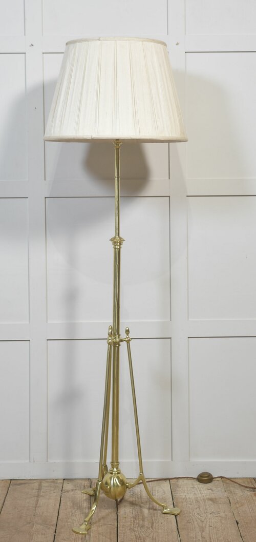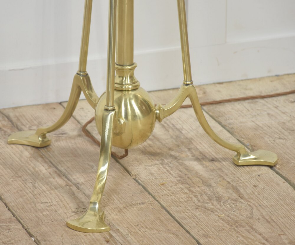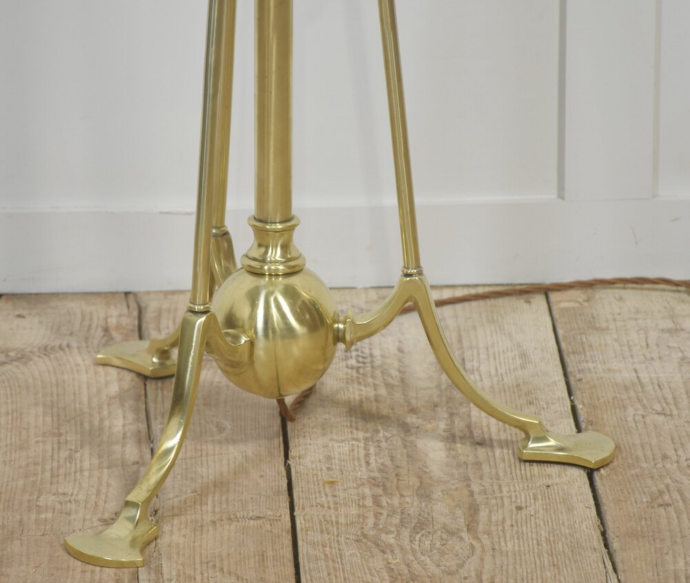 An adjustable brass floor lamp in the Arts and Crafts tradition, raised on a well-balanced tripod base and exhibiting the restrained classical influence typical of Edwardian lighting. The design emphasises honest construction and functional clarity, with minimal ornamentation and carefully proportioned architectural detailing.