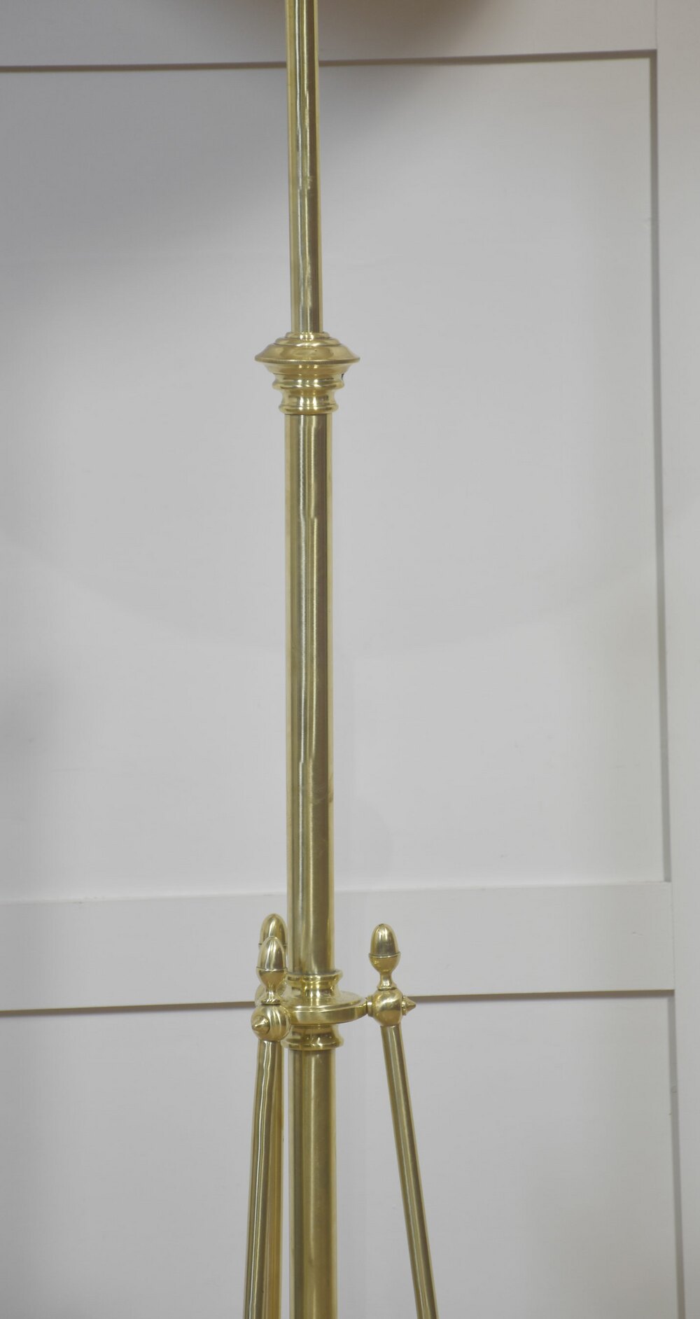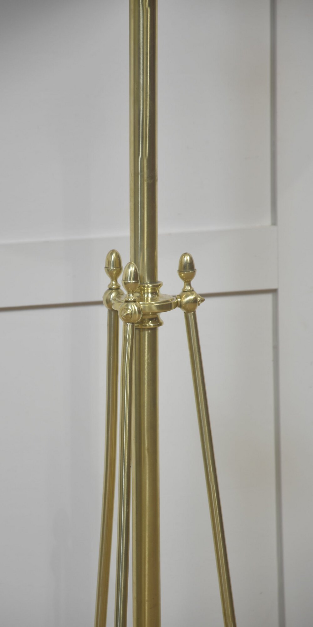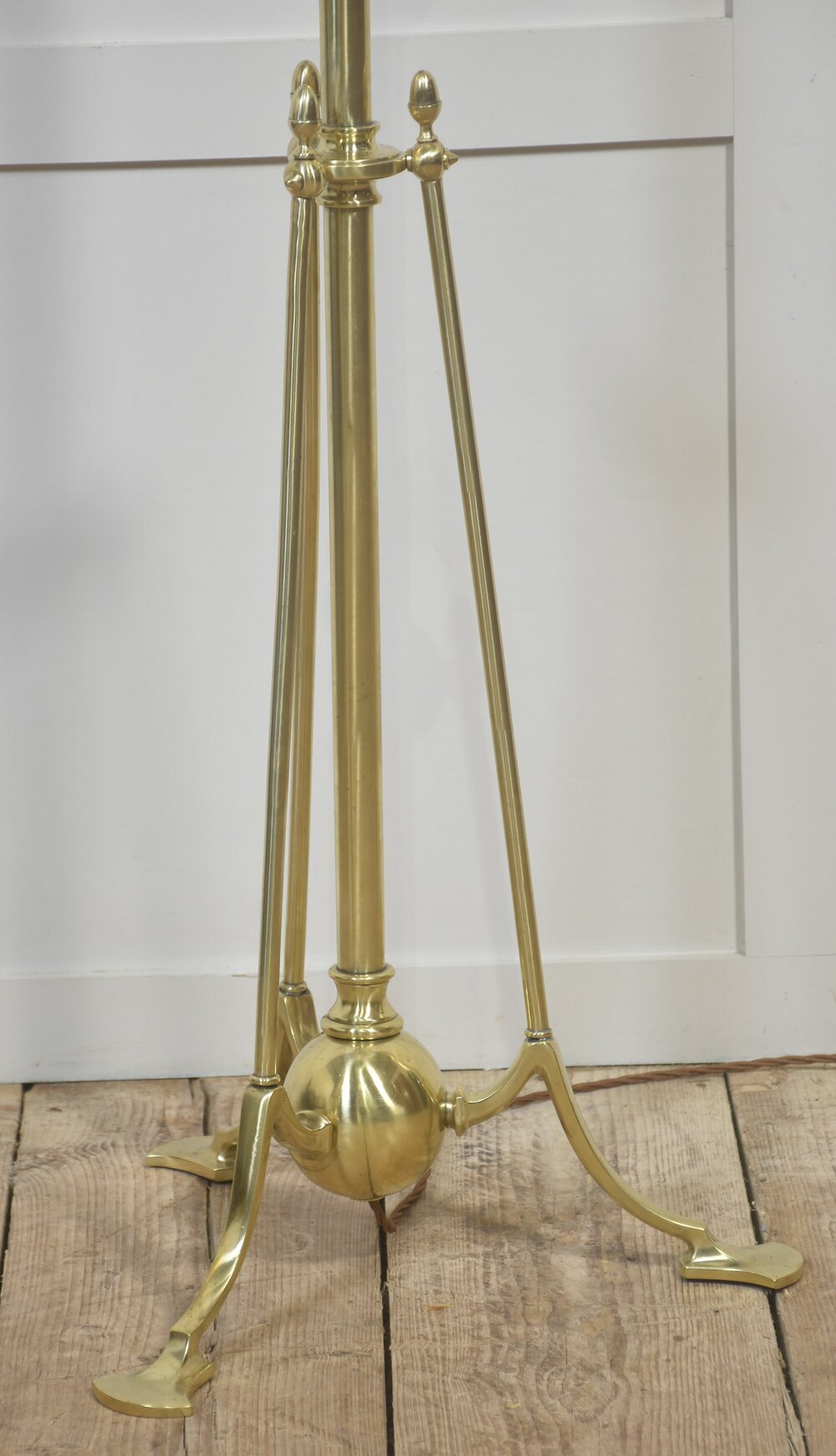 The height-adjustable central standard rises from a spherical brass counterweight, from which three symmetrically splayed legs extend, secured by a decorative collar with turned finial details. Each leg terminates in a flattened pad foot, providing stability and visual balance. The adjustable mechanism is openly expressed and neatly integrated into the structure, consistent with Arts and Crafts principles.