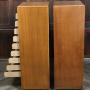 This eye-catching pair of solid oak filing cabinets features charming tambour fronts complete with original locks and keys. When opened, the fronts glide neatly into the cabinet body, revealing nine labelled sliding shelves—each just right for A4 papers. Hidden castors in the plinthed base allow them to move easily around your space. With their warm oak colour and beautifully aged patina, these cabinets aren’t just practical—they’re statement pieces for any home or office.Internal Reference: SAI3823