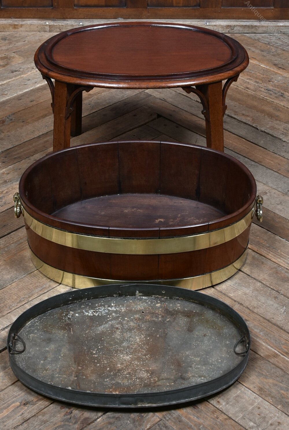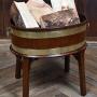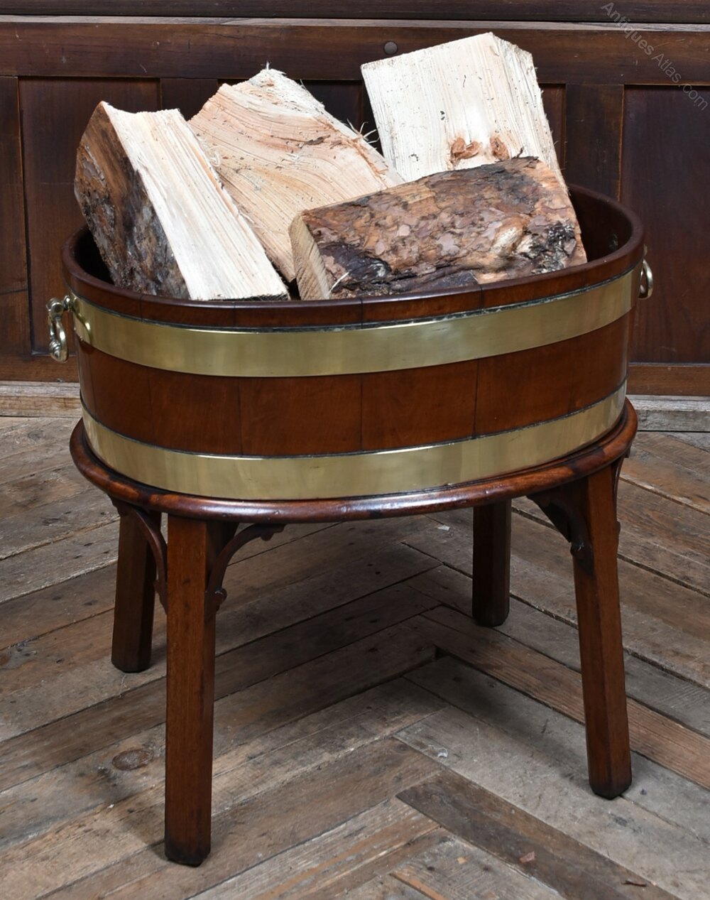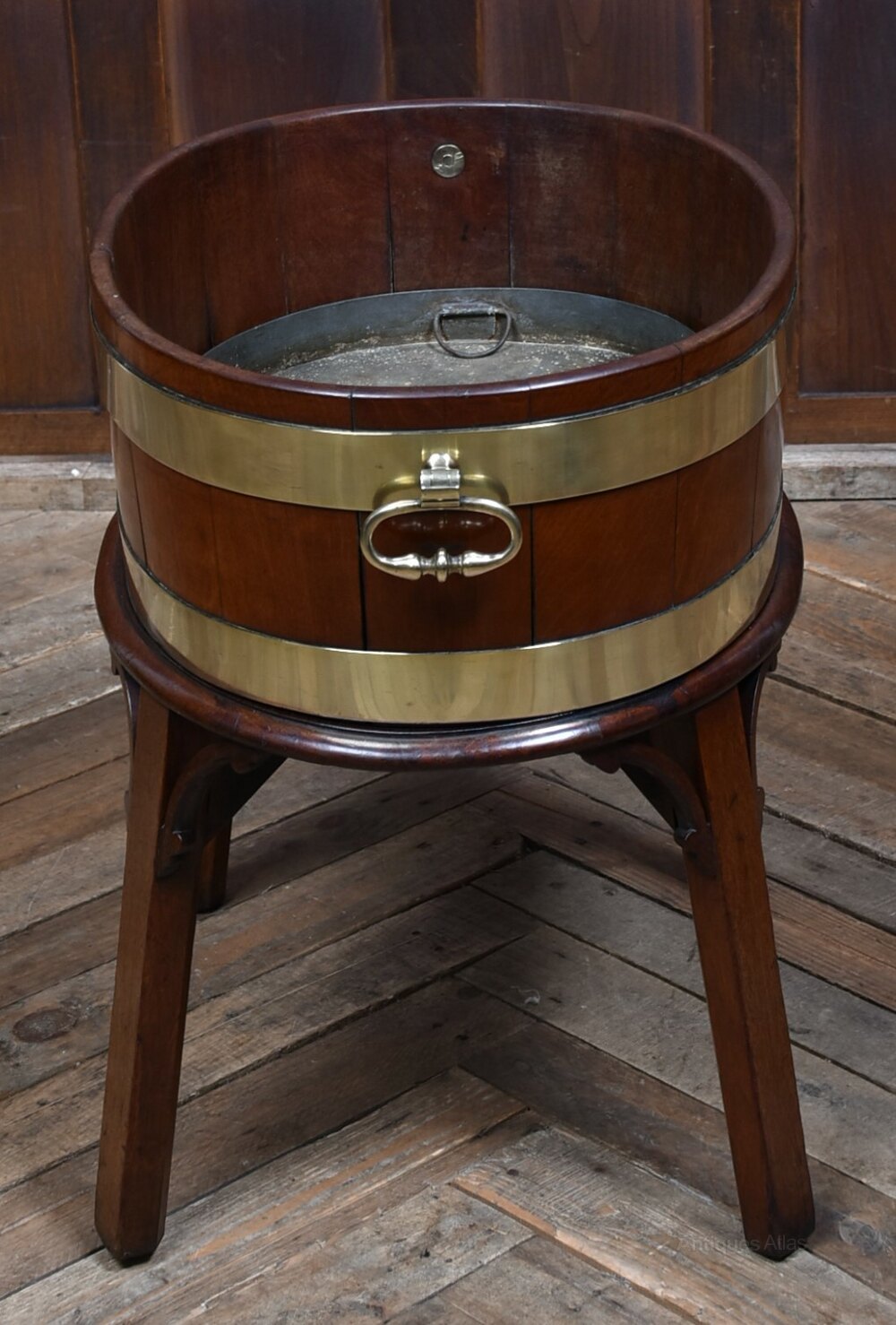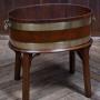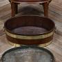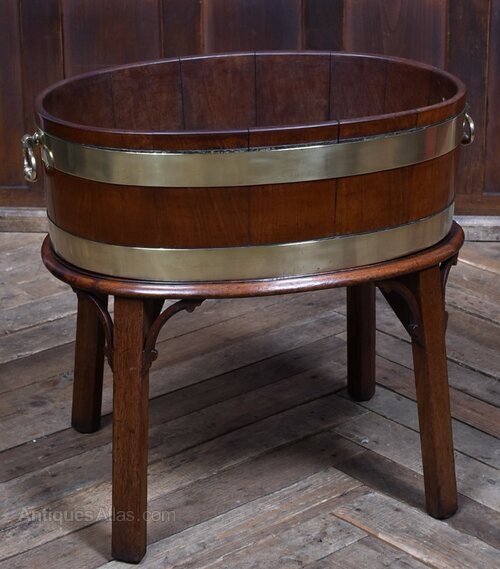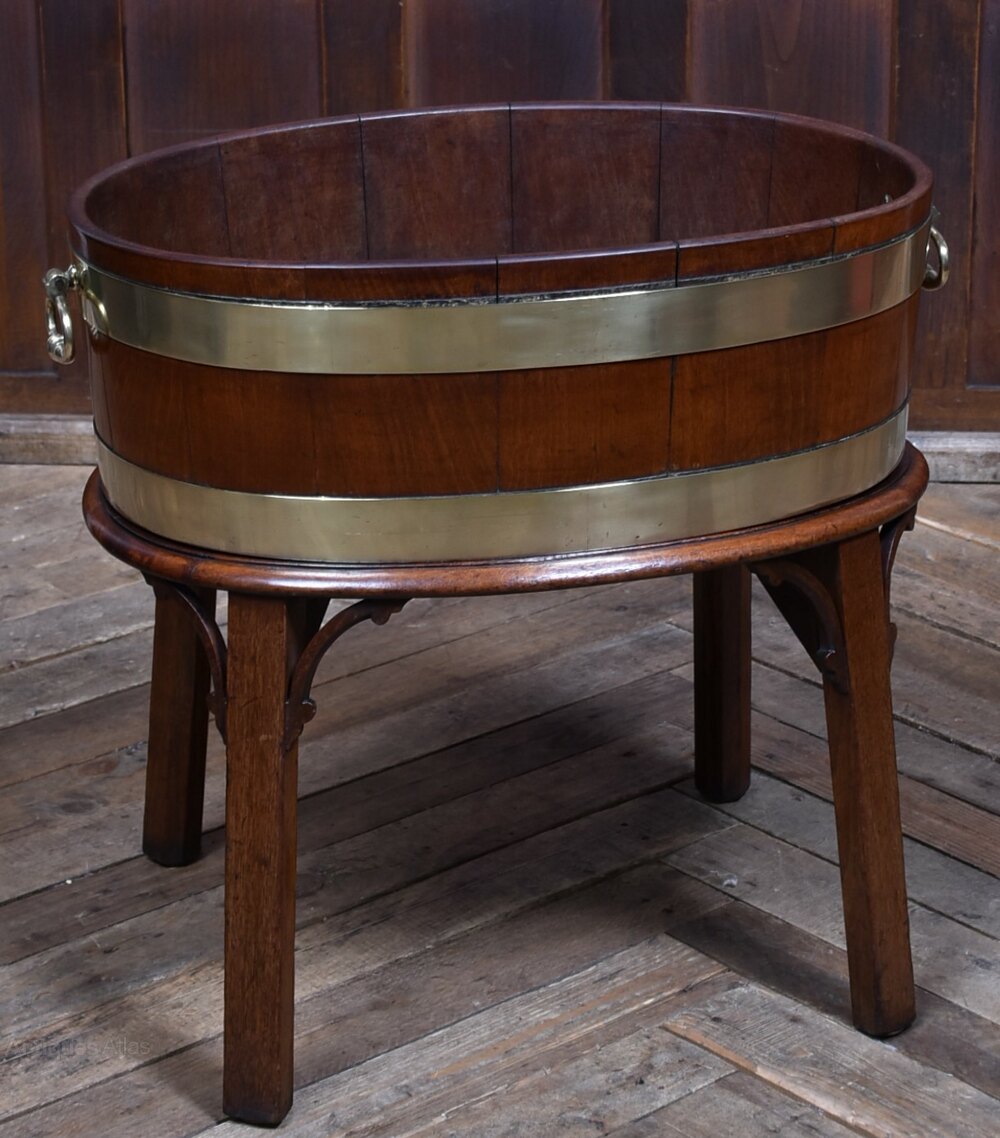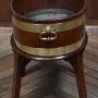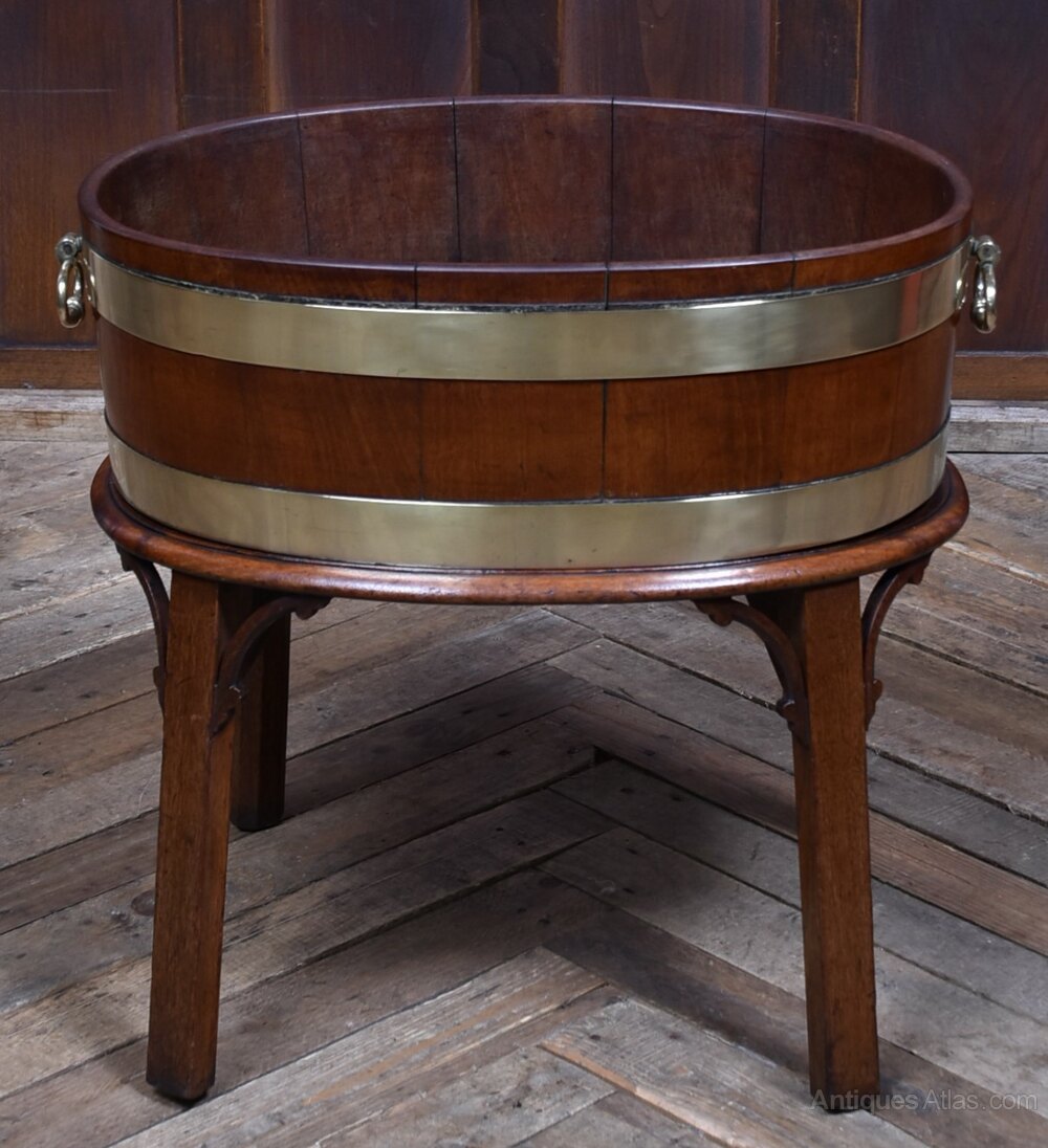 A handsome George III wine cooler, crafted in warm-toned mahogany and bound with twin brass bands. The cylindrical body is formed from rich mahogany panels and fitted with brass ring handles to either side, all raised on a square-leg stand with shaped brackets for added presence. A fine example of Georgian domestic furniture, it balances elegance with utility and retains a quietly dignified charm. Whether used as a planter, for storing firewood, or simply as a decorative accent, it brings a touch of period character to any interior.Internal Reference: SAI3988