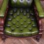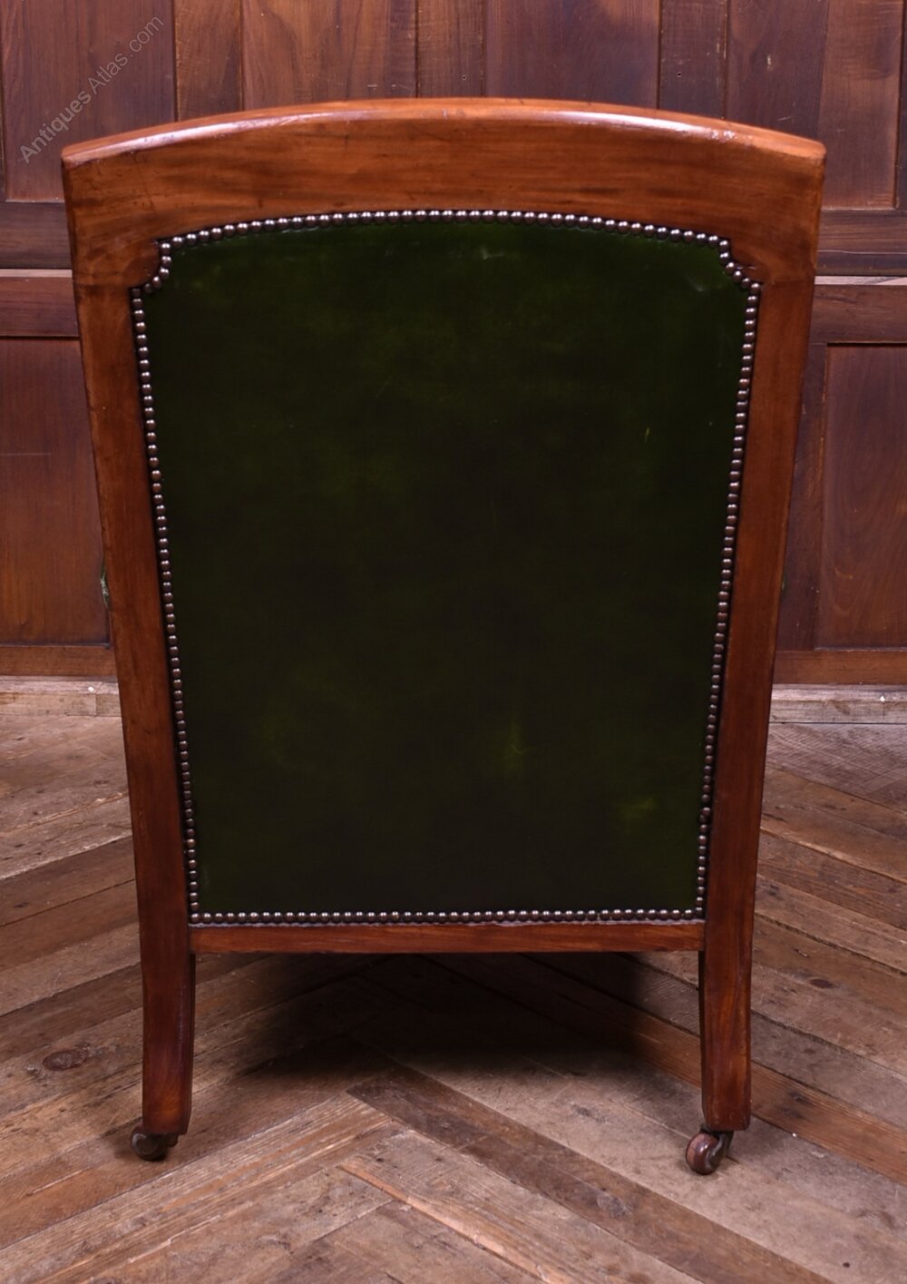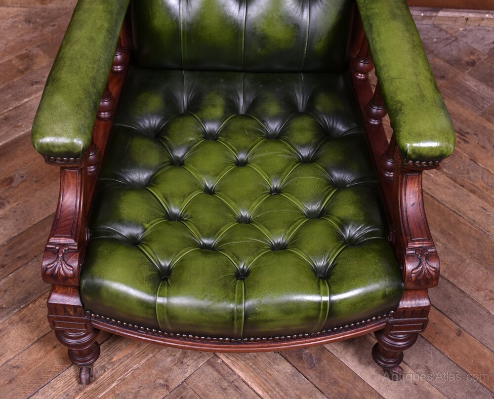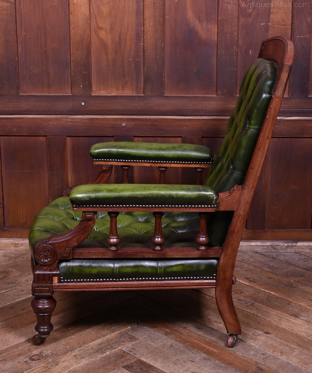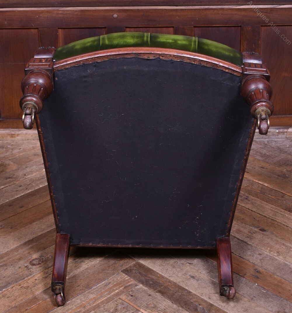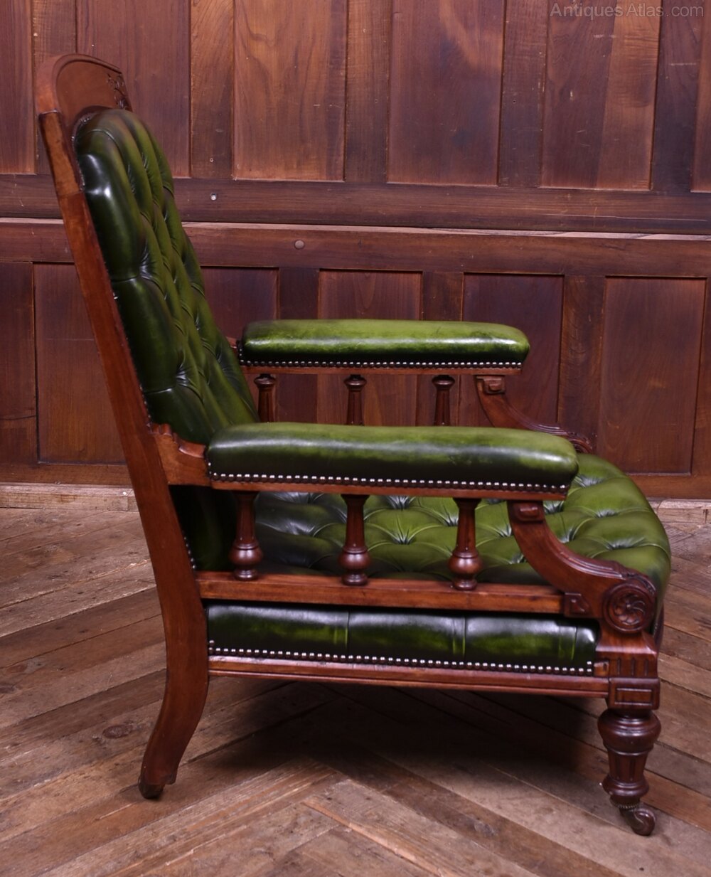 A handsome Victorian mahogany library chair of generous proportions, presented in excellent antique condition. Upholstered in rich deep-green leather across the back, seat, and armrests, it has a wonderfully inviting, club-room presence. The mahogany frame displays a warm, well-figured patina that complements the depth of the leather and accentuates the quality of the carving. Solid and sturdy with no creaks or wobbles. The leather-covered arms, finished with studded trim, are supported by finely turned spindles. It stands on turned front legs and splayed rear legs, all terminating in the original castors. Comfortable, characterful, and full of late-19th-century charm, this is an excellent example of Victorian craftsmanship, perfect for a study, library, or reading corner.Internal Reference: SAI4044