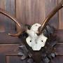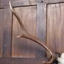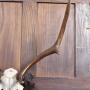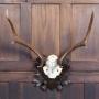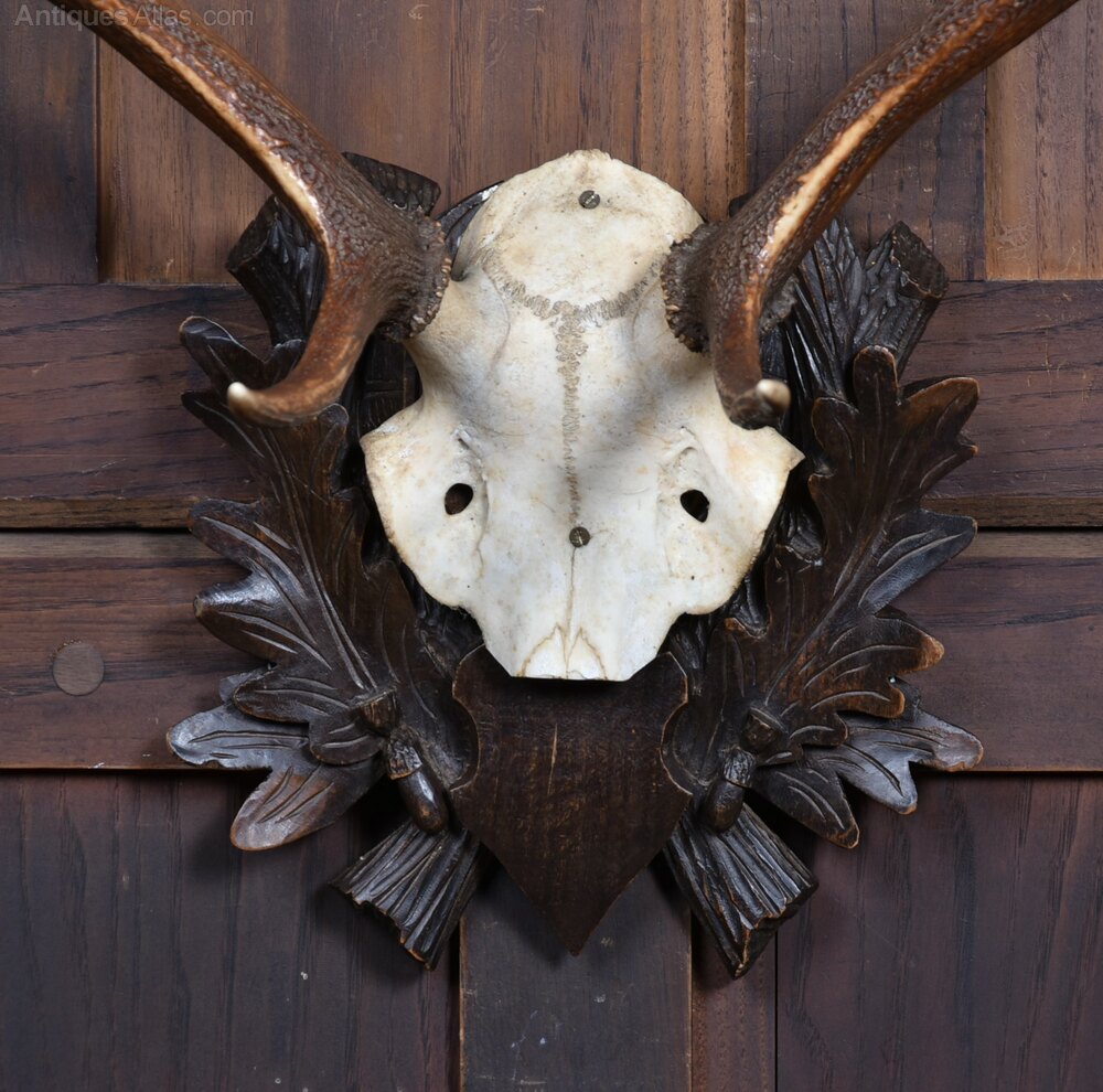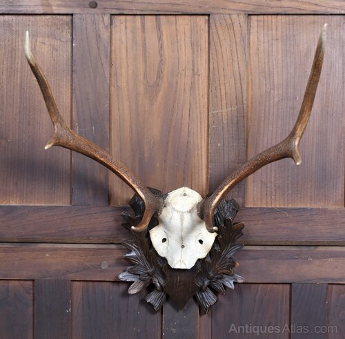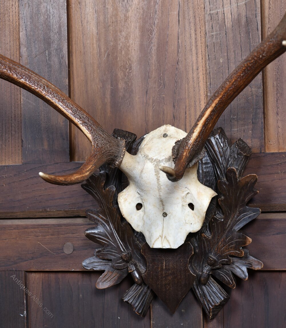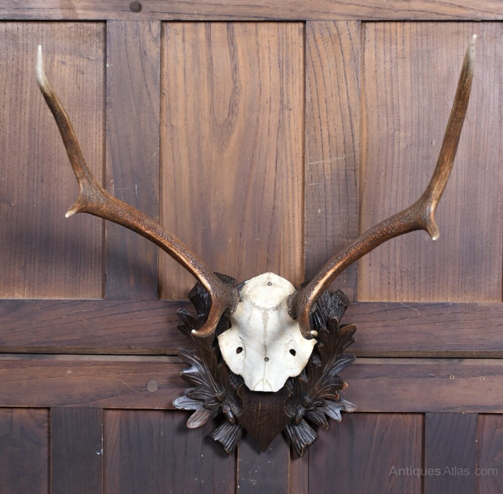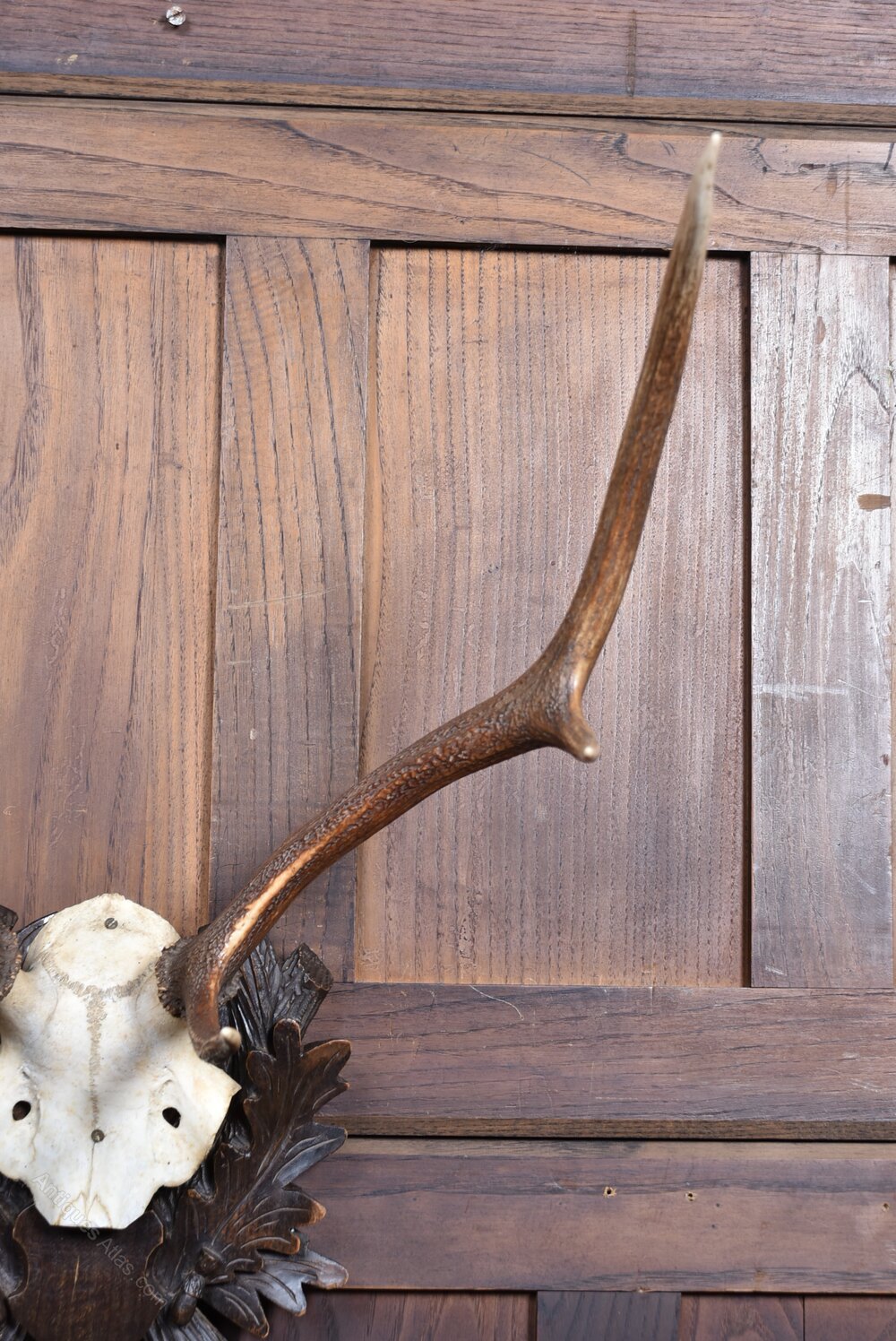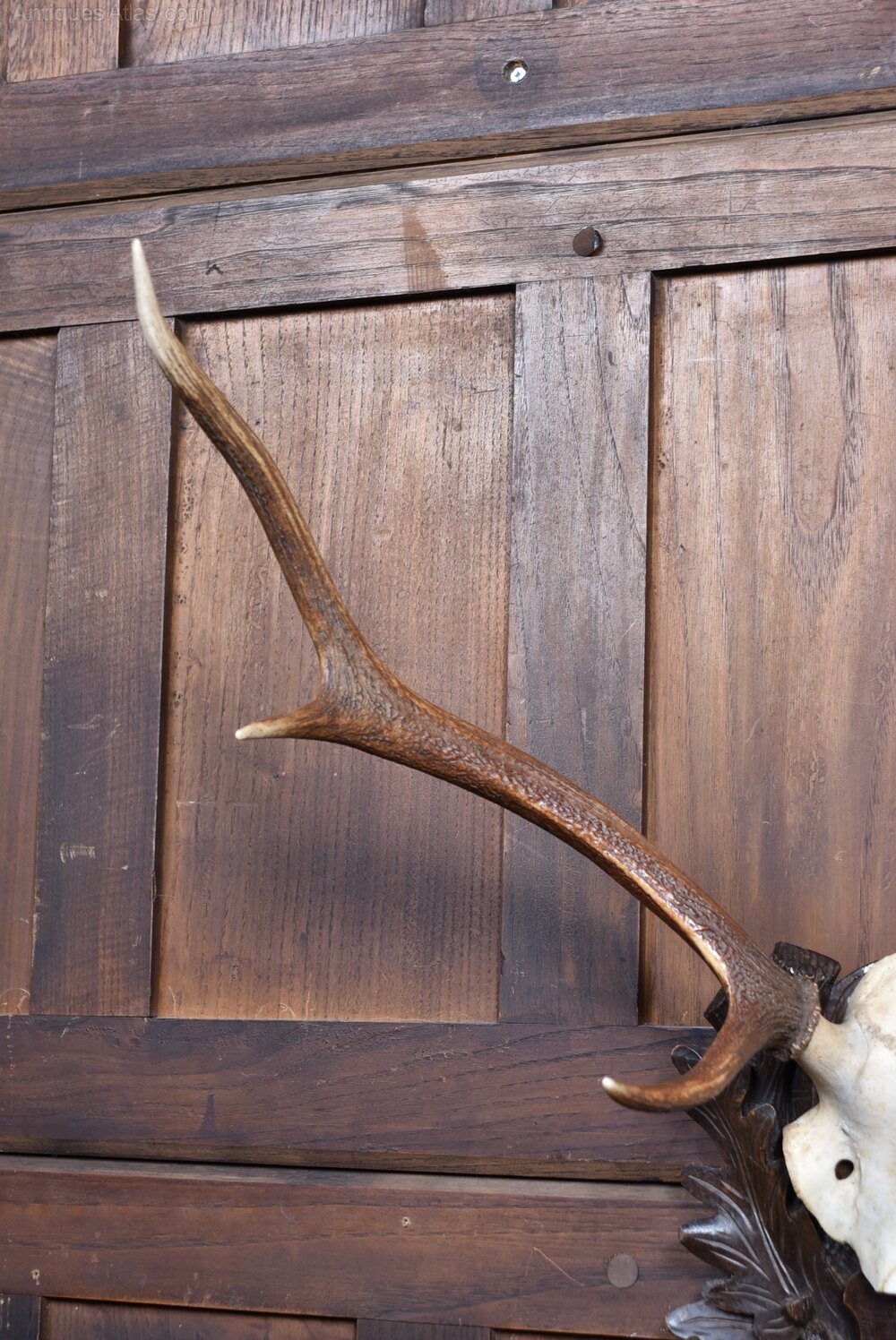 A handsome set of six-point antlers mounted on an intricately carved wooden plaque. The antlers have a strong, symmetrical form, and the mount features detailed foliate carving that adds a decorative, traditional touch. A striking piece of wall décor, ideal for a country house, lodge, or rustic interior.Internal Reference: SAI4059