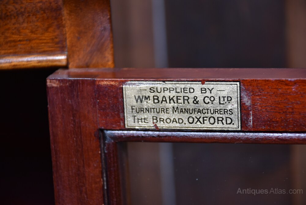A handsome pair of Edwardian mahogany sectional barrister bookcases by Wm Baker & Co Ltd, Oxford. Each bookcase is constructed in three graduated double door sections, allowing for easy transport. The mahogany has developed a rich, warm patina, complemented by the original glazed fronts with small brass knobs. The proportions balance elegance and practicality, delivering generous storage without losing their composed, architectural character. Both bookcases retain their original maker’s plaques for Wm Baker & Co Ltd, Furniture Manufacturers, The Broad, Oxford, confirming their quality and provenance. A versatile and impressive pair, ideal for libraries, studies, or retail display, and increasingly scarce to find in matching sets.Internal Reference: SAI3802