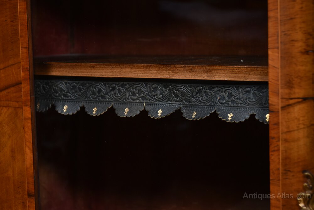 A superb Victorian walnut breakfront bookcase in excellent condition. The rich colouring, beautifully figured grain and an exceptional level of decorative craftsmanship. The bookcase is arranged in three glazed sections, the two outer compartments feature shelves edged with scalloped leather dust-covers, tooled with gilt floral motifs — a luxurious detail rarely seen and wonderfully preserved. The central door is adorned with fine marquetry inlay, Additional ormolu mounts enrich the corners and lower panels. Inside, the bookcase offers generous storage and display space, with clean, well-kept interiors. This is a striking statement bookcase, ready to bring warmth, refinement and history to any interior.Internal Reference: SAI4098
