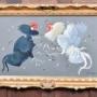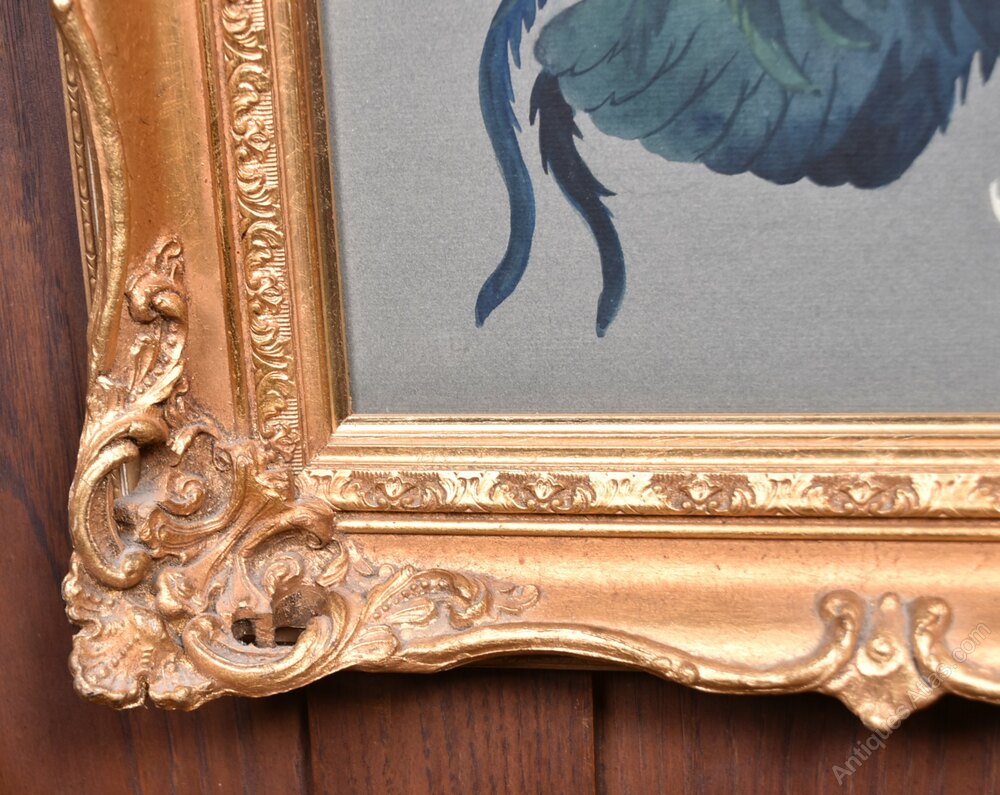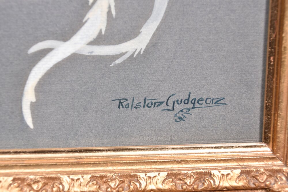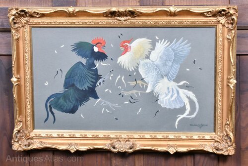 A striking watercolour by A.R.R. Ralston Gudgeon RSW, capturing the explosive energy of two cockerels mid‑fight, signed at the lower right. The birds twist and clash in mid‑air, feathers flying, their vivid plumage set against a soft, neutral ground that heightens the drama of the moment. Presented in a decorative gilt frame, it’s a dynamic and eye‑catching piece that brings instant impact to any wall.A.R.R. Ralston Gudgeon RSW (1910–1984) was a Scottish wildlife artist celebrated for his lively, finely observed watercolours of birds and rural animals. Trained at Glasgow School of Art and elected to the Royal Scottish Society of Painters in Watercolour.