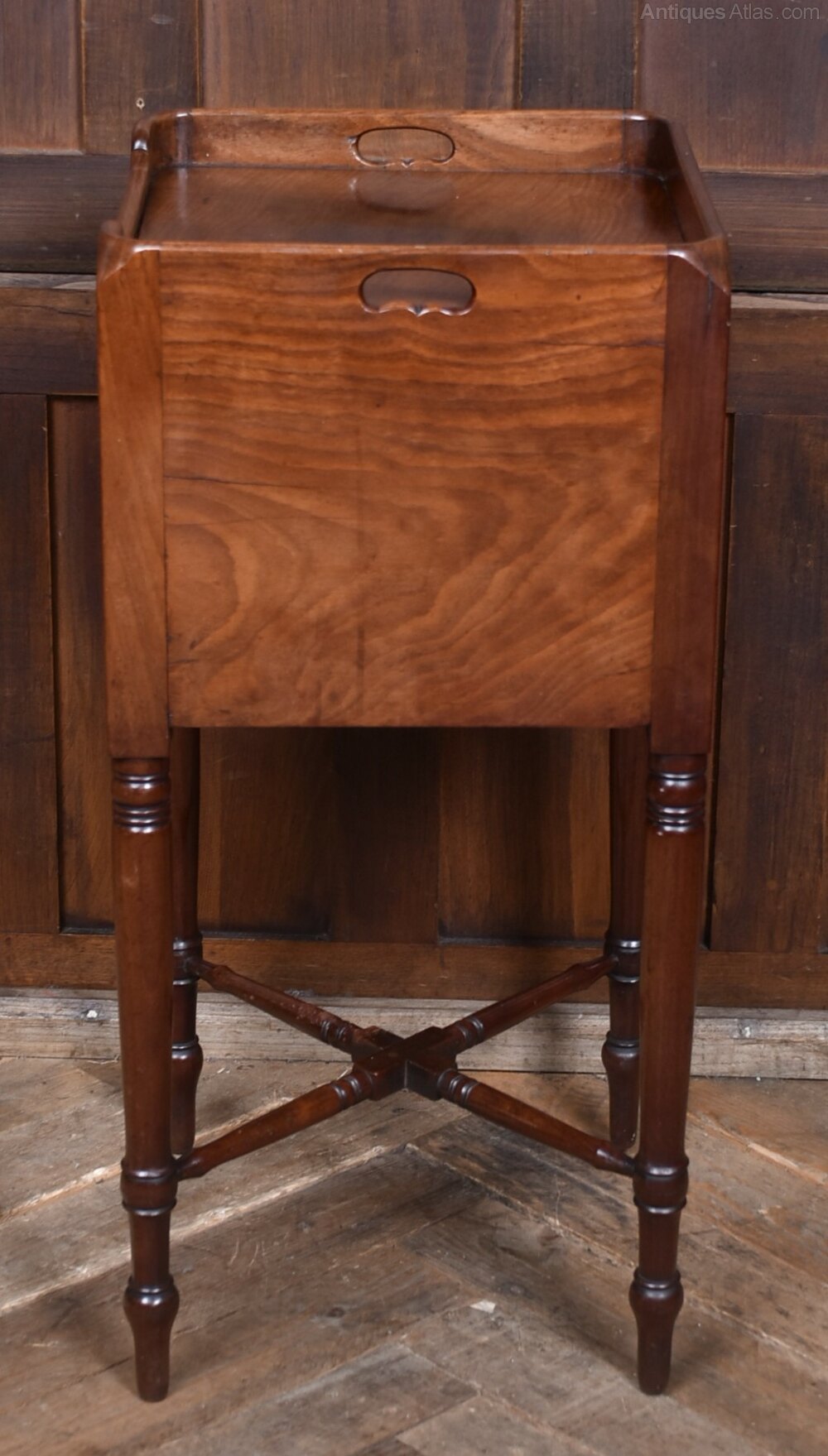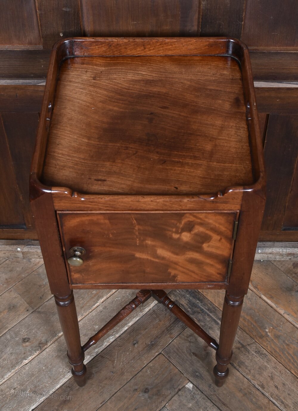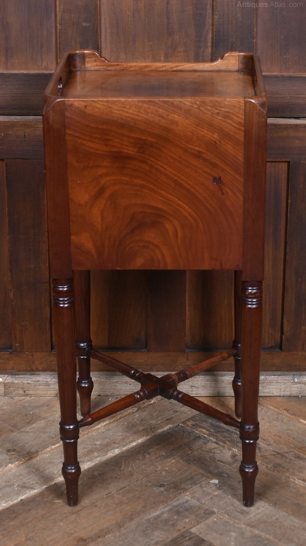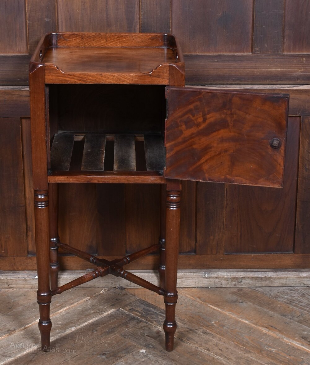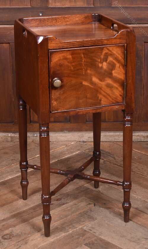 A charming 19th‑century mahogany pot cupboard, neatly proportioned and full of period character. The raised gallery top features shaped side handles, giving the piece a light, portable feel, while the single cupboard door below provides practical enclosed storage. The cupboard stands on elegant turned supports, all united by an X‑shaped stretcher that adds both stability and decorative appeal. The mahogany has developed a warm, mellow patina over time, enhancing the simple, functional design typical of early Victorian furniture. Presented in excellent antique condition, it remains sturdy, well‑balanced and ready to place. A versatile and attractive little cupboard that works beautifully as a bedside or lamp table in both traditional and contemporary interiors.Internal Reference: SAI4141